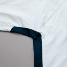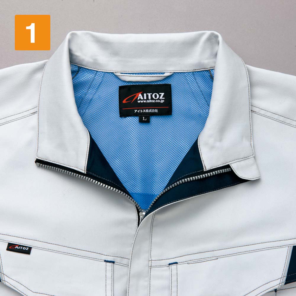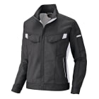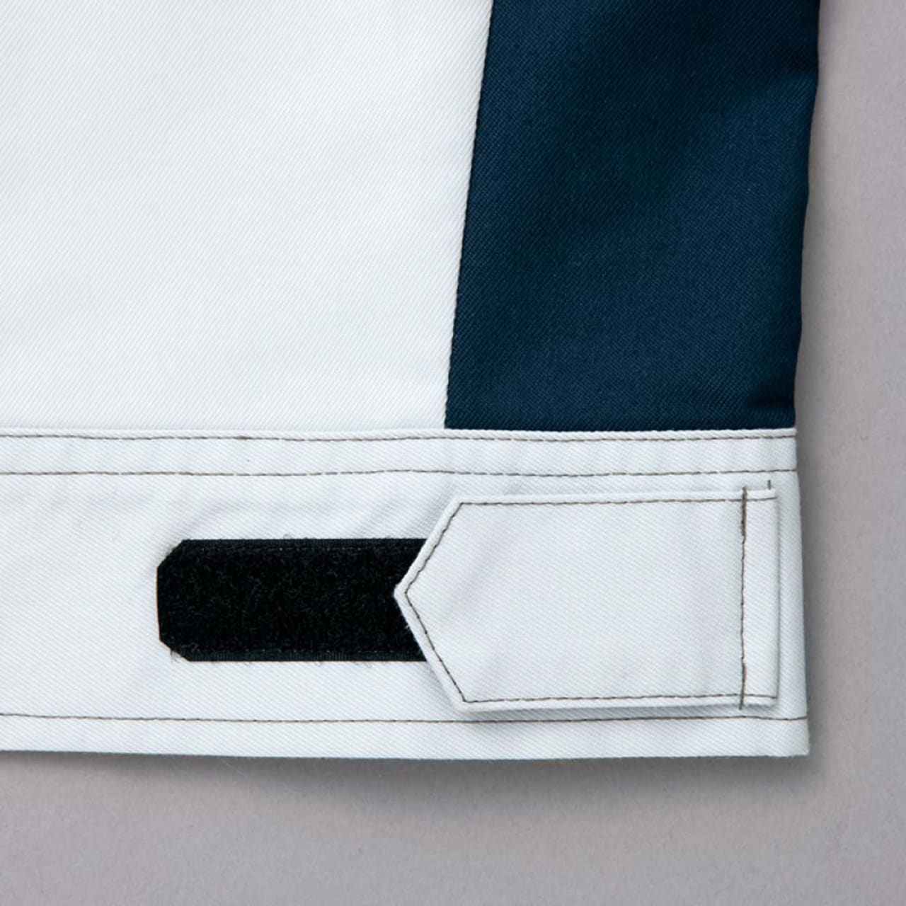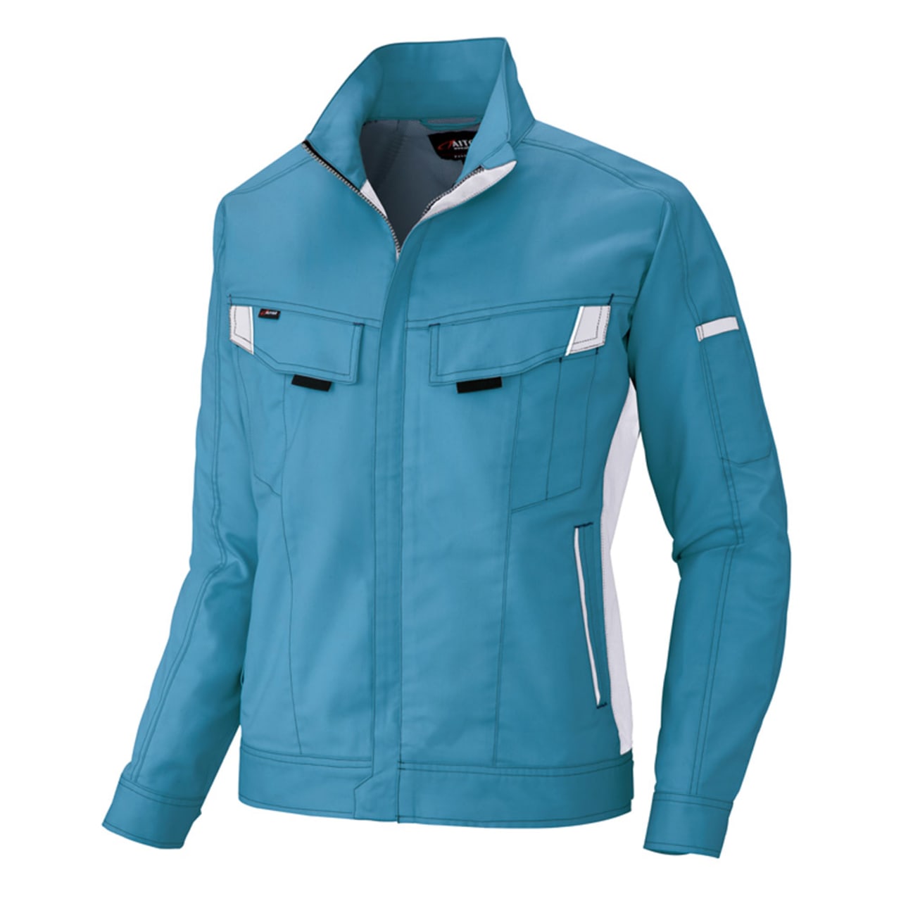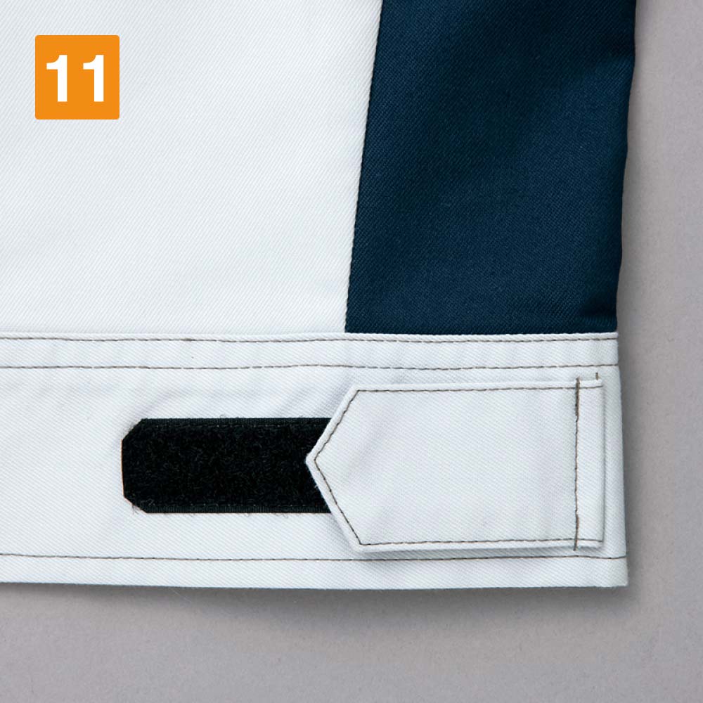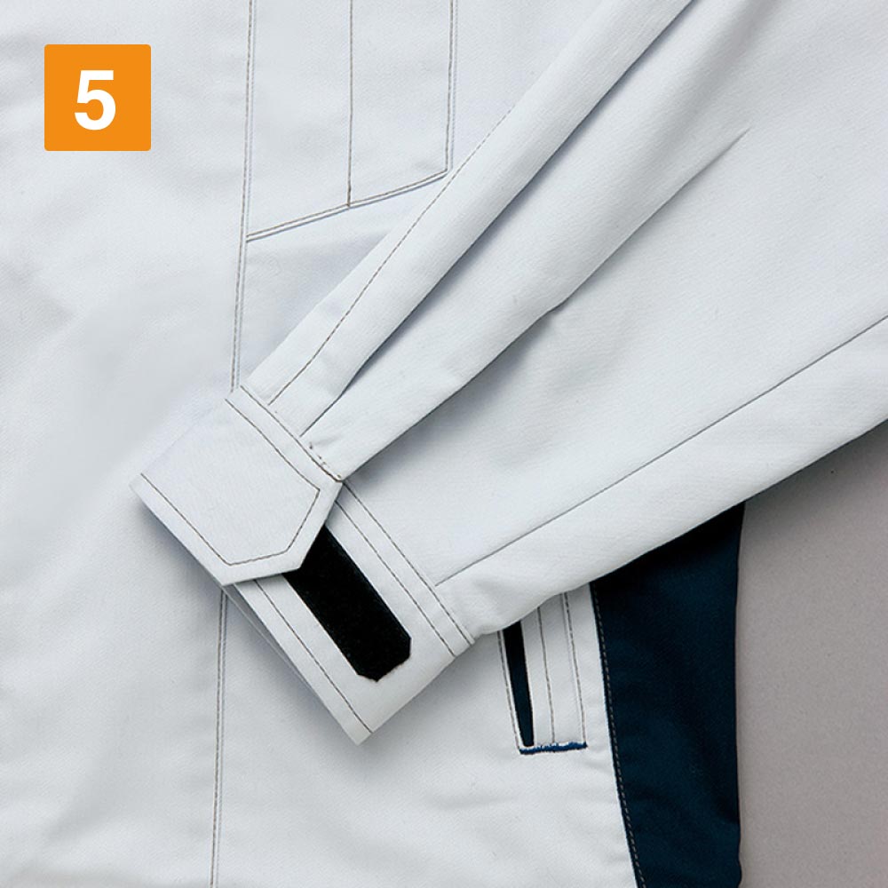バンジーテックの収縮性のある生地と、ムービンカットの立体裁断により、上半身の動きやすさに対応したジャケットです。肩や腕を大きく動かす際でも、ストレスを軽減できます。ムービンカットの立体裁断は、前身頃のウエストがシェイプされた形で、後身頃や肩回りに余裕を持たせています。肩や腕を大きく前に動かす際や、腕を高く上げる際でもストレッチ生地で運動性能がアップします。ブルゾンは作業がしやすいショート丈で、ウエストのアジャスターで調節が可能です。背中についている反射パイピングによって、暗い場所でも作業員の安全性を確保できます。