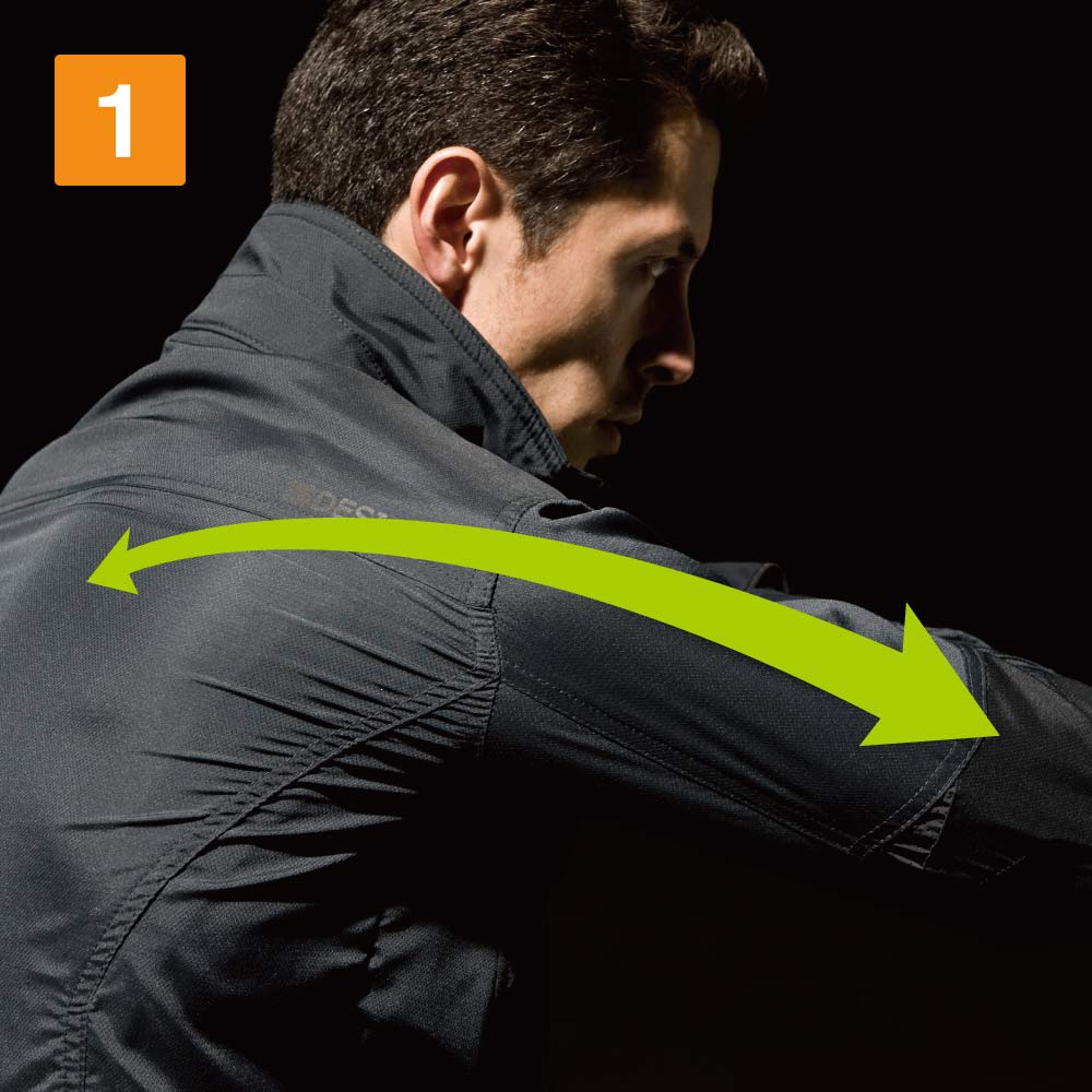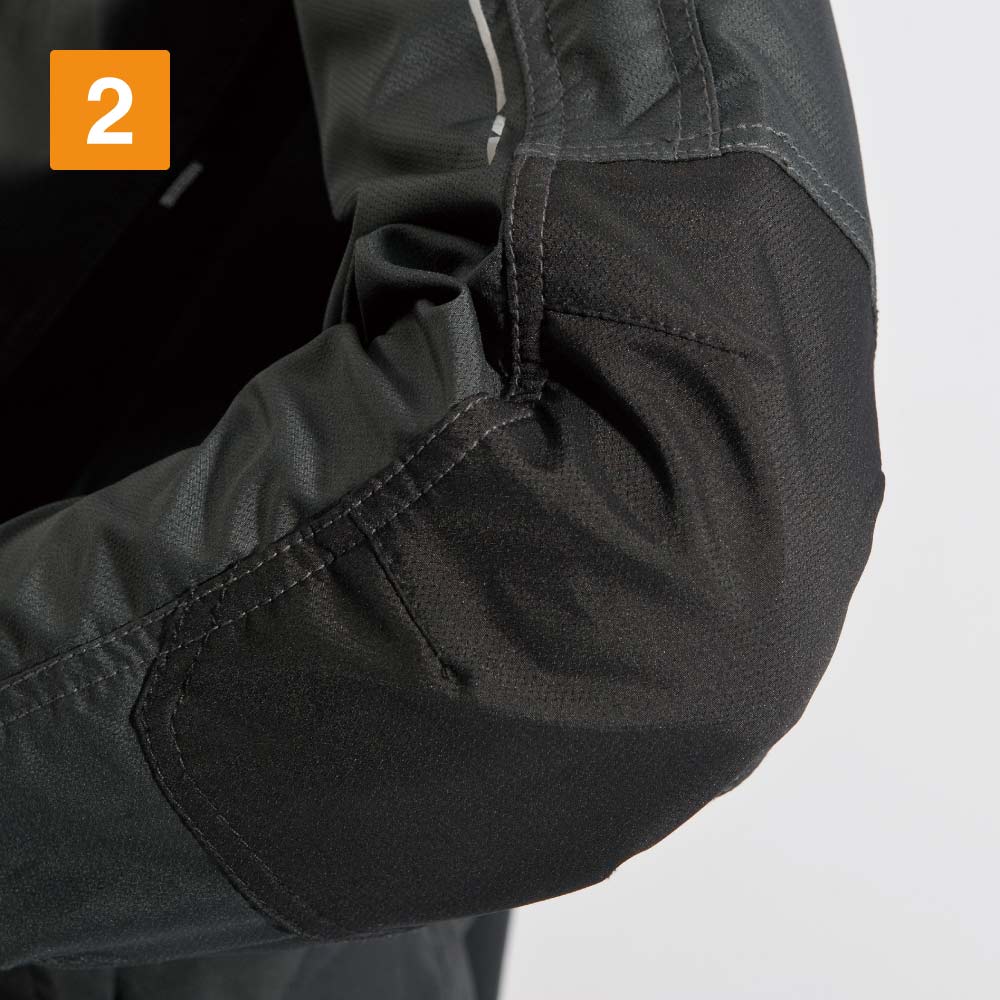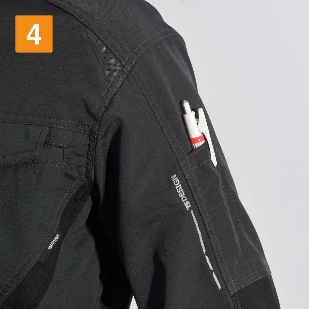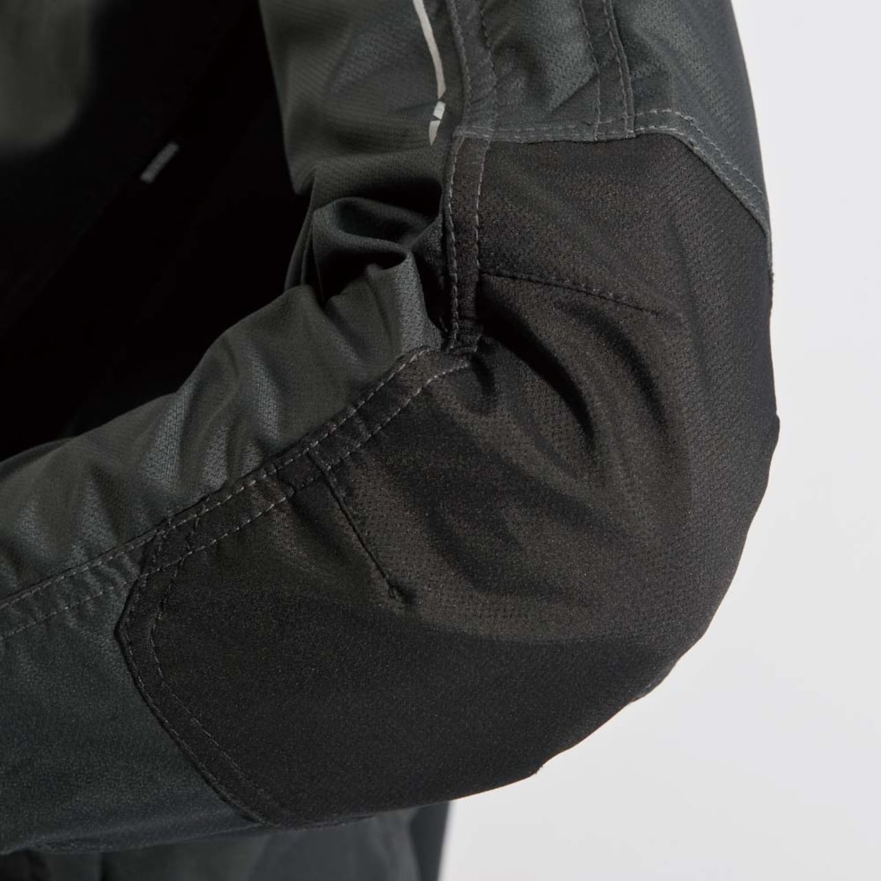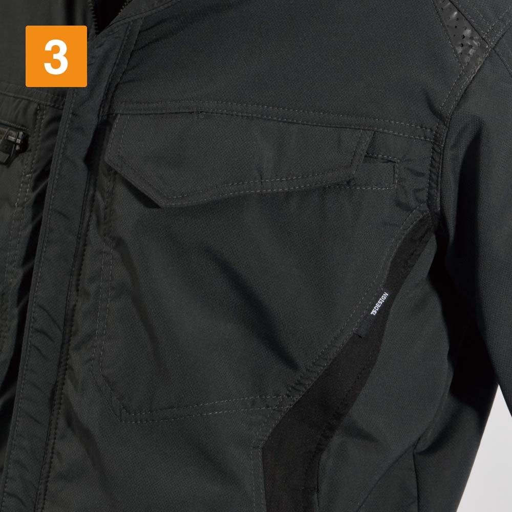 ストレッチタフワークジャケットは、横・斜めへの伸縮があり、動きやすく、ストレッチ性に優れたストレッチタフ素材を使用しています。Lサイズで平均重量が400gと、ジャケットとは思えない軽さでアクティブな動きの邪魔になりません。肘あては二重使いと耐久性にこだわったデザインで作られています。両胸・左袖の取り出しやすい位置にはポケットもあり、ペンなどのアイテムを収納することも可能です。FLASH POINTとして、肩のメッシュ部分やロゴなど、ジャケットの各所に反射素材を採用。暗い場所でも安心して作業することができます。ユニセックス仕様で、男女問わずスタイリッシュに着こなすことができるオススメのワークジャケットです