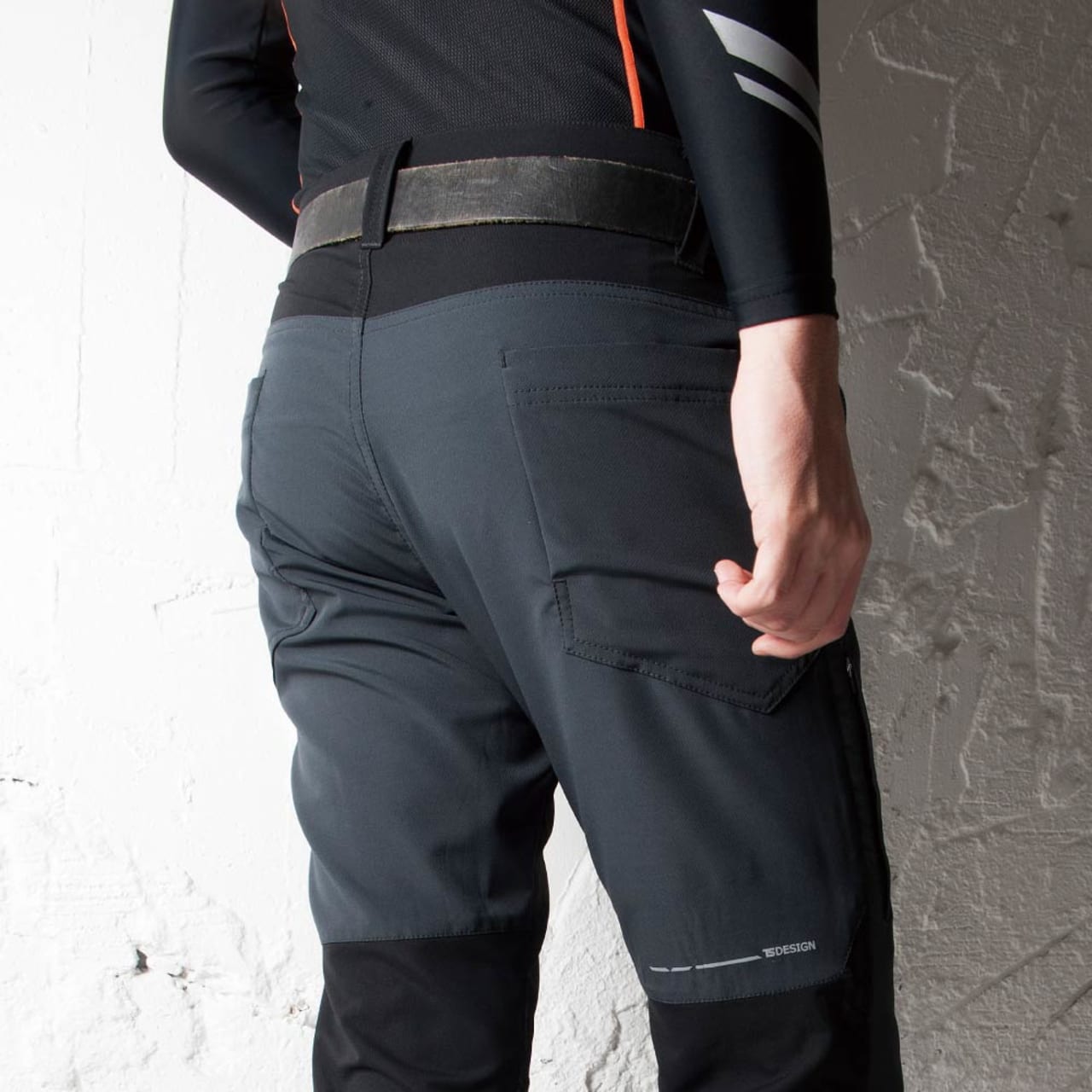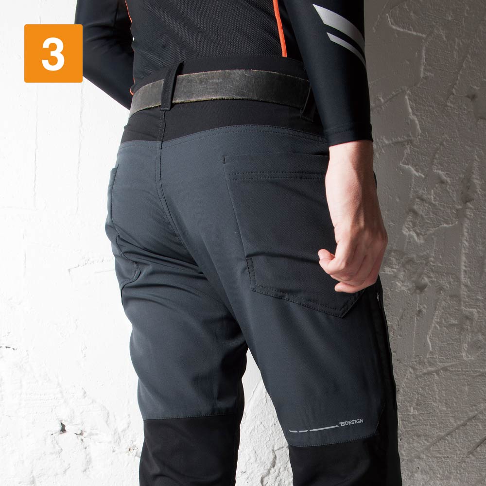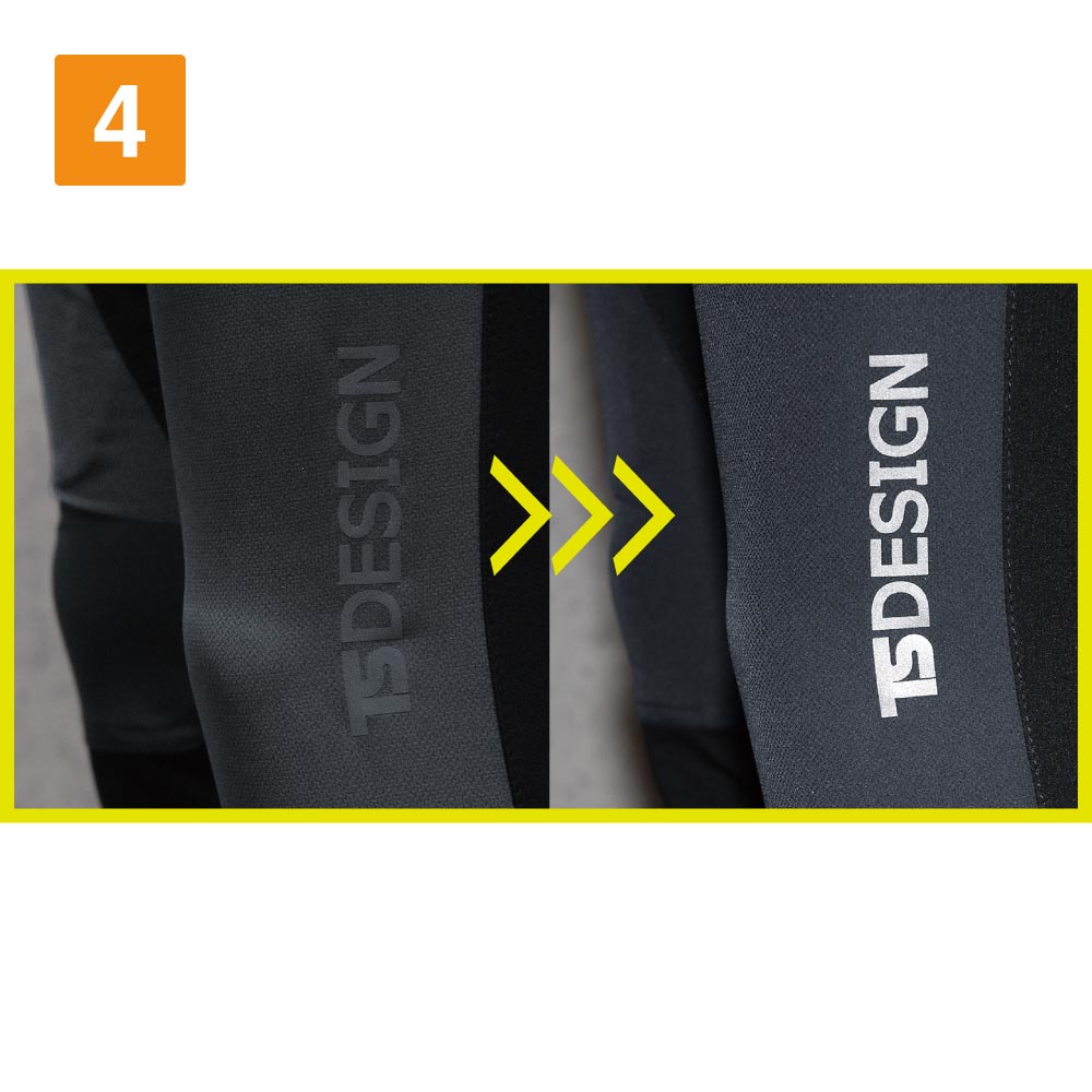- カラーはブラック×チャコールグレーとブラック×ブラックの全2色。ブラック×チャコールグレーはウエスト・股下・後ろの裾部分がブラックとなっていてバイカラーデザインのウエアとなっています。また、左裾と右後ろの太ももの反射プリントの「TS DESIGN」のロゴは光ると白く際立ちワンポントになっています。