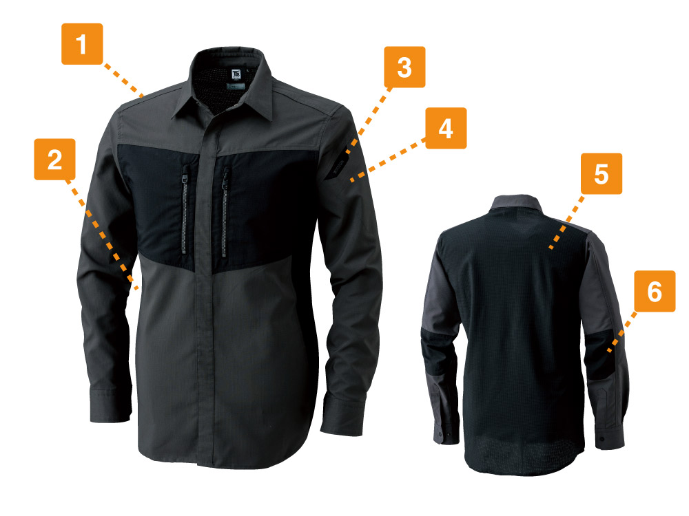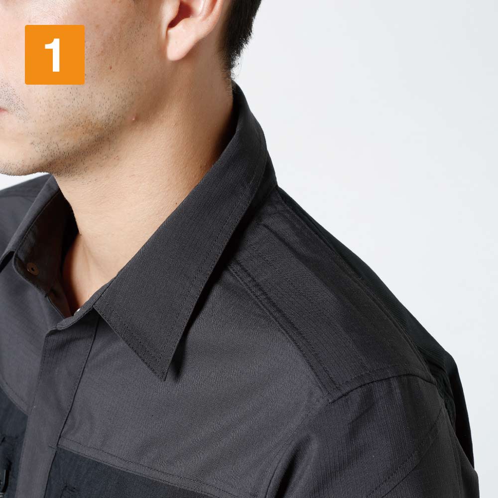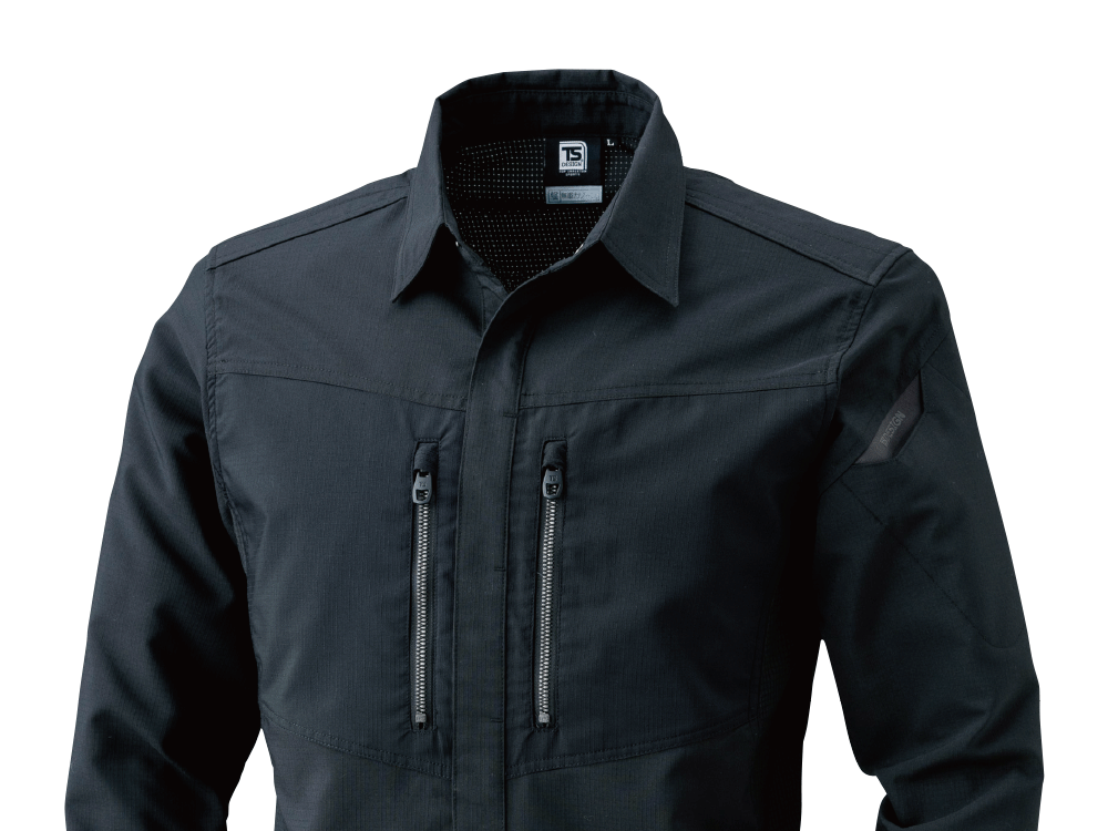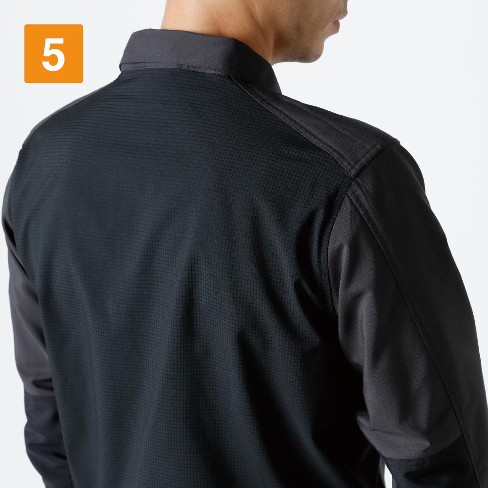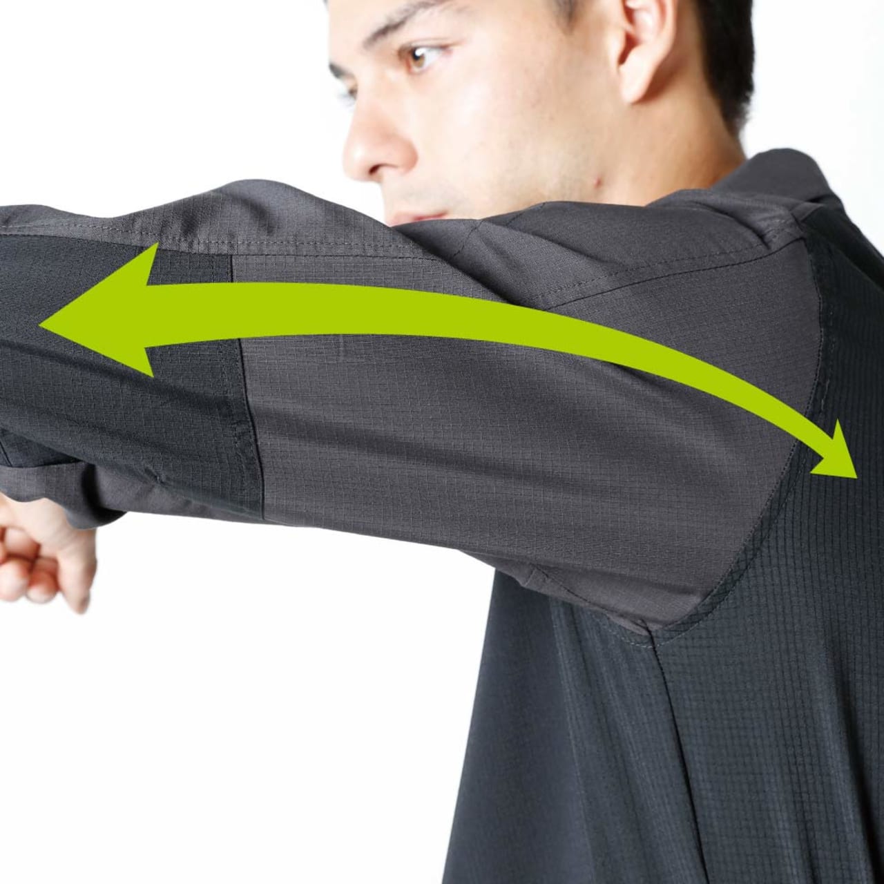 東レが独自の加工技術で開発した高通気素材のストレッチエアーと高強度素材のストロングリップを組み合わせ、高通気性+高ストレッチ性を実現。背中部分は通気孔を発現させたストレッチエアーなので蒸し暑い場所でもべたつかずサラリとした着心地です。動きの大きな肩まわりは自然に伸縮し、どんな作業も邪魔しません。両肩や肘部分はしっかり補強され耐久性も十分です。速乾生地で乾きも早く、形態安定性もあるため、自宅で洗濯しても型崩れしません。