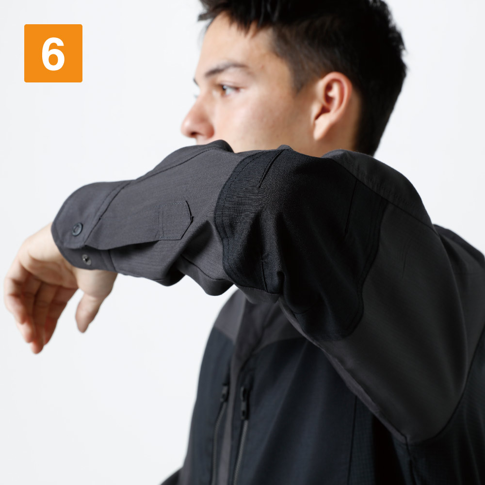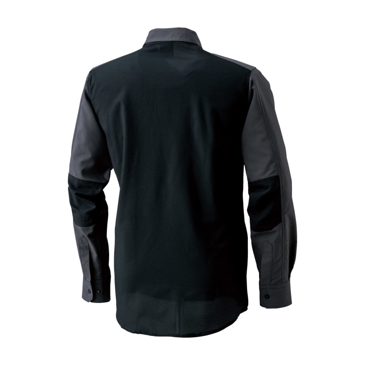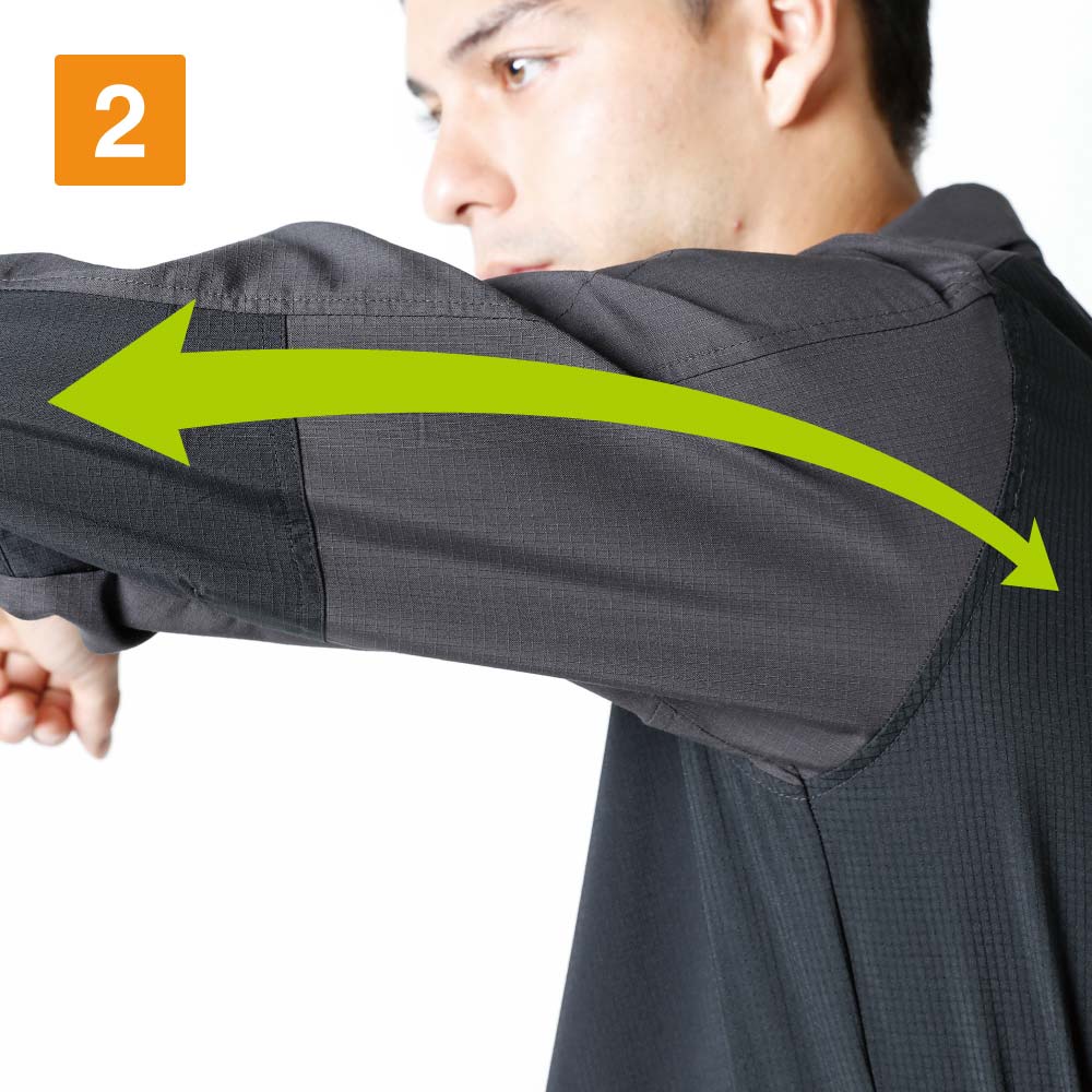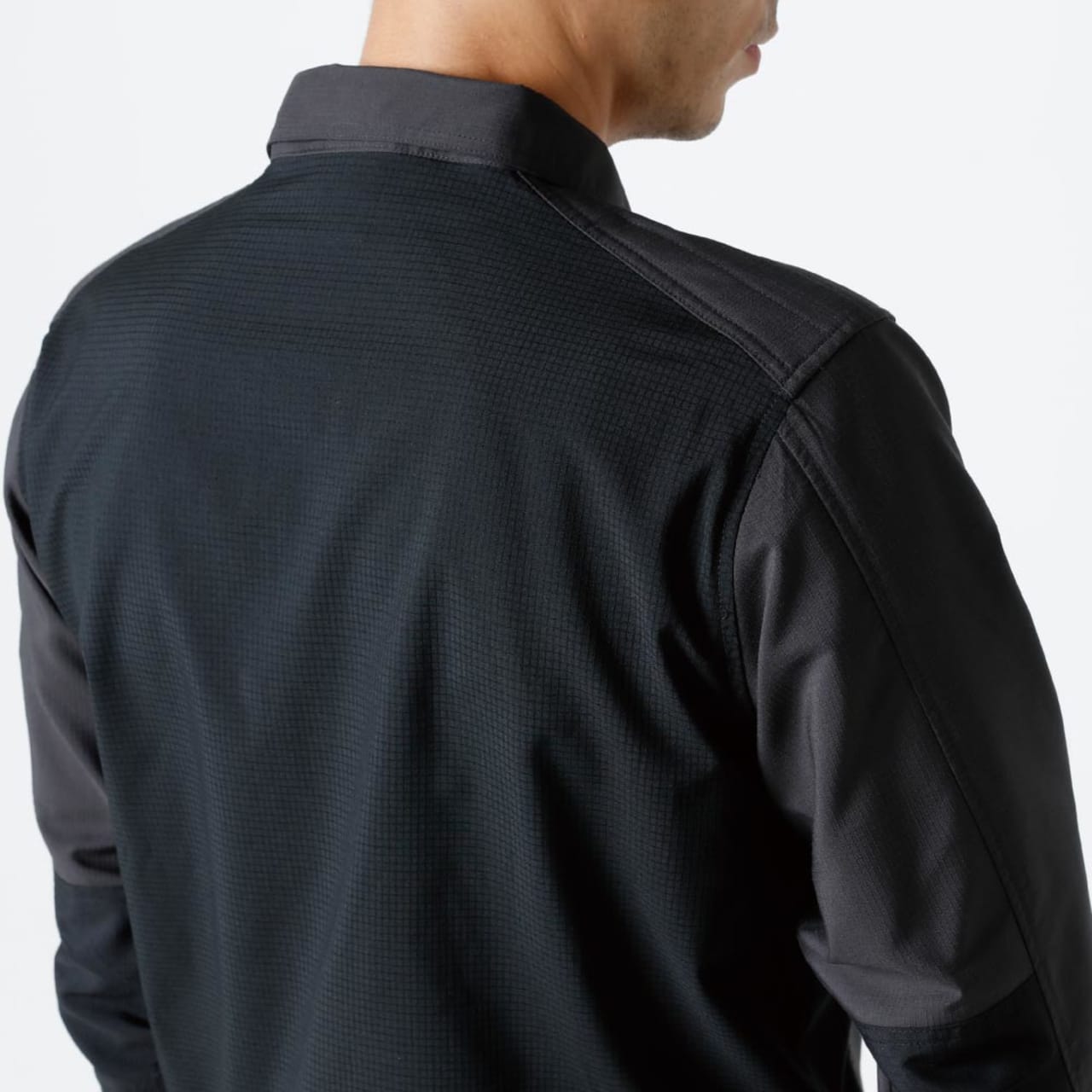 東レが独自の加工技術で開発した高通気素材のストレッチエアーと高強度素材のストロングリップを組み合わせ、高通気性+高ストレッチ性を実現。背中部分は通気孔を発現させたストレッチエアーなので蒸し暑い場所でもべたつかずサラリとした着心地です。動きの大きな肩まわりは自然に伸縮し、どんな作業も邪魔しません。両肩や肘部分はしっかり補強され耐久性も十分です。速乾生地で乾きも早く、形態安定性もあるため、自宅で洗濯しても型崩れしません。