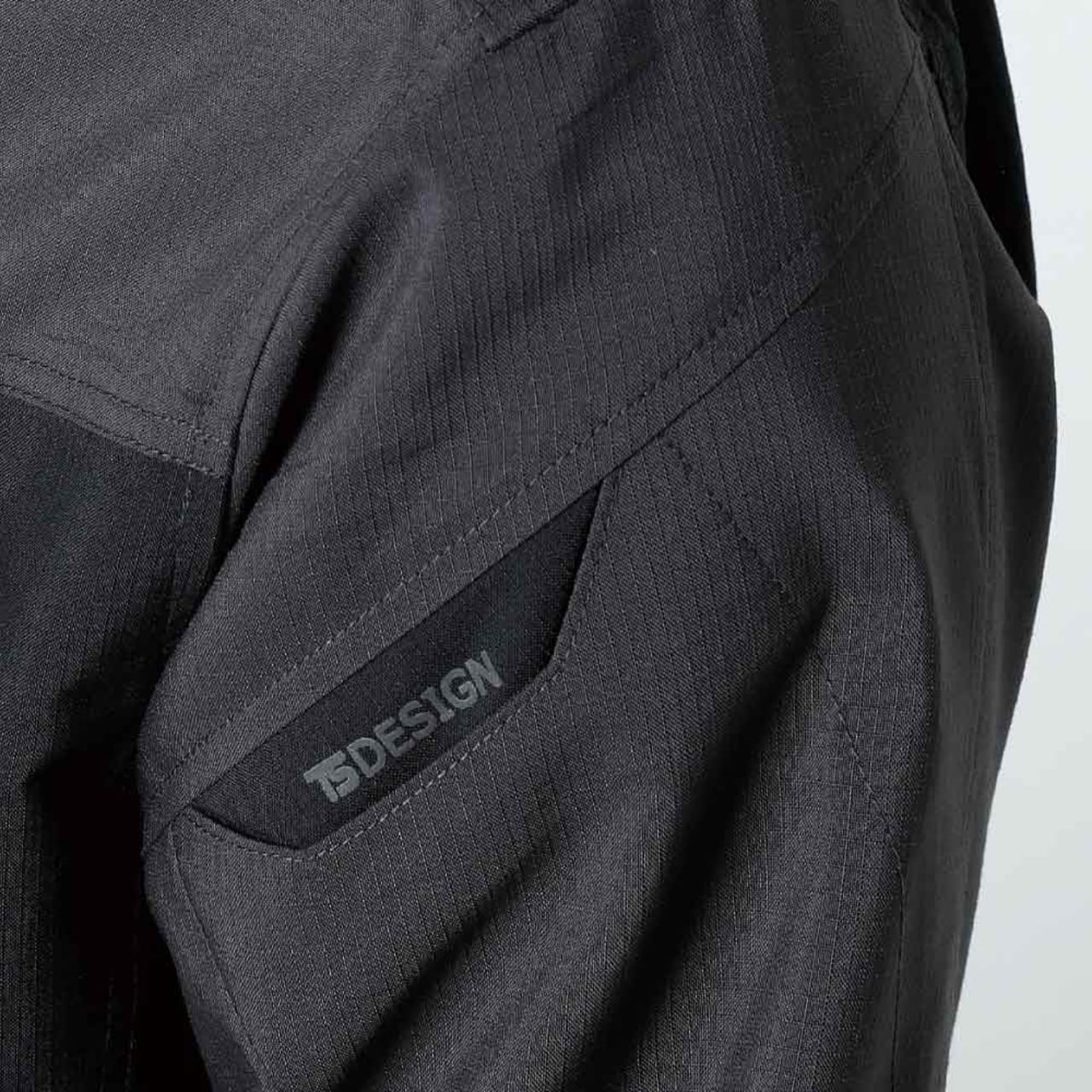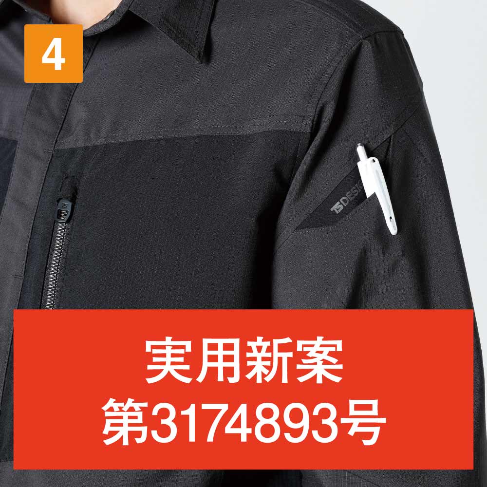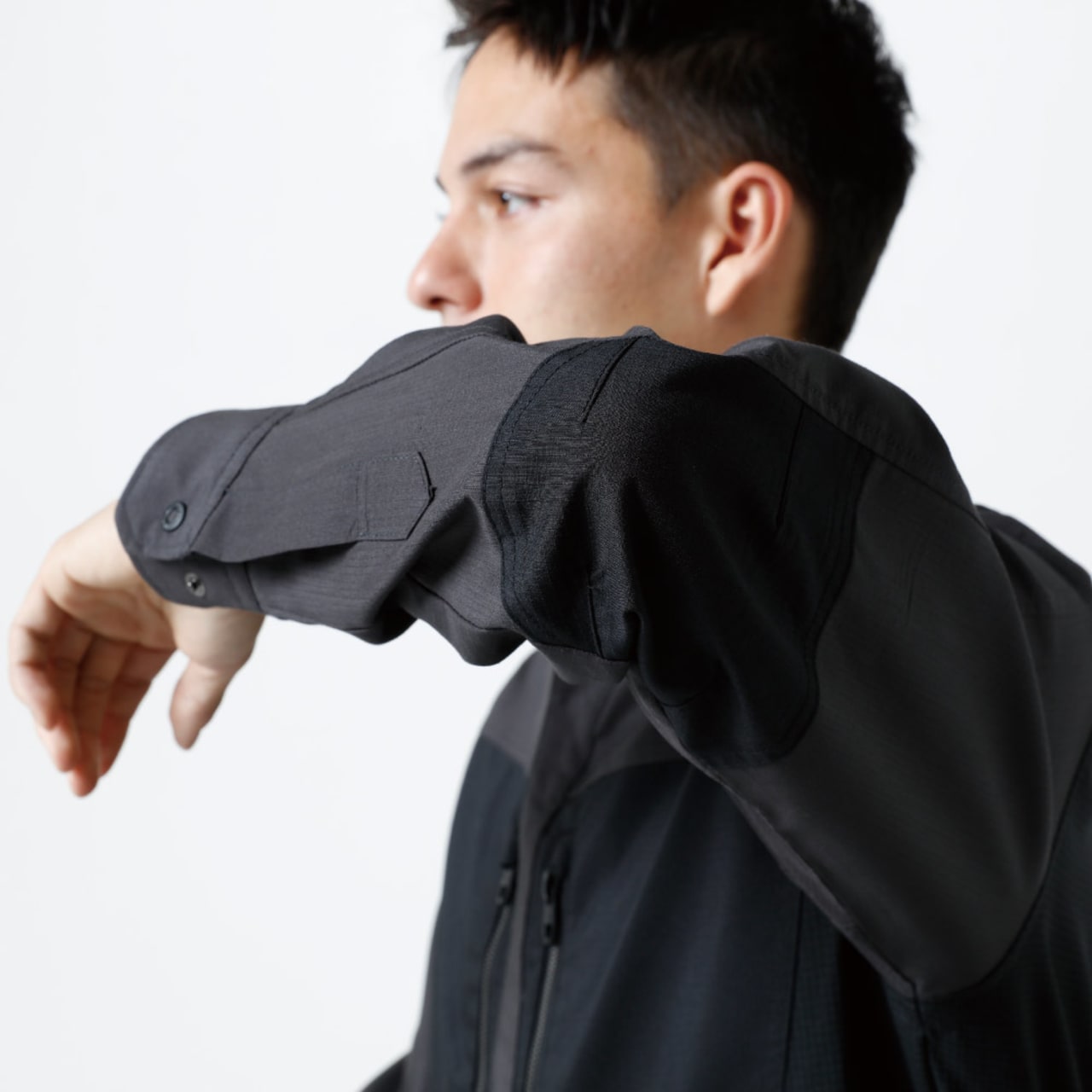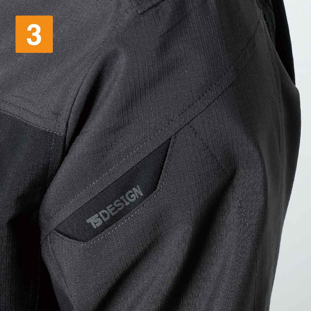 東レが独自の加工技術で開発した高通気素材のストレッチエアーと高強度素材のストロングリップを組み合わせ、高通気性+高ストレッチ性を実現。背中部分は通気孔を発現させたストレッチエアーなので蒸し暑い場所でもべたつかずサラリとした着心地です。動きの大きな肩まわりは自然に伸縮し、どんな作業も邪魔しません。両肩や肘部分はしっかり補強され耐久性も十分です。速乾生地で乾きも早く、形態安定性もあるため、自宅で洗濯しても型崩れしません。