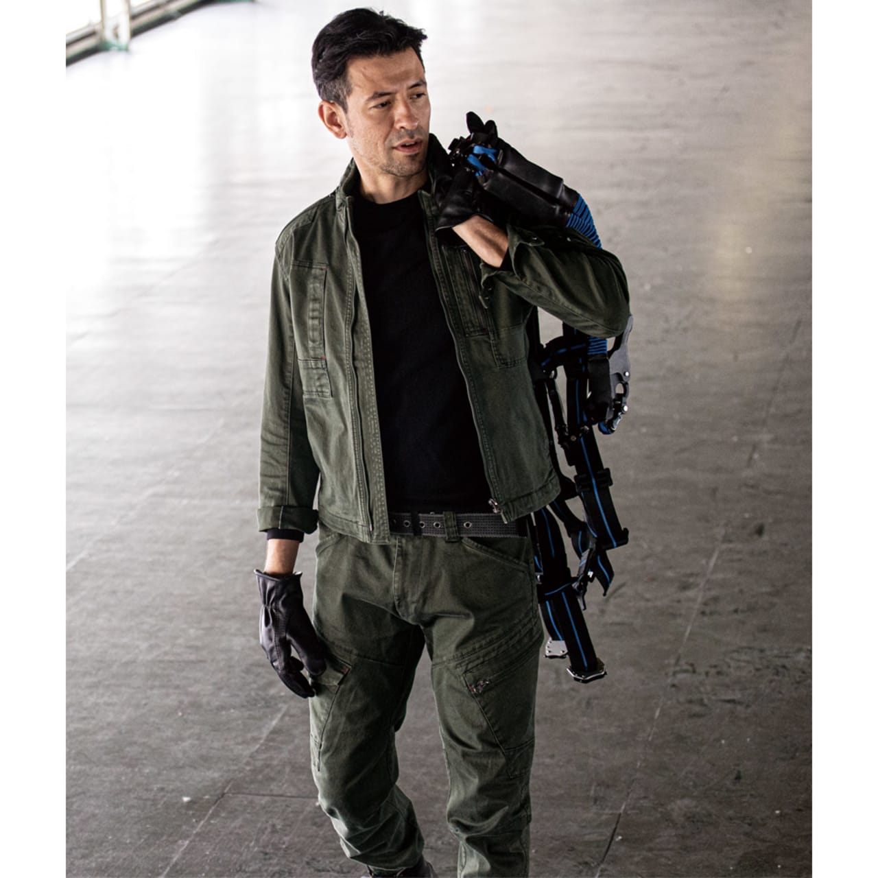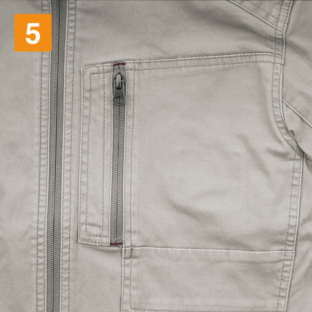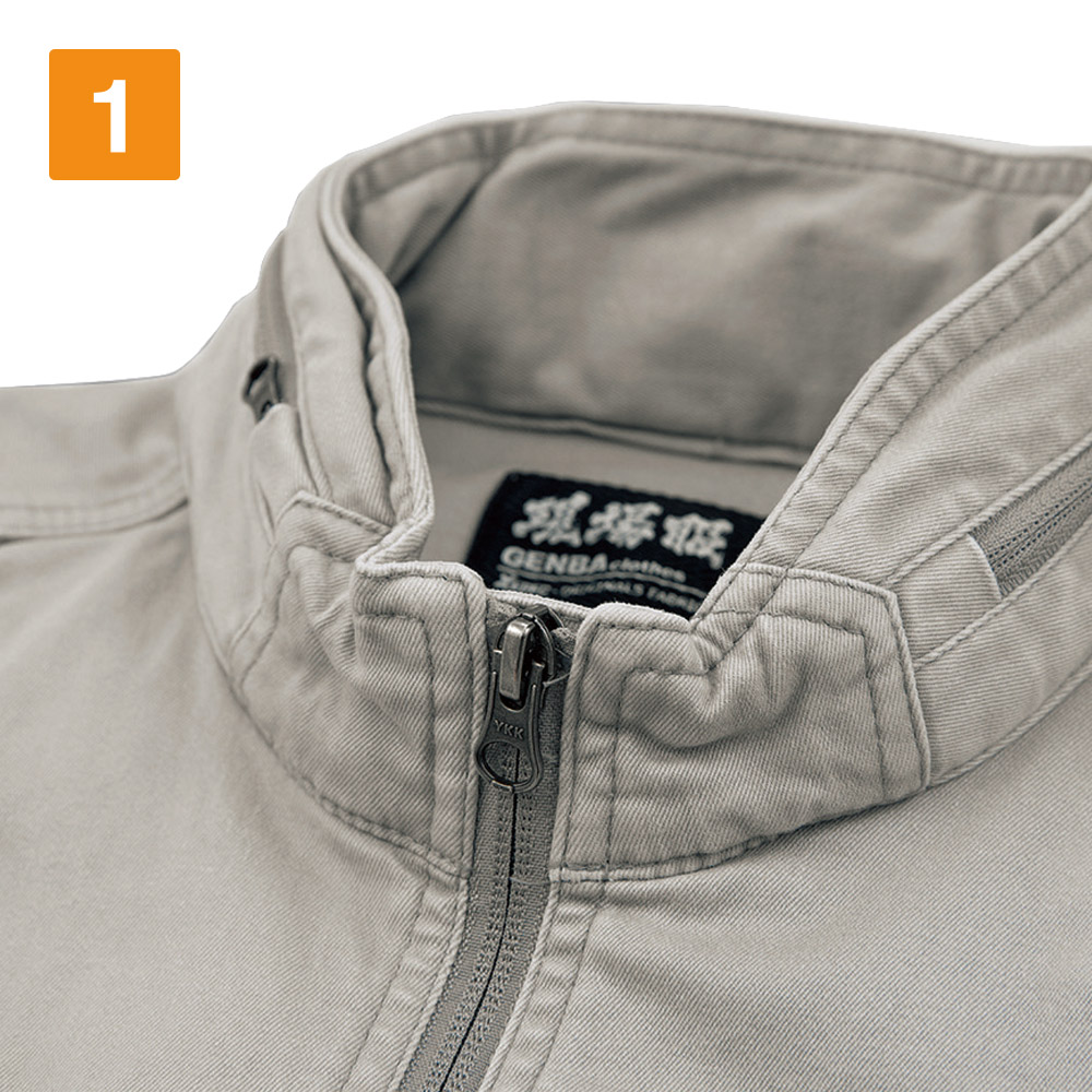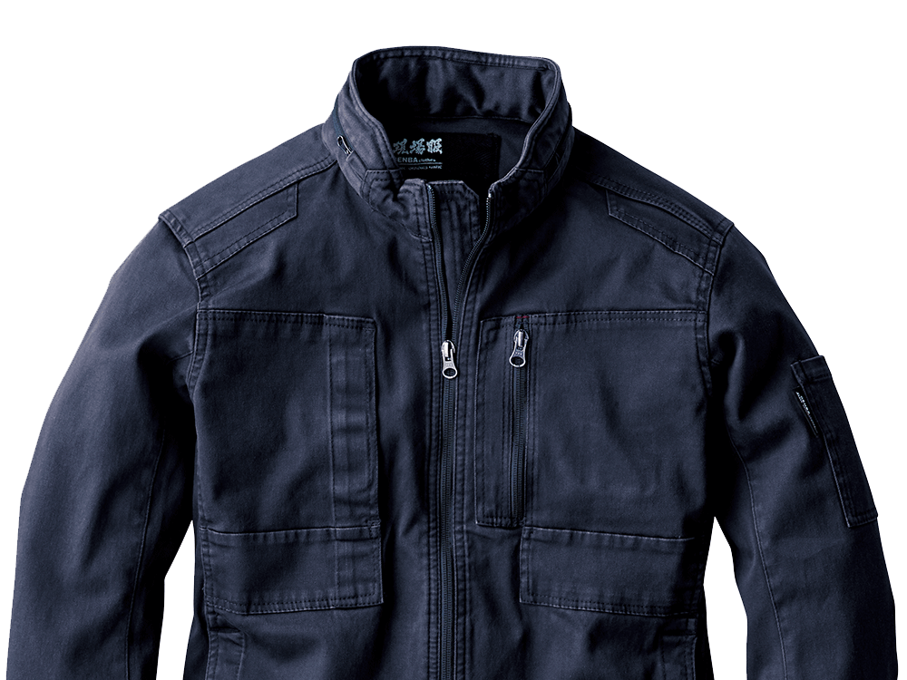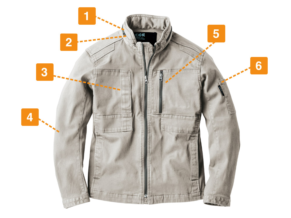 見た目は本当におしゃれなブルゾン。作業服のイメージを一新するクールなデザインで、実物もとてもかっこいいですよ。また、ハーネスと一緒に着用してみましたが、本当にどのポケットも出し入れがしやすいです。特に胸元の縦型ポケットなど、スッと取り出すことをとことん考えられているのが分かりました。そして、おすすめポイントはその生地加工。洗い加工が施されているので、初めからやわらかで肌馴染みよく、着心地がすごくいいんです!長時間の着用でも迷いなくおすすめできる、現場にはもってこいの上着です。