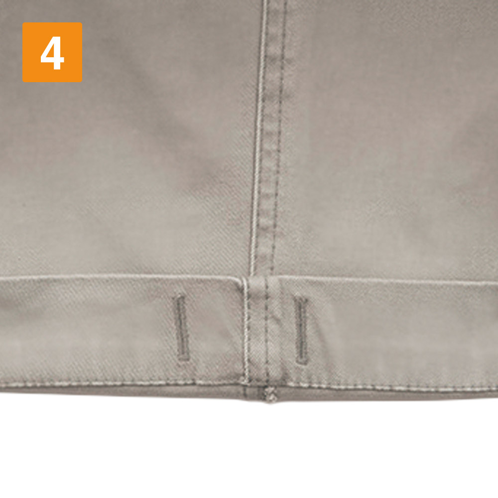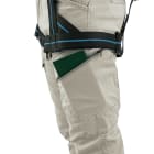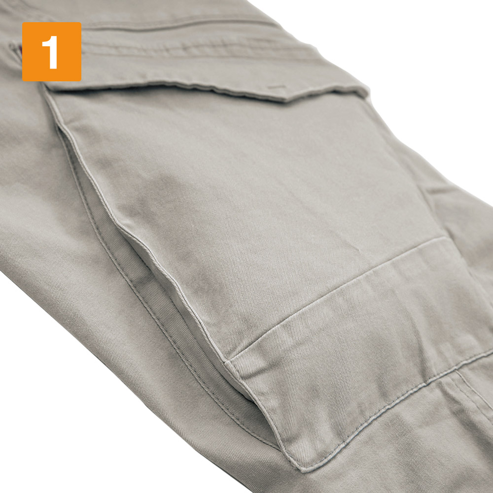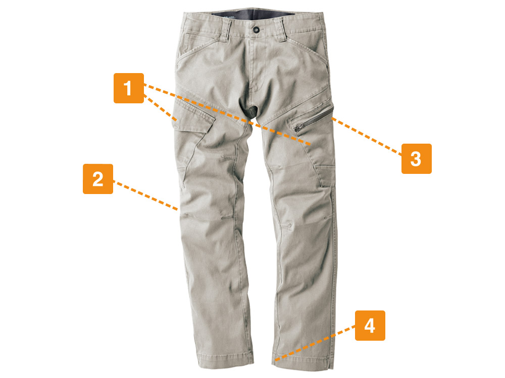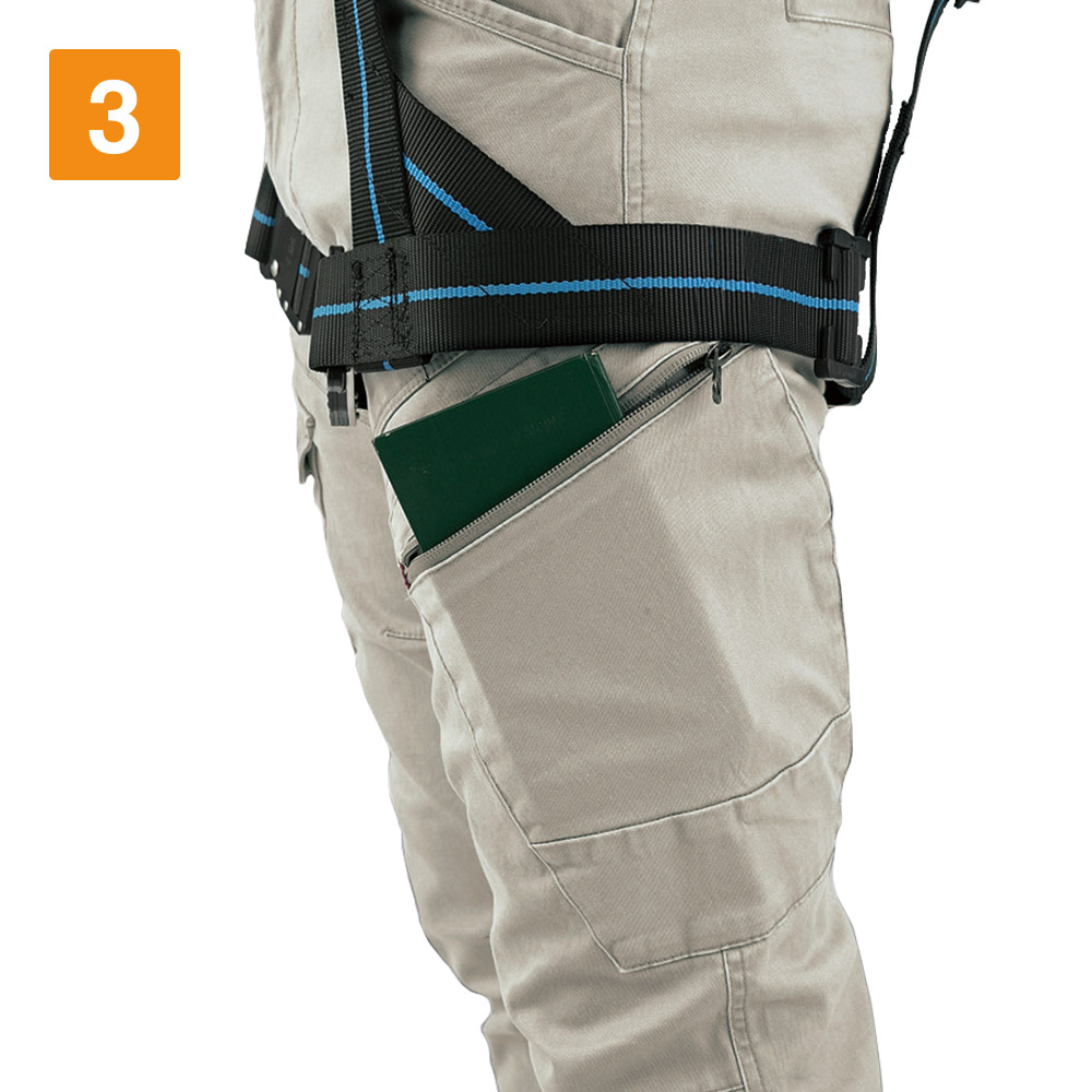 フルハーネス着用時に難点となりがちなのが、ポケットの収納。身体に沿うベルトにポケットが塞がれてしまうことがよくあります。このカーゴパンツでは、ポケットの角度がハーネスベルトの角度にフィット。ベルトとポケットが交差せず、ハーネスを着用したままでスッと物を取り出せる便利過ぎる設計なんです。ナナメポケットはパンツのデザインとしてもとてもおしゃれ。さらにポケットはマチ付きで、たくさん収納できて大変便利です。