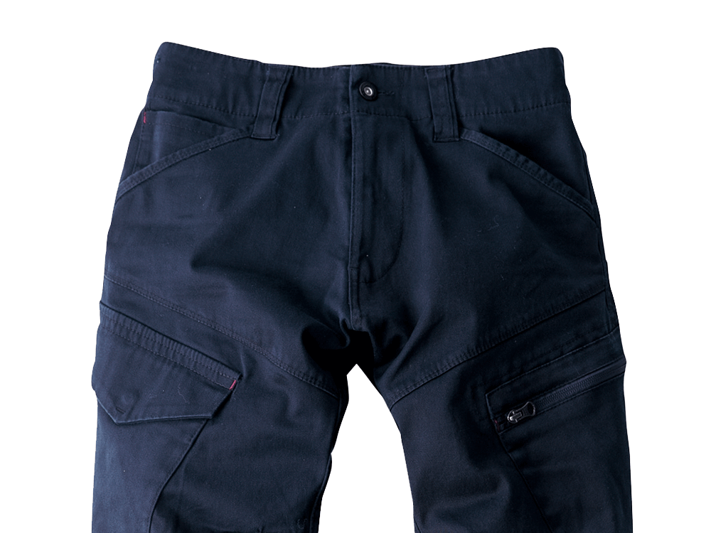 まずは、履いてみてものすごくかっこいいです!細身で本当に脚の形を綺麗に見せてくれるので、働いている姿がきりりと締まるおすすめの一着です。さらに嬉しいのはパンツの動きやすさ。立体裁断とストレッチ性のある生地が、本当によく脚の動きにスムーズに追従してくれます。走る、座るなどの基本的な動きはもちろん、屈伸や開脚など大きな動きでも引っ掛かりを感じません。おしゃれな作業着を探しているけど、機能性に欠けるのはちょっと…という方におすすめのパンツです!