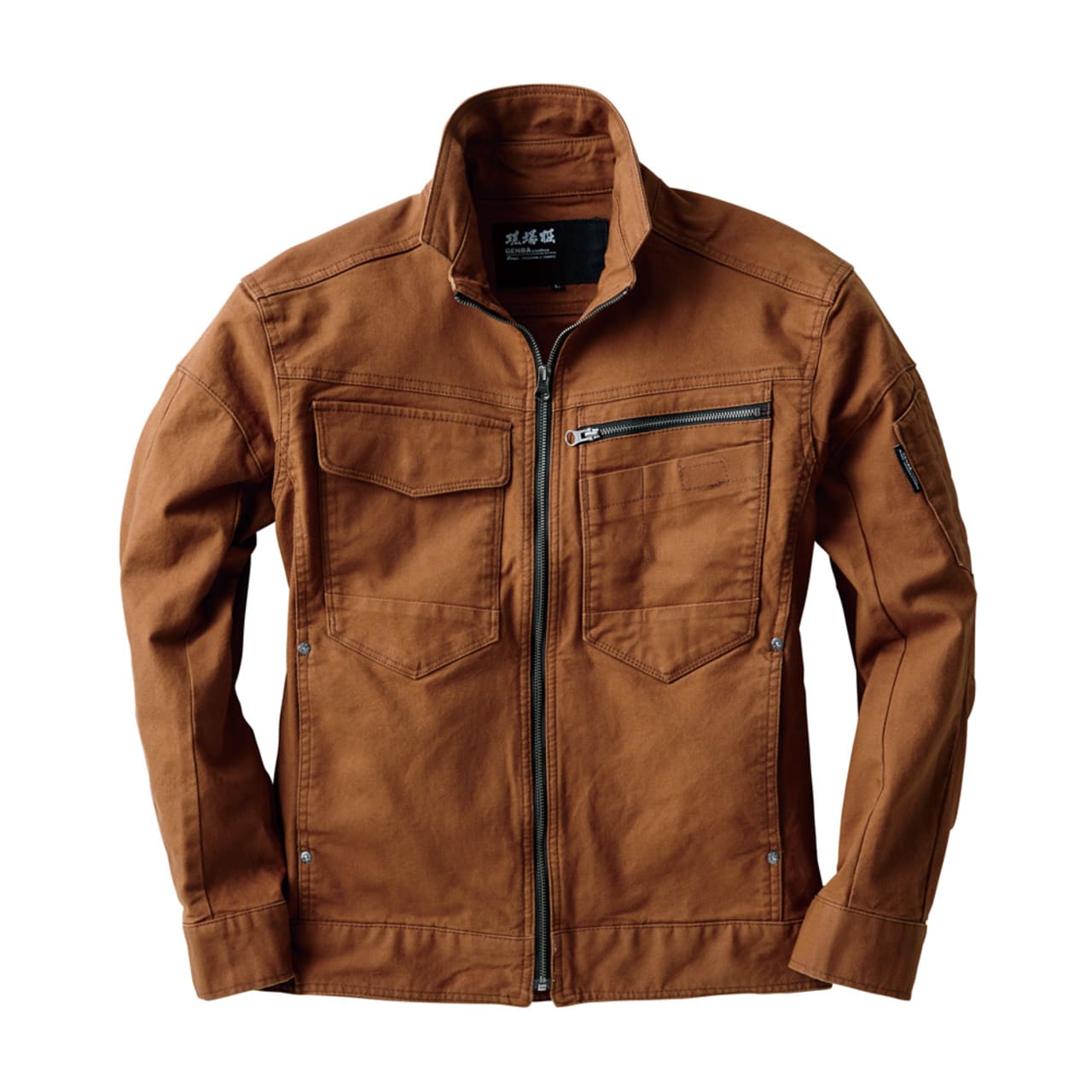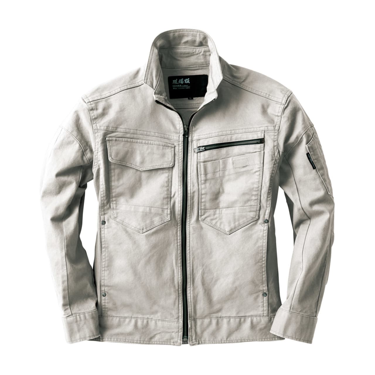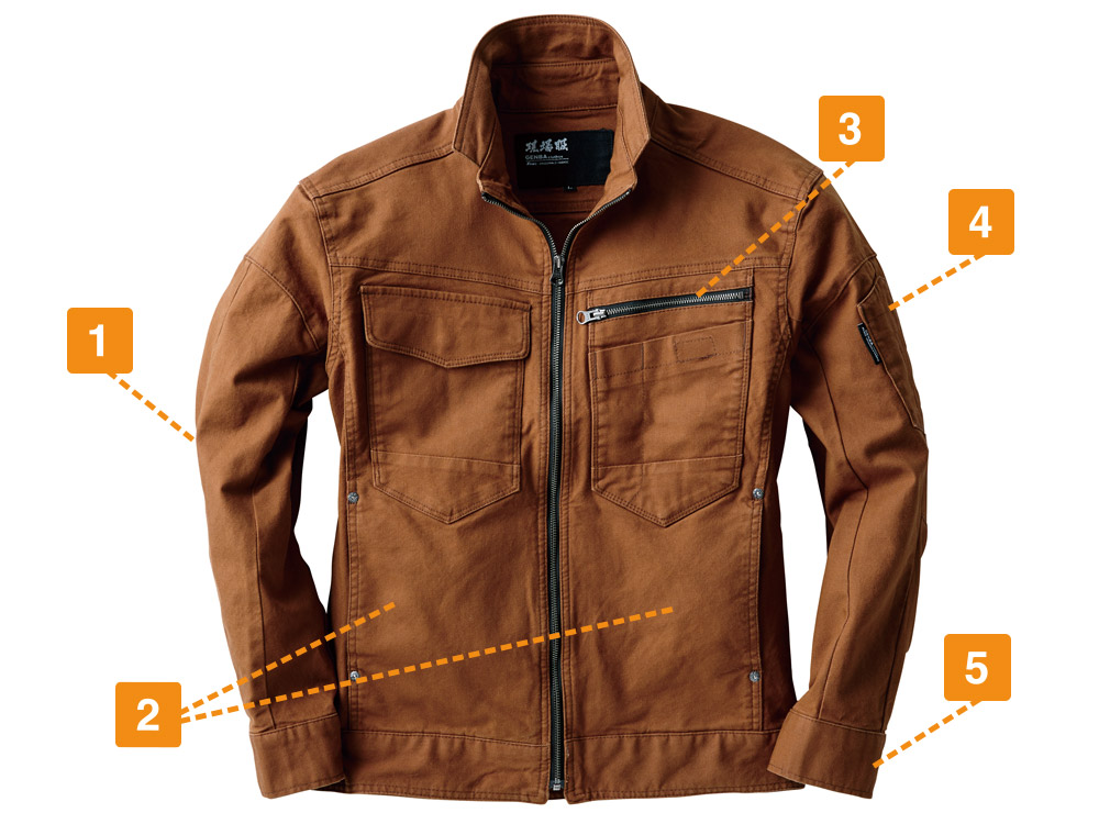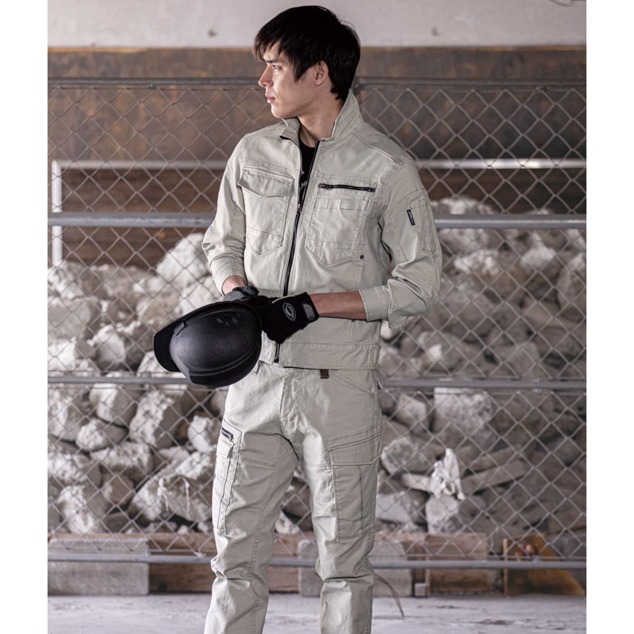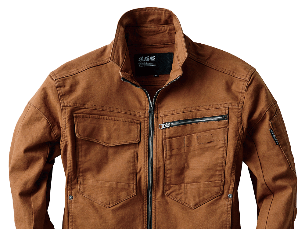 本体素材に採用されているのは高いストレッチ性のある生地、ストレッチオックス。綿を主体とした生地でとても肌触りが良く、厚手ながらも本当によくストレッチが効くのが特長です。現場で求められる急な動きや大きな動きにも追従し、作業性を高めます。肘部分にはタックがとられていることで、肘の曲げ伸ばしもとてもスムーズ。ストレッチ生地によって肘を曲げた時の背中の突っ張り感も少なく、いつでも快適な動きをアシストしてくれる一着です。