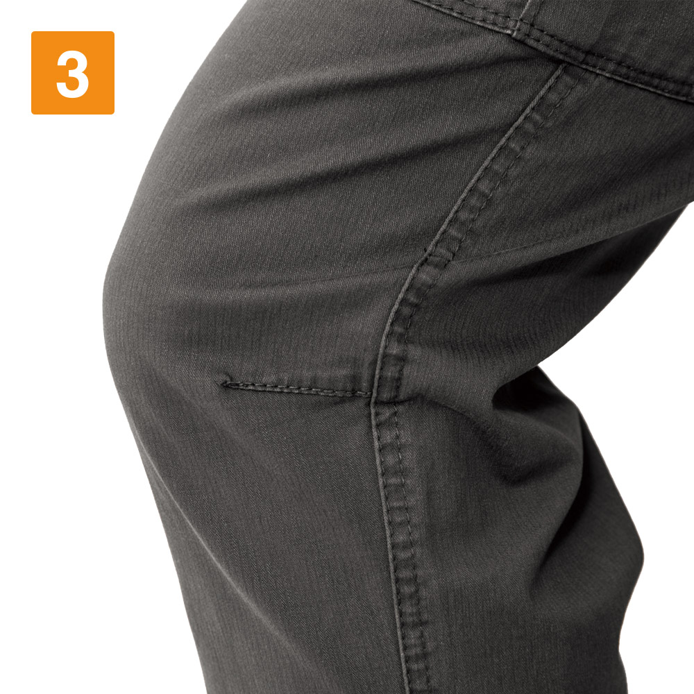 着心地でこのスラックスをお選びいただくことも多いほど、定評のある着心地。綿を高配合したマイクロヘリンボーン生地を採用し、着て洗ってを繰り返すことで出てくる綿の風合いをお楽しみいただけます。形はベーシックながら、作業着としてはなかなかない生地感で、差別化を図ることも可能です。また、本製品ではあらかじめ洗い加工を施しているのも特長。はじめて履いていただくときから、綿特有のやわらかくやさしい肌触りを体感いただけます。
