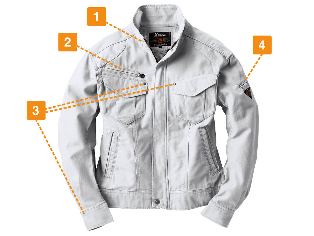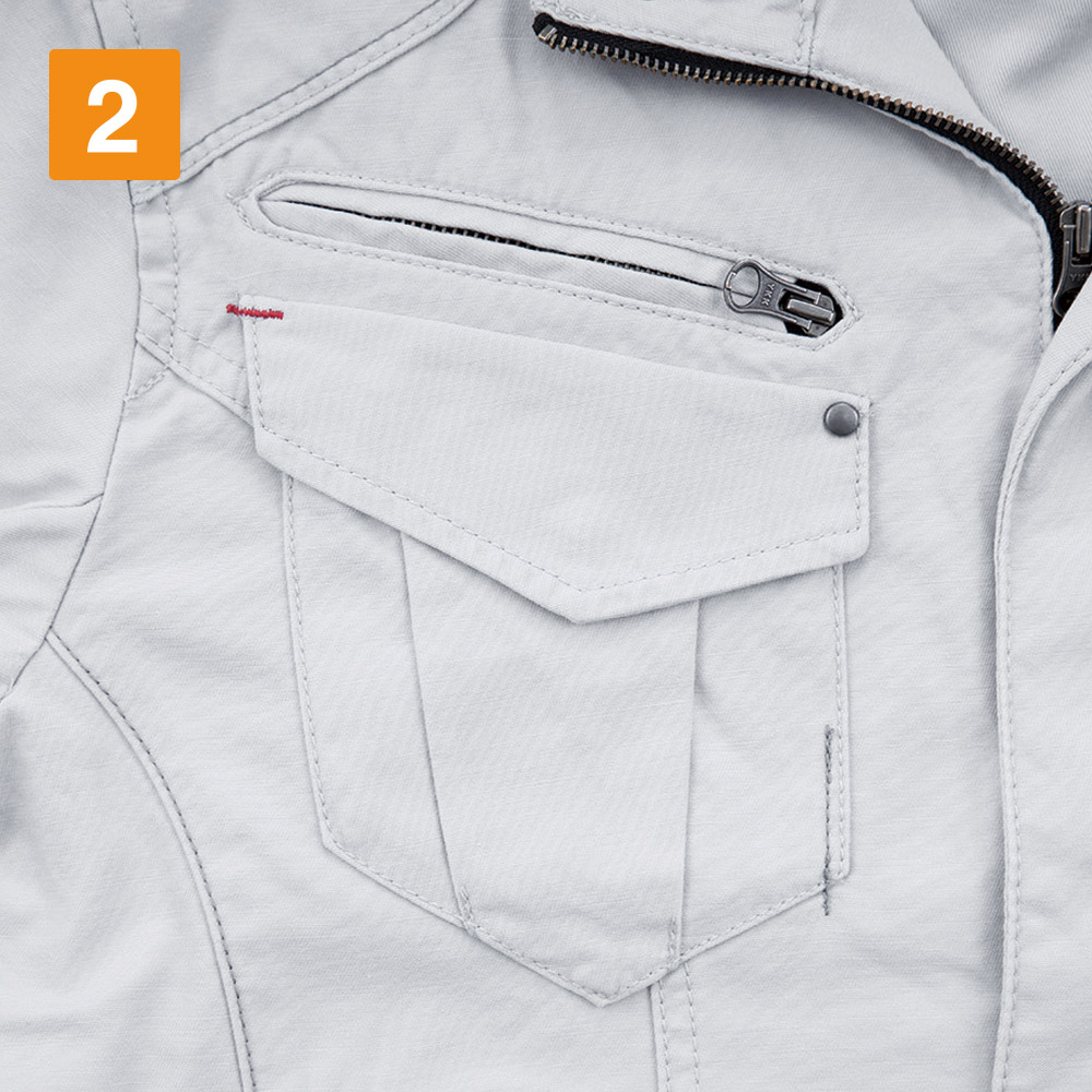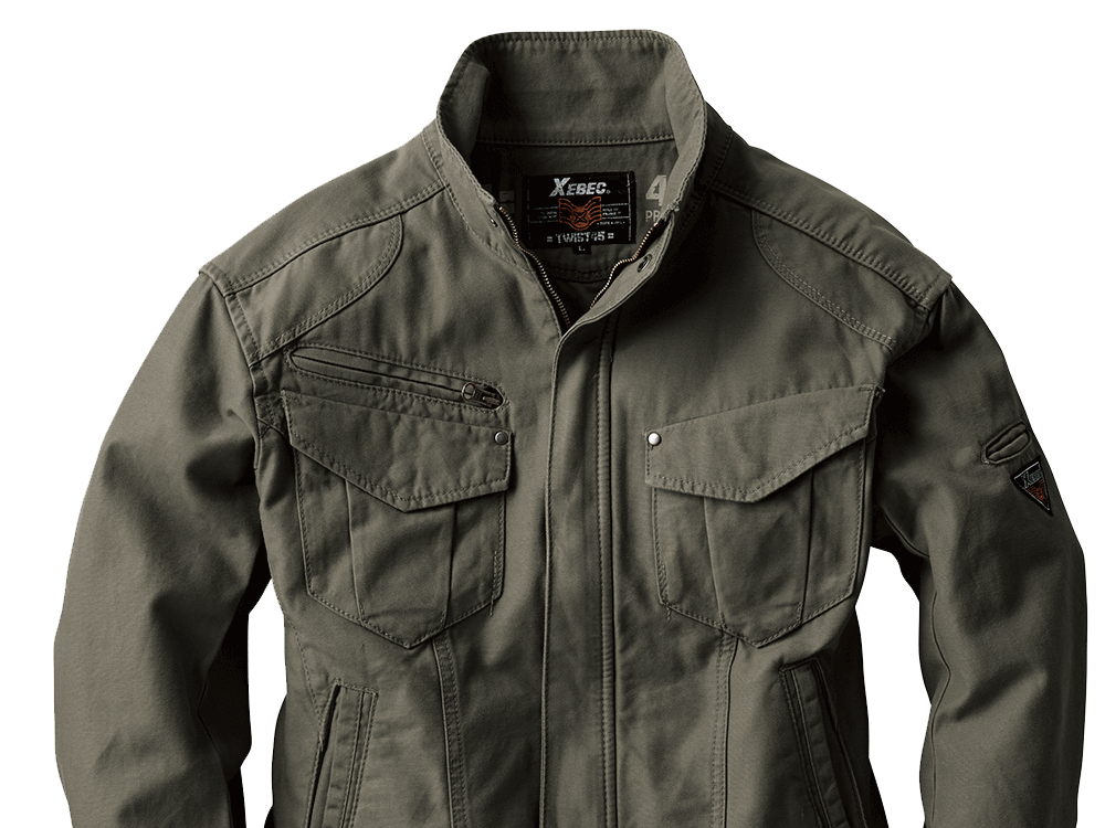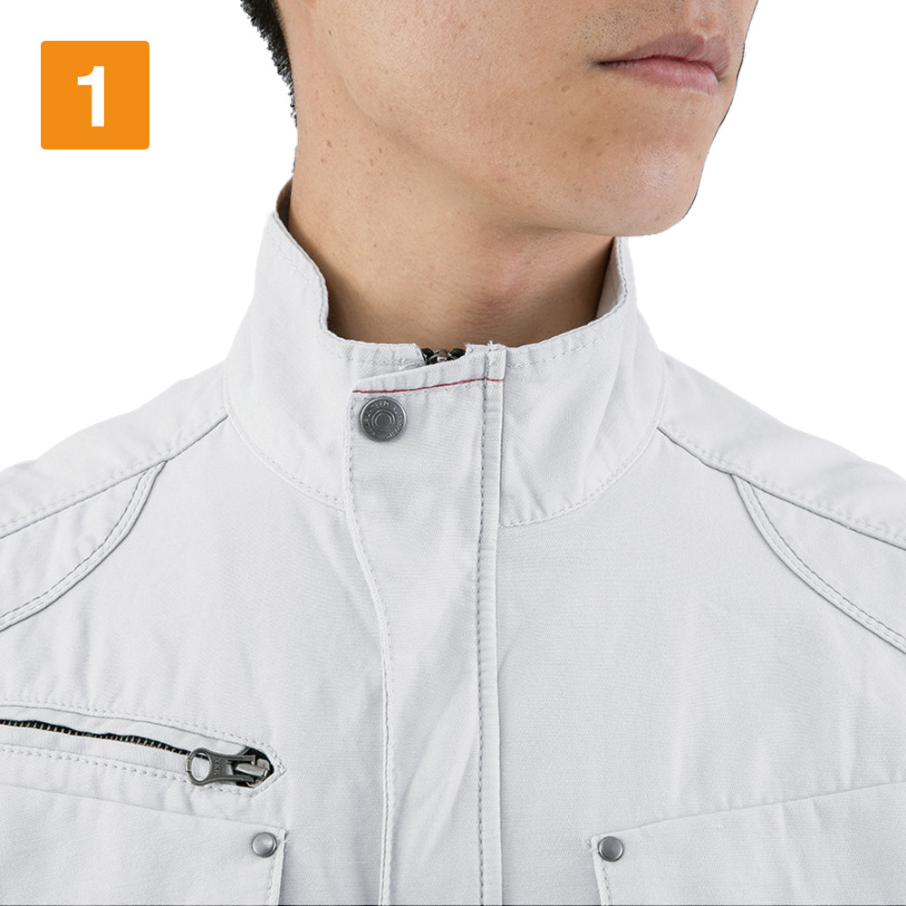 実際の着姿を360度どこから見ても、とてもかっこいいショート丈。他にはないかっこよさがあります。本体にはそのかっこよさをより引き立てるアクセントがたくさん。肩や前面に入った布地の切替と渋い金属のドットボタンが、ブルゾンの見た目にリズムを与えてくれます。さらに襟元やカン留めの赤のステッチ、内側首元と袖につけられたレトロなジーベックロゴが雰囲気よく、生地との相性も抜群です。動きやすいのにまるでおしゃれ着のようで、どなたにもかっこよく着ていただけます。