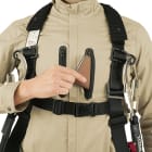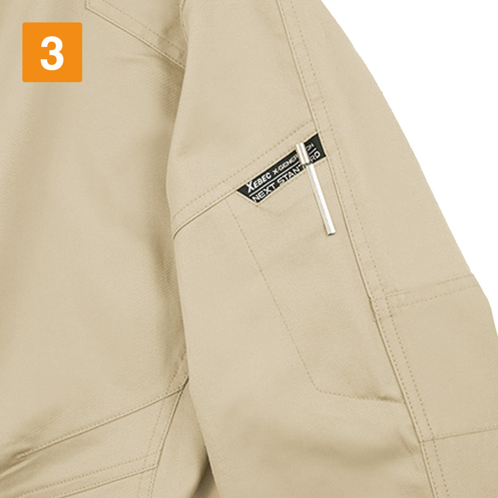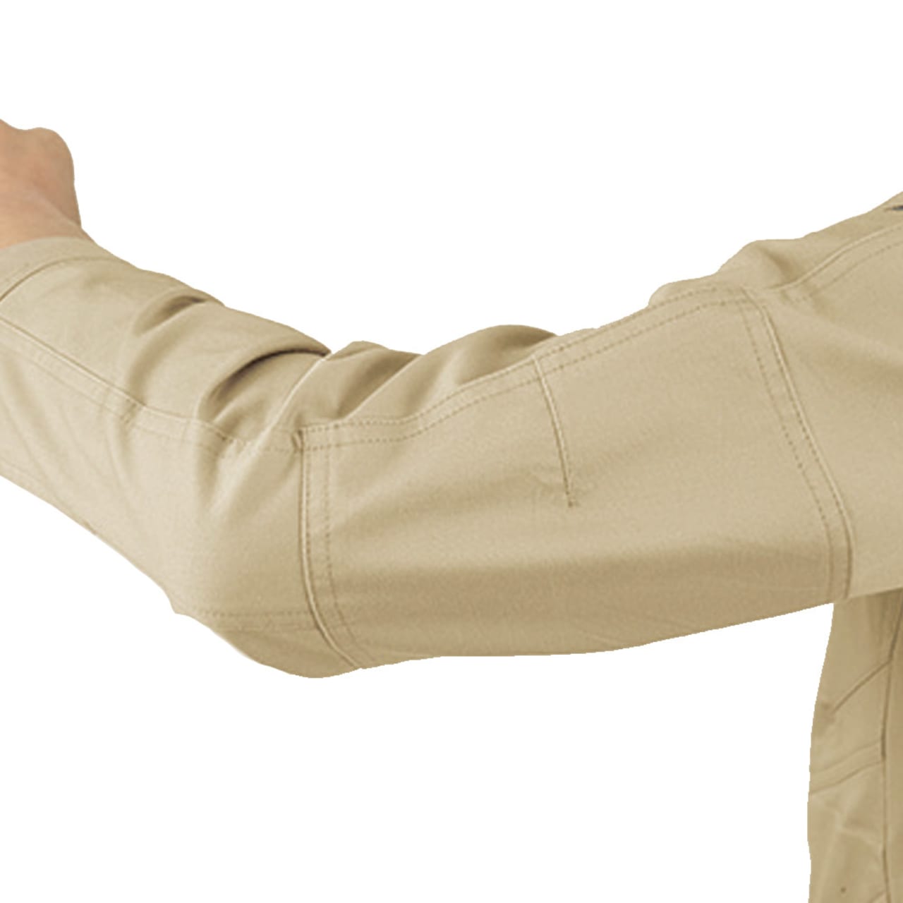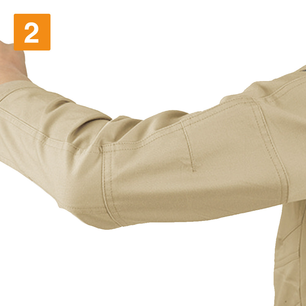 本当に作業着?と疑うほどのおしゃれさが光るワークシャツです!生地と同色のボタンカラーがスマートで、デザインへのこだわりを感じます。本物を見ると胸のファスナーテープのアクセントや、肩部分の生地デザインがかっこよさをプラスしているのがよくわかります。また、着て感じたのが驚きの動きやすさ!ストレッチ素材が身体の動きに追従し、立体的な肘や胴回りの構造が、腕の曲げ伸ばしや身体のひねりなどをしっかりサポートしてくれます。