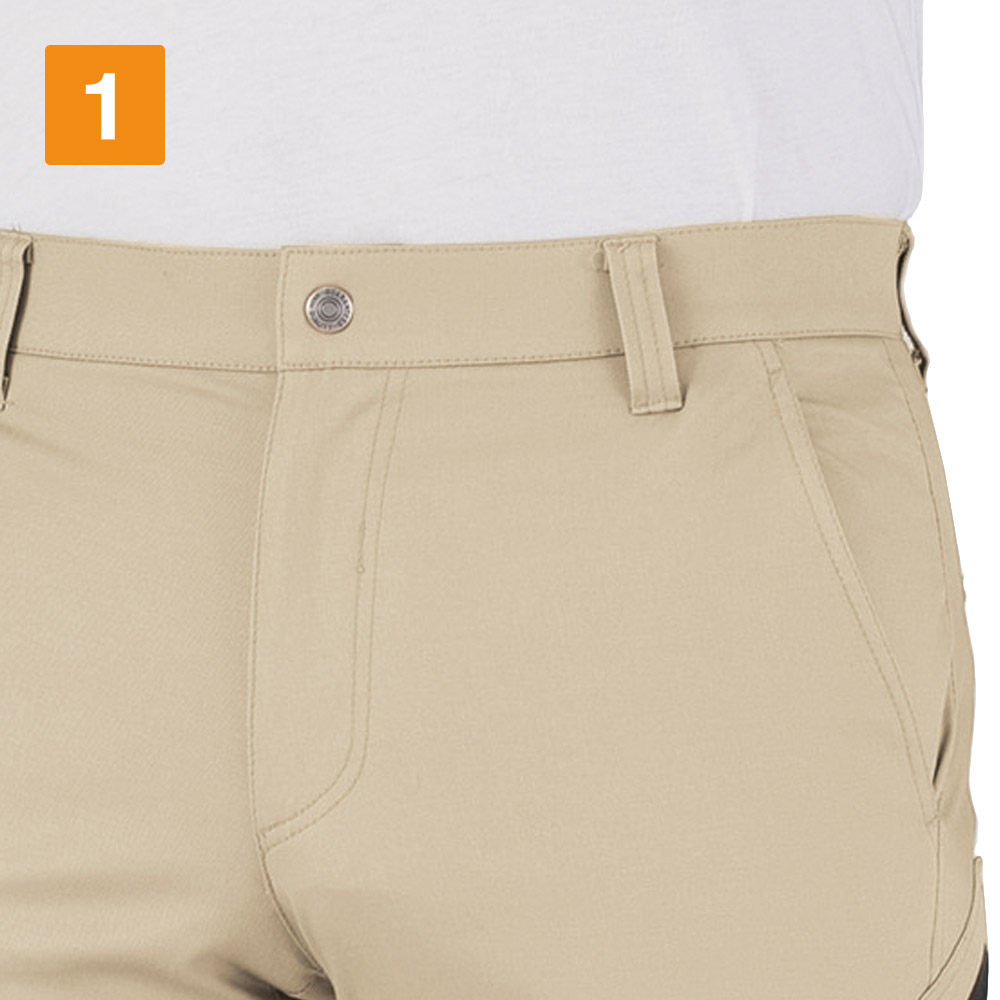 かっこよくスマートなシルエットで、スタイルをよく見せる効果抜群!太ももの切り替えラインが、スポーティでアクティブな印象を与えてくれます。また実際に履いてみると、とても動きやすくて驚きました。しゃがんだり座ったりしてみたところ、生地がやわらかく脚の動きに追従して、わずらわしさをほとんど感じません。長時間座っていても楽なので、デスクワークの方にもおすすめ。様々な作業環境に適応する、とても好印象なスラックスです。