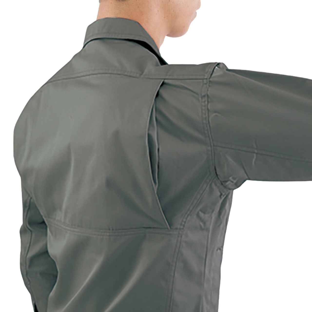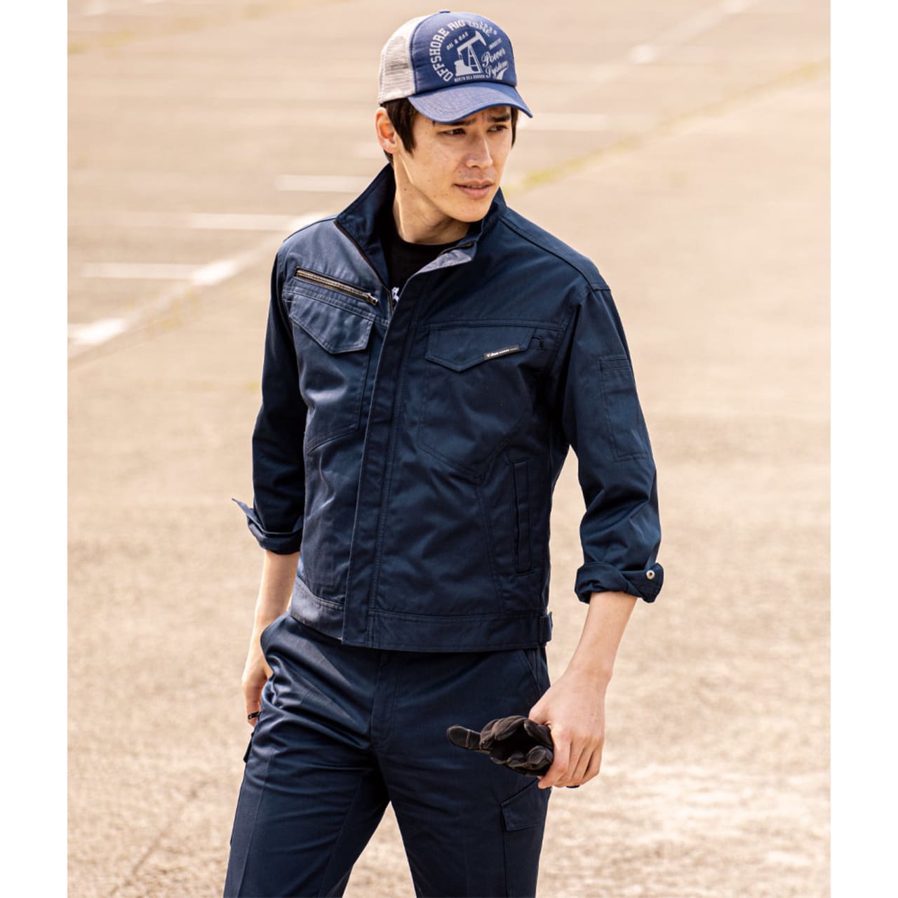 スタンドカラーや裾に向けて絞られたシルエットが、着用時にとてもかっこよく映えます。ウエストまわりがだぶつかないので、とても今らしい着こなしに。胸ポケットのファスナーテープやロゴラインがアクセントとなって単調にならず、シンプルながらも存在感のある着姿。さらに、作業着としての動きやすさもポイント。今回実際に着用して動作を行ってみました。背中のノーフォーク仕様で、肘を曲げたり前屈したりといった動作も快適に行えます。体を動かすお仕事にも自信を持っておすすめできるブルゾンです。