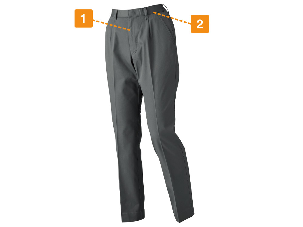 男女兼用品との違いがそんなに感じられるかな?と思いつつ、女性スタッフが実際に着用してみました。そしてその違いにびっくり!適度にフィットしつつ、作業姿を美しく見せてくれます。兼用品によくある腰上のだぶつきがなく、ウエストに合わせて履いても、太もも周りにゆとりを感じられるのが嬉しいです。生地の組み立てによりシルエットはすらりとしていますが、適度なゆとりがあり動きやすさも抜群。デスクワークにも、動き回るお仕事にも、どちらにもフィットしそうなパンツです。