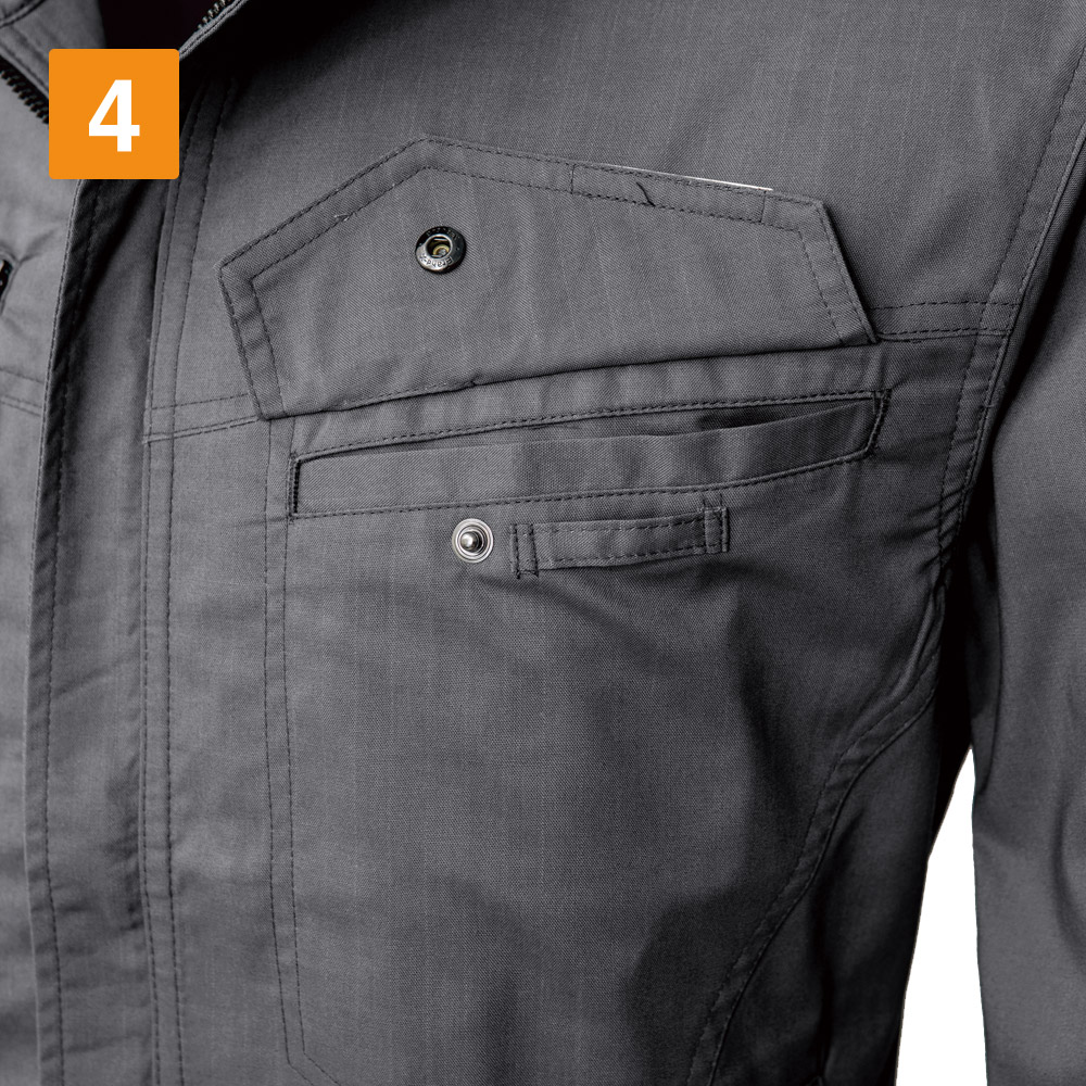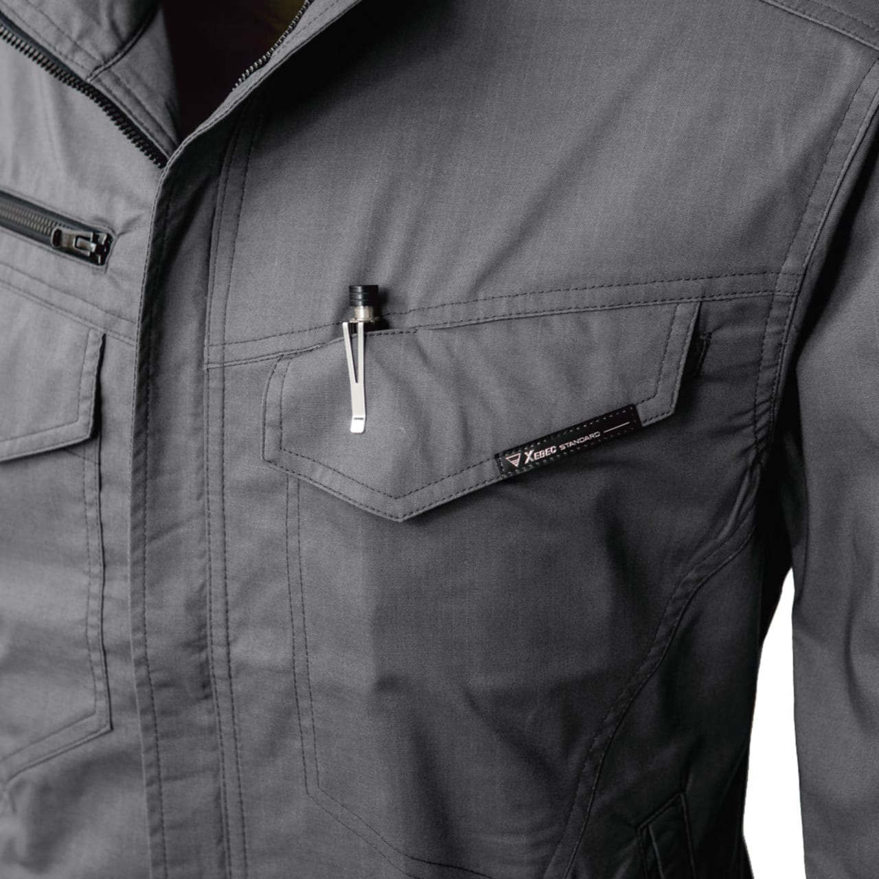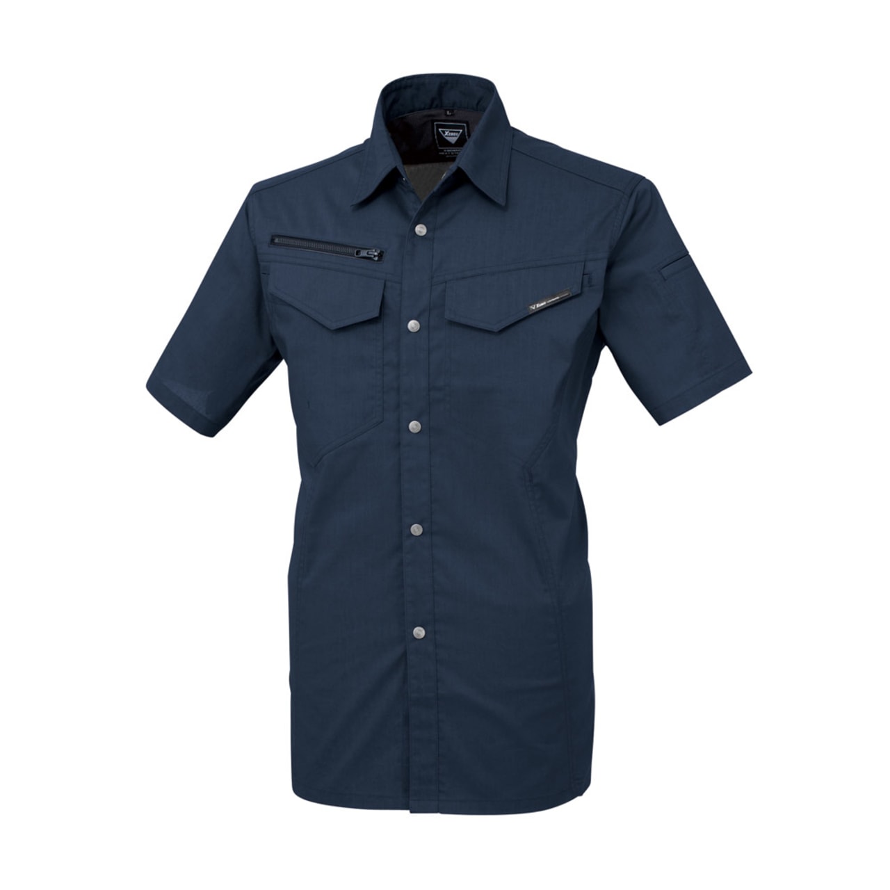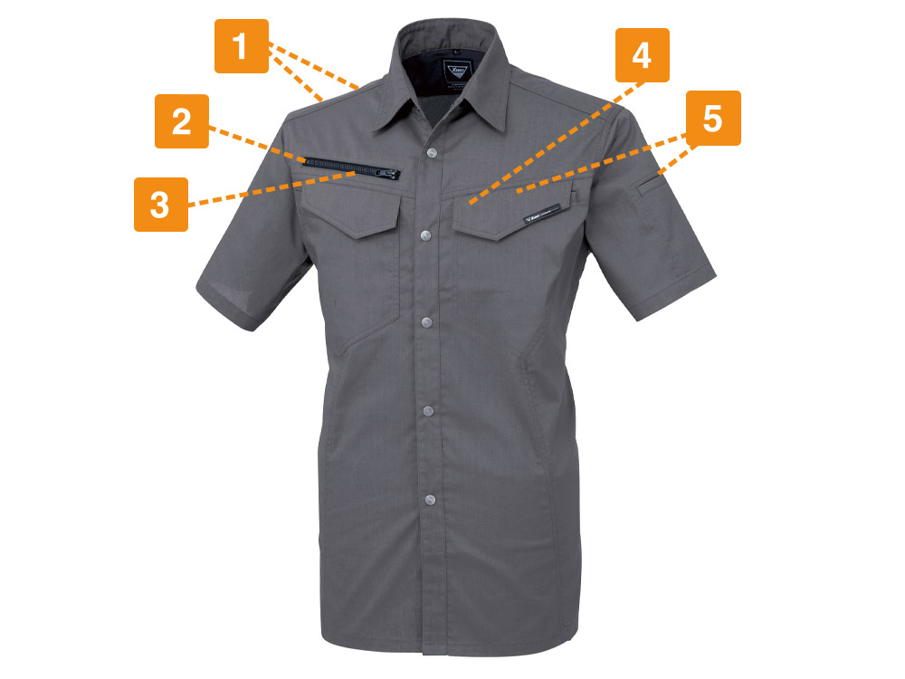 無駄を省いたシンプルデザインがスタイリッシュなシャツ。ポケットファスナーとフラップのロゴが、アクセントとして全体を引き締めているのもとても好印象です。また作業着としての動きやすさもしっかり設計されています。背中のノーフォーク仕様によって、腕の曲げ伸ばしや前屈などの動きがとても楽に!実際に着用してみましたが、高いものを取ったり、運搬したりといった動きがストレスなく行えます。動きやすさ、見た目ともに申し分なく、夏用シャツとしてこれ以上ない一着と感じます。