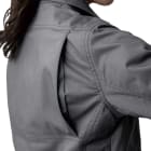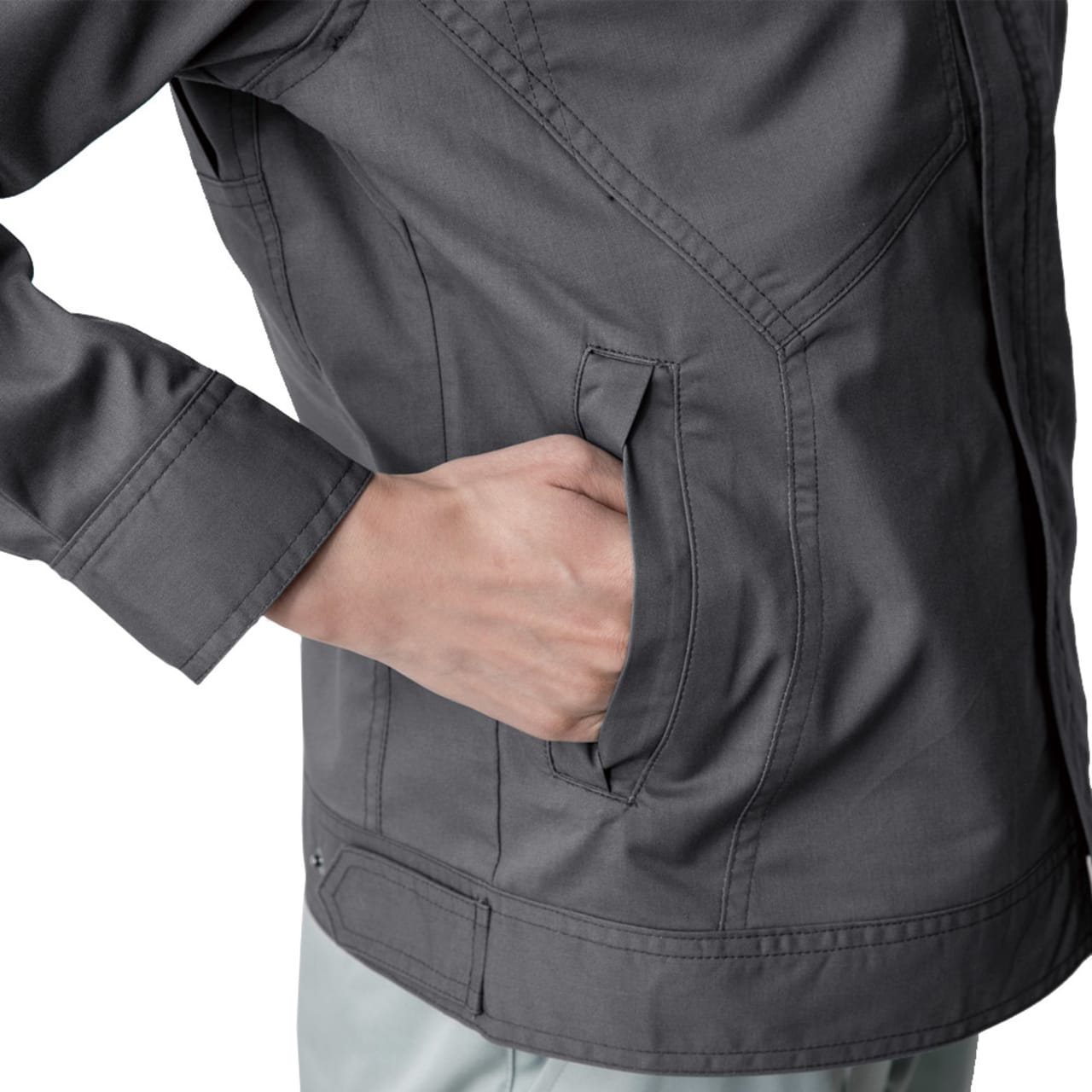 女性スタッフが実際に着用してみました。一番の特徴はウエストが少し絞られたシルエット。男女兼用品だとどうしても寸胴に見えがちだったウエスト周りをすっきりと見せてくれます。さらに裾に向かってわずかに広がっていくので、腰回りがつっかえず楽な着心地に。布が余っていたり、逆に変に突っ張っているととても動きにくいもの。このブルゾンではその問題を解消。フィットしているにもかかわらず、動作のしやすさも備えているんです。また背中がノーフォーク仕様となっており、腕の曲げ伸ばしや前屈などの動きも楽々。作業着としての機能性が抜群の一着です。