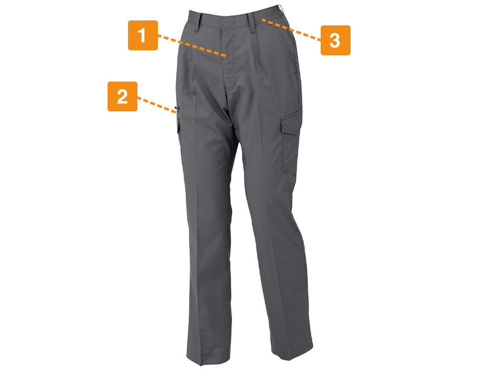 今回、女性スタッフが実際に着用してみました。太ももに合わせて着るとウェストが余ってしまったり、逆にウエストに合わせると太ももが張ってしまったり。男女兼用品にありがちな悩みを解消するフォルムがとても美しいです!また立体的で体に沿う生地の組み立てによって、動きやすさも兼ね備えています。動くことで生地がつっぱったり、余ることもありません。着用して屈伸運動や、膝の曲げ伸ばしを行ってみましたが、ストレスなくスムーズに動作を行えました。オフィスでの着用から大きな動きを伴う現場まで、幅広くお使いいただけるウェアだと感じます。