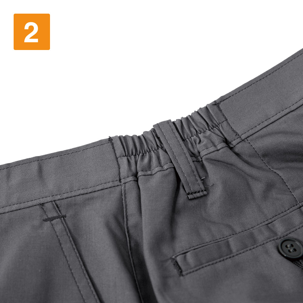 今回は実際に女性スタッフが着用してみました。作業着であることを忘れさせる、すらっとした姿がとてもスタイリッシュです!シリーズのブルゾンやシャツを合わせるのはもちろん、カッターシャツなどとも馴染んでくれるので、職場を選ばず履いていただけます。また、太ももまわりの適度なゆとりがとても動きやすいです。さらに腰まわりのシャーリング加工がウエストにやさしくフィット。しゃがんだりしても隙間が開かないので、アクティブに体を使う仕事にもおすすめです。