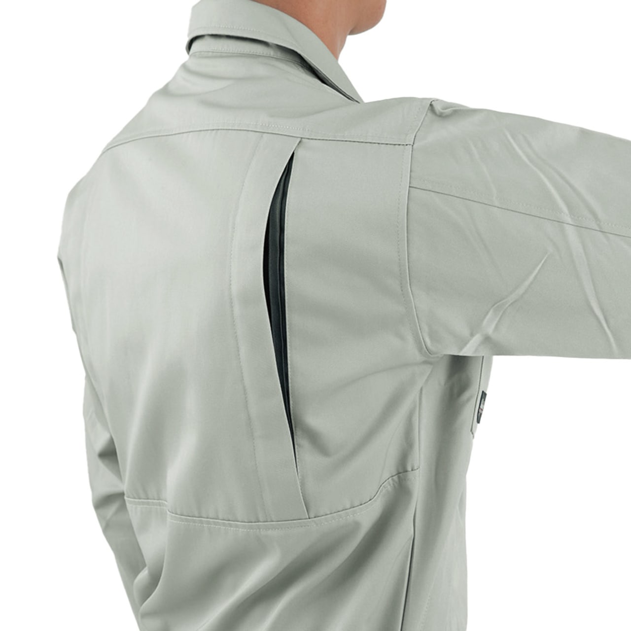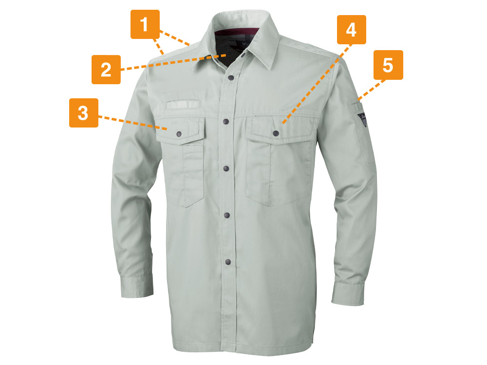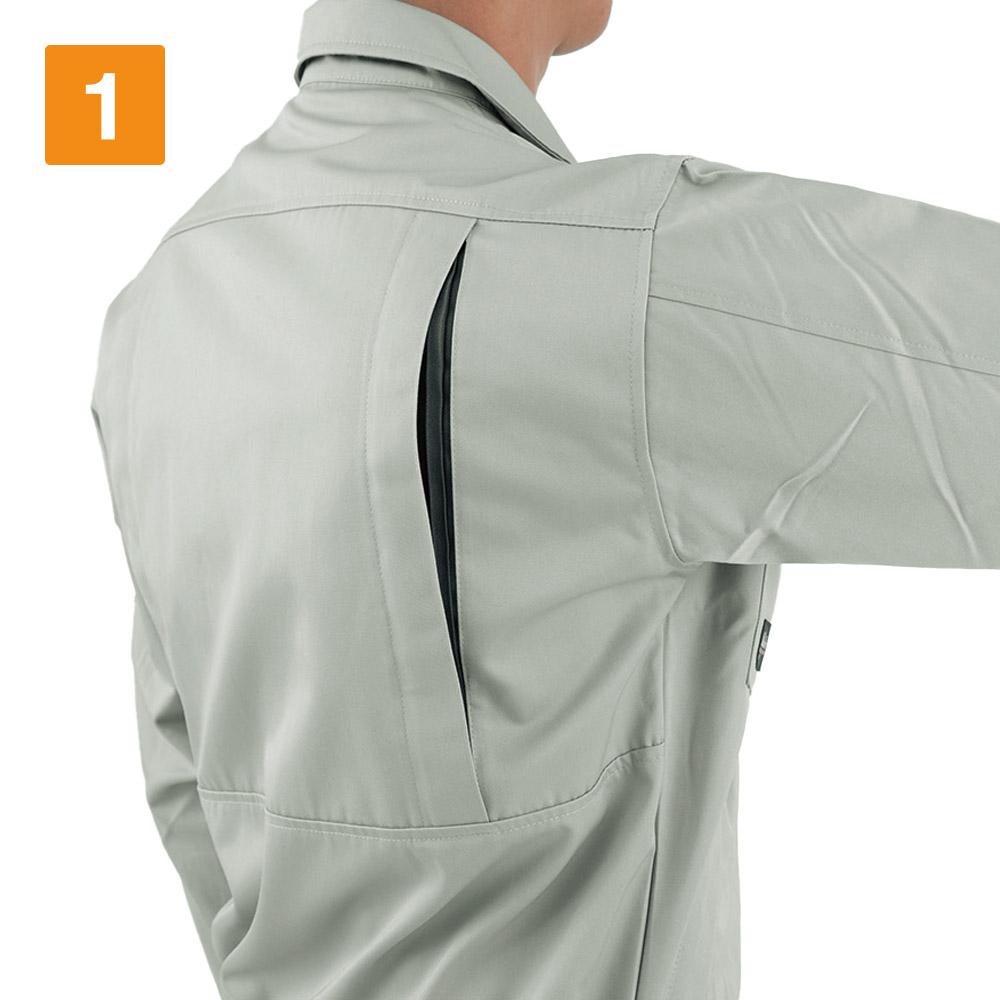 シャツの生地に採用されているサマーツイル生地。綿を混紡した素材で肌触りが良く、やさしい風合いが魅力です。着用を重ねるごとに少しずつやわらかくなり、着心地がアップしていくので、愛着を持って長く着ていただける一着です。また、動きやすさにもこだわった設計で、背中には動きやすさと通気性を備えたメッシュプリーツロンを配置。背中内側にもメッシュ生地が使われているので、熱や湿気がこもりにくいのも特長です。収納性能にも優れ、一年を通して快適に作業を行っていただけます。