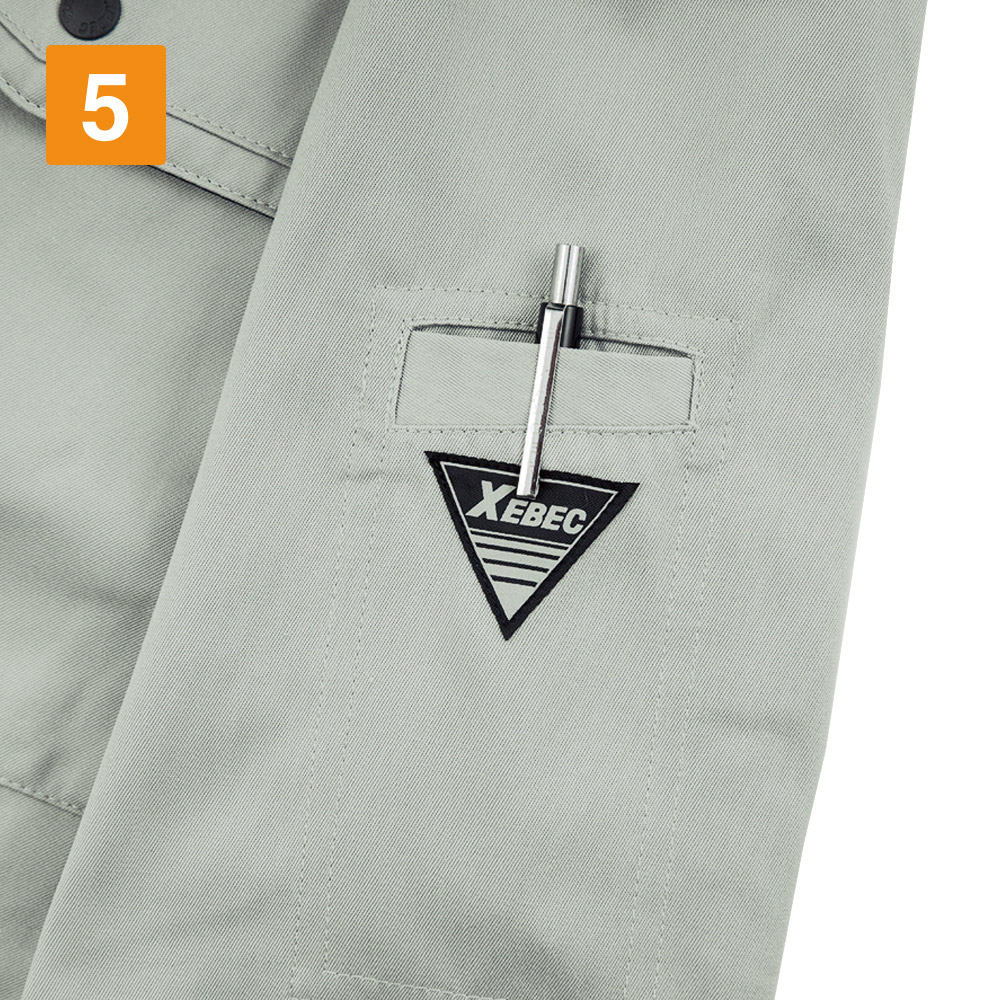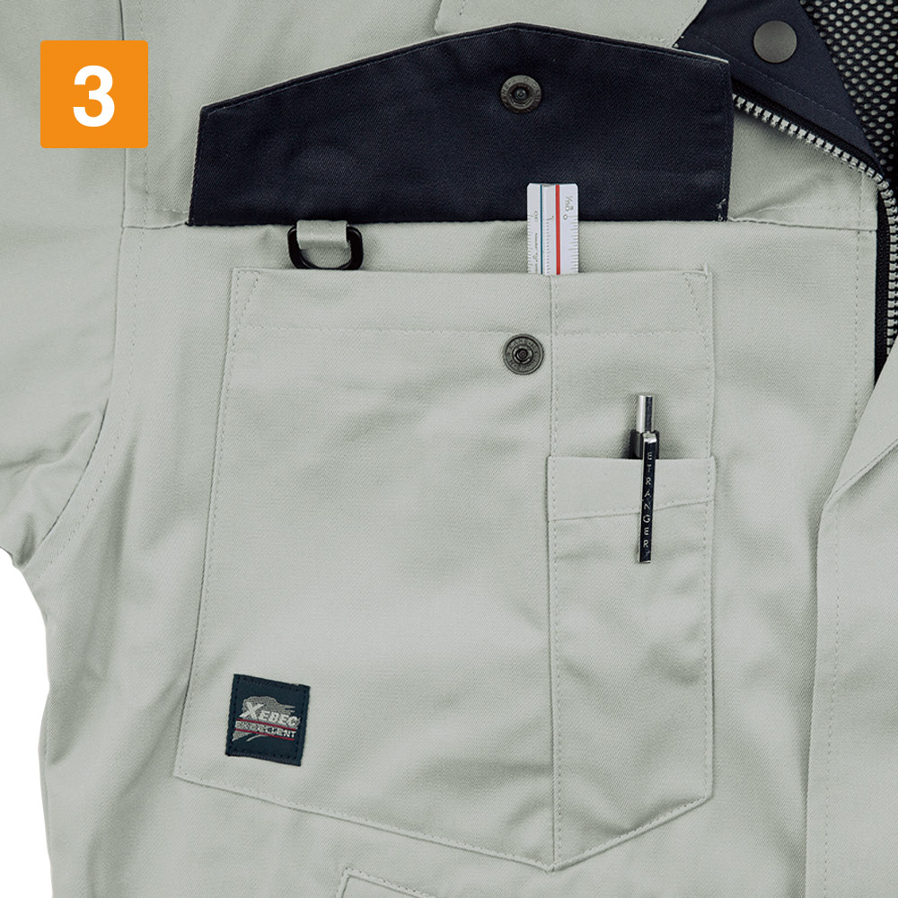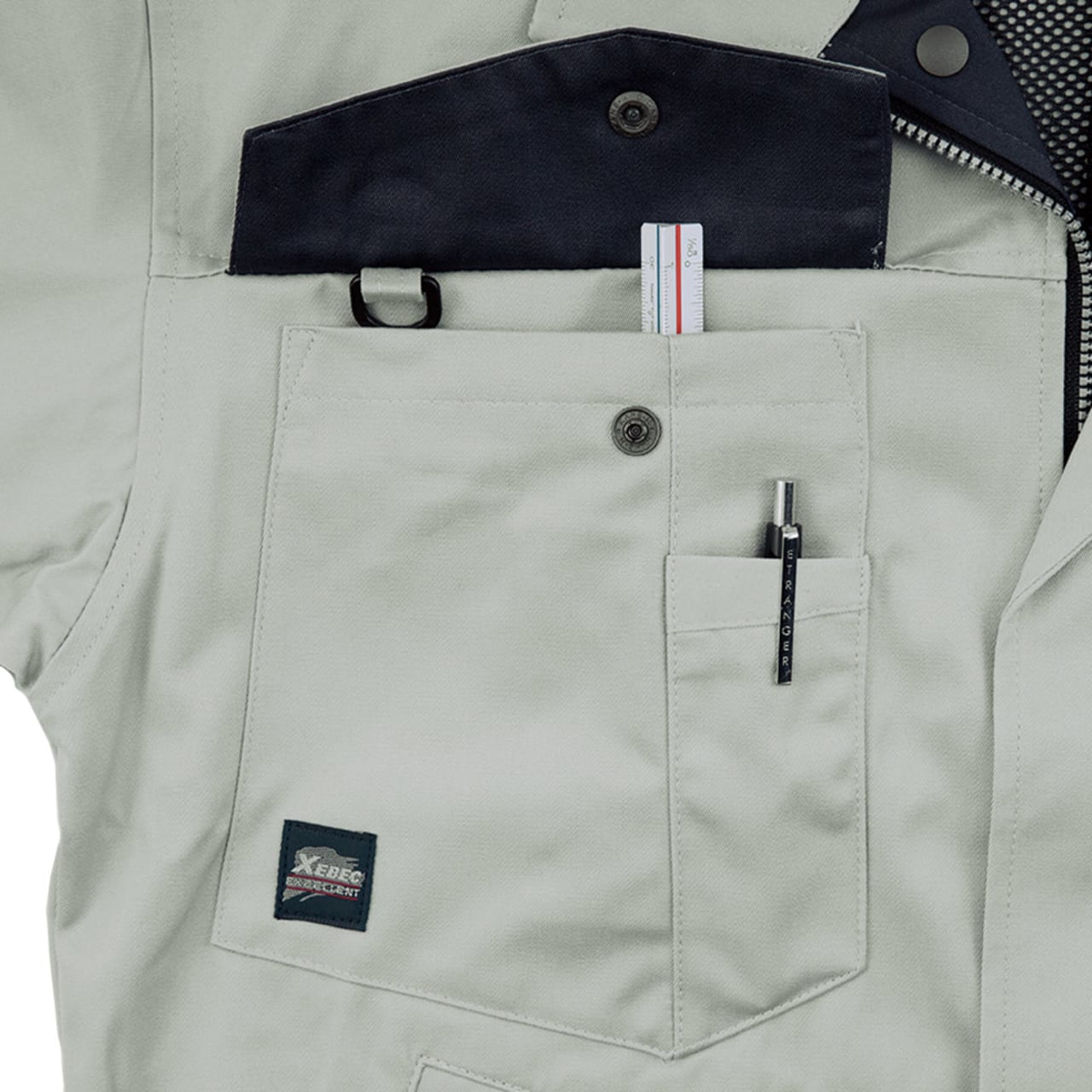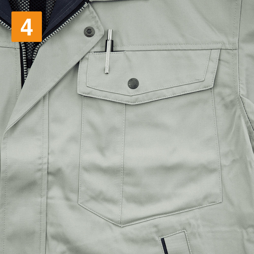 作業着らしい無駄のないルックスがとても好印象。ベーシックなデザインだからこそ出せる誠実さが、組織のイメージアップにもつながります。またポイントはその収納力。胸ポケットにはペンや三角スケールを収納するための細いポケット、携帯電話を落下させないループなど、機能が満載です。動きの多い作業や、打ち合わせ頻度の多い方にもおすすめです。さらにサイズ展開も豊富で、一人ひとりの体型にぴったり合った一着をお選びいただけます。