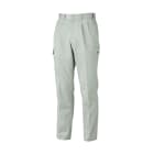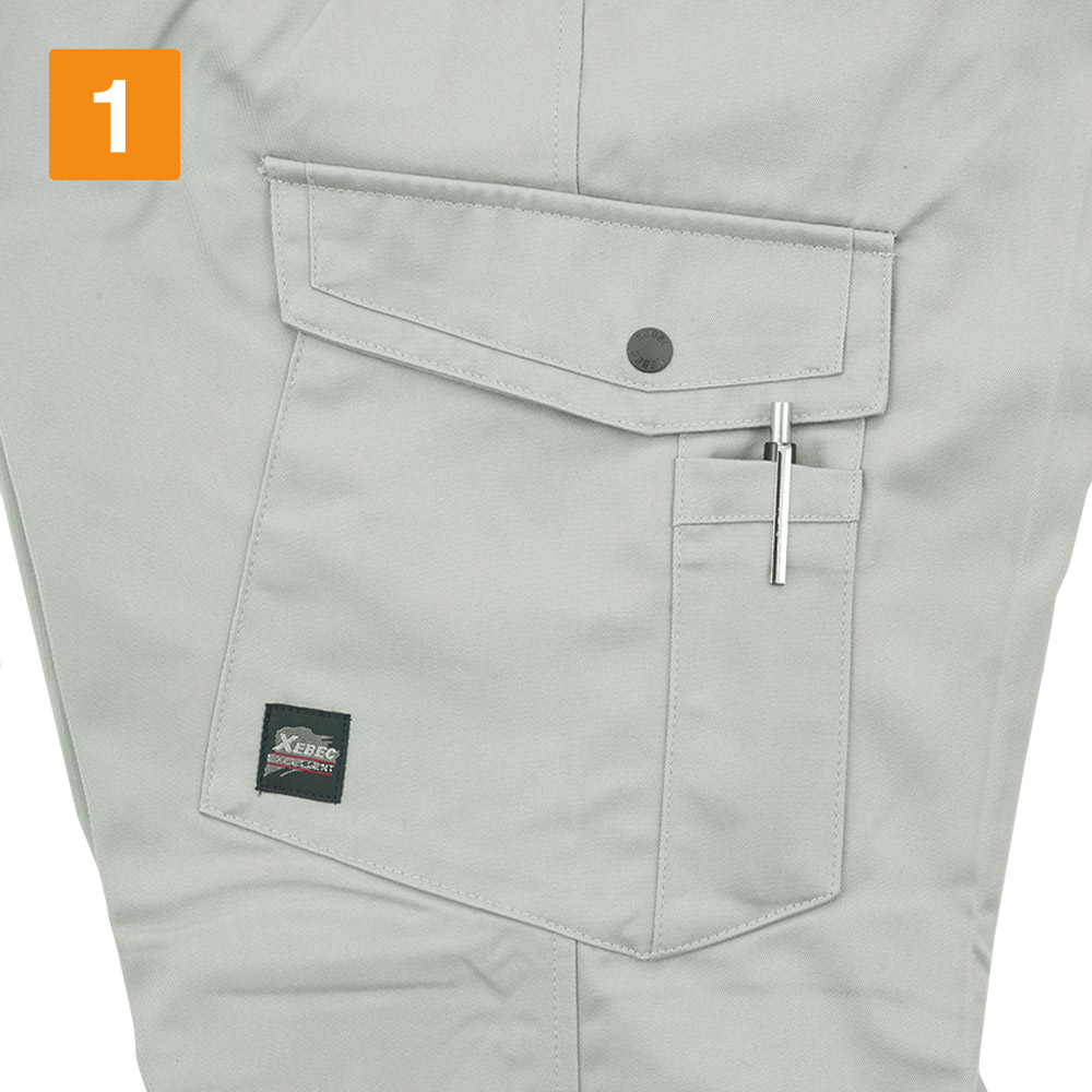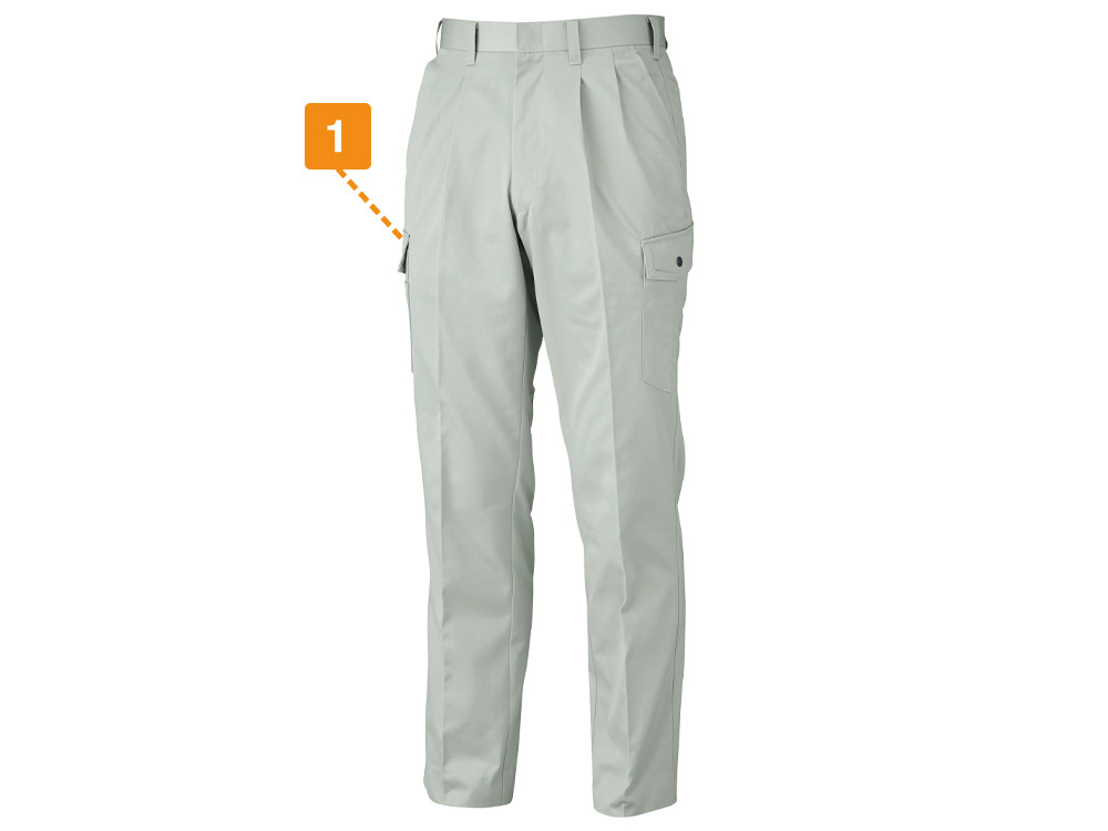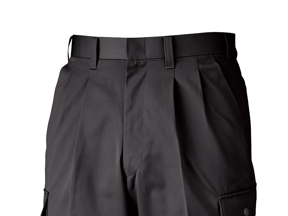 腰まわりの2段タックが動きやすさを生むズボン。美しい折り目が、きちんとした印象を与えてくれます。太ももまわりに適度なゆとりができることで、足さばきなど動きやすさも抜群。今回スタッフが着用して、屈伸や開脚など様々な動きを試してみました。どんな動きでも生地がつっかえることなくストレスを感じないので、とても快適です。大きな動きが求められる現場や、太ももまわりに圧迫感を感じたくないオフィスなどでも、活躍すること間違いなしのウェアです。