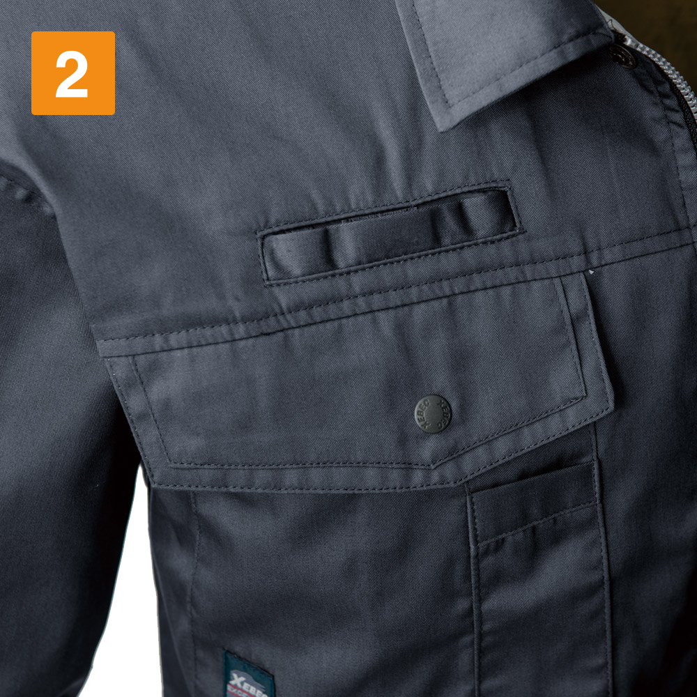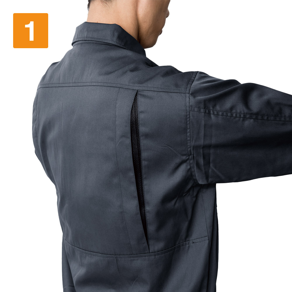 生地の風合いとステッチから、こなれたミリタリーテイストを感じます。体にほどよくフィットするタイトシルエットがさらにかっこよさを演出してくれます。生地が柔らかいので、つっぱり感を感じず動きやすいのもポイント。背中には動きやすさをアシストするプリーツロン構造が採用されています。今回実際着用して、腕の上げ下げや肘の曲げ伸ばし、上体のひねりなどを試してみました。どの動きも引っかかりを感じる事なく、とてもスムーズです。かっこよさだけでなく、大きな動きが求められる現場でも、ストレスなく作業を行える一着に仕上がっています。