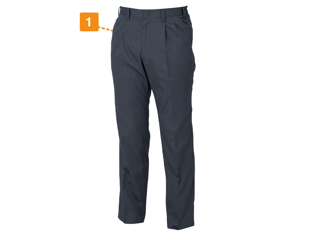 スラックスの生地に採用されているのは、綿が混紡された生地のサマーツイル。35%が綿素材でできているから、着て洗ってを繰り返すたびにやわらかい風合いが増していきます。生地感はツルツルしすぎず、綿の風合いを感じる上質な仕上がり。そのソフトな肌触りが人気の商品です。カラーは落ち着きのある3色展開。ユニフォームとして、誠実さと高級感の両方をしっかり表現できるので、組織イメージの演出にもぴったりの一着です。また、同シリーズのブルゾンやシャツはもちろん、ワイシャツなどとも相性がよく、お仕事着として幅広く着用していただけます。