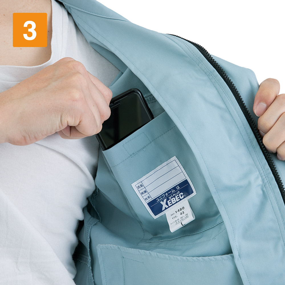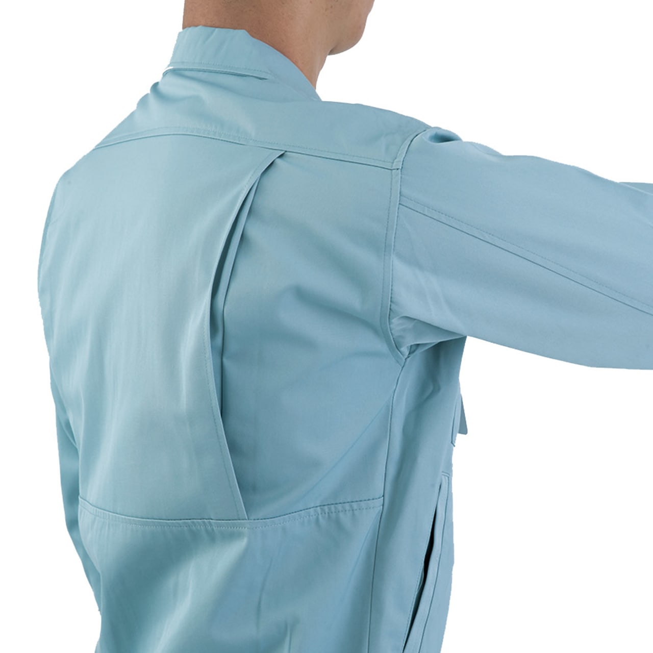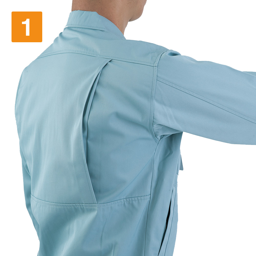 動きやすさに対するこだわりを感じるデザイン!機能的で無駄のない、ベーシックな見た目も好印象です。動きやすさをアシストするポイントは二つ、背中のノーフォーク仕様と腕から脇にかけてのバンザイカット。プリーツと立体的な生地のカッティングが、上半身の動きをしっかりサポートします。今回、スタッフが実際に着用してみました。腕の上げ下げや、前屈に肘の曲げ伸ばしなど、大きな動きも本当にスムーズです!体をフルに使う現場でも大活躍間違いなしの一着です。