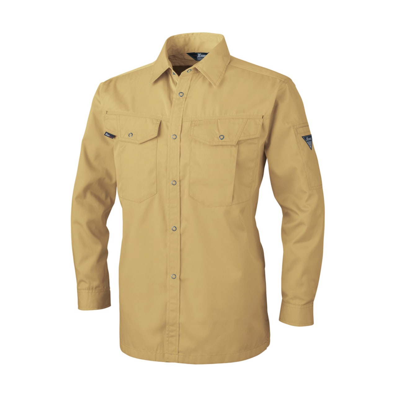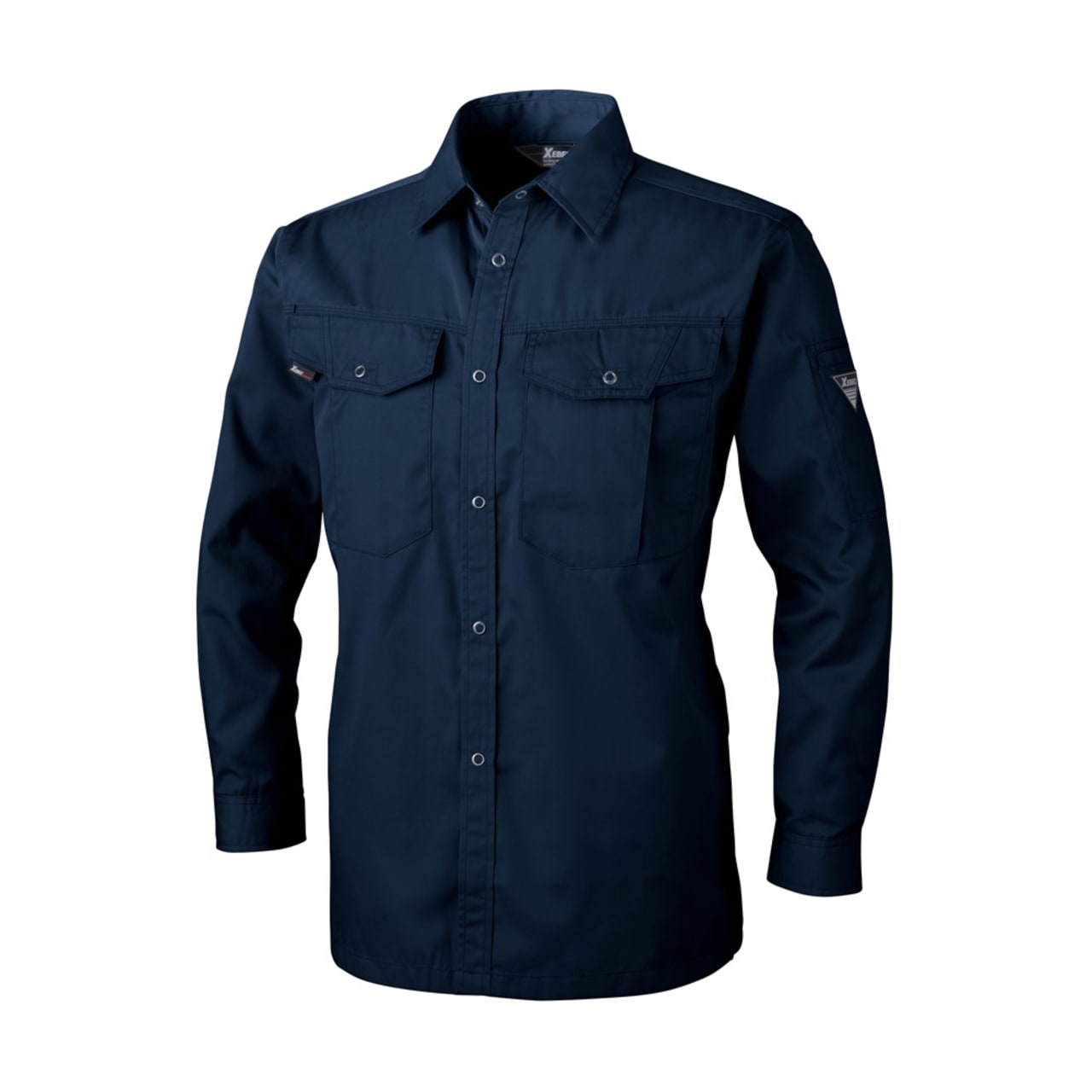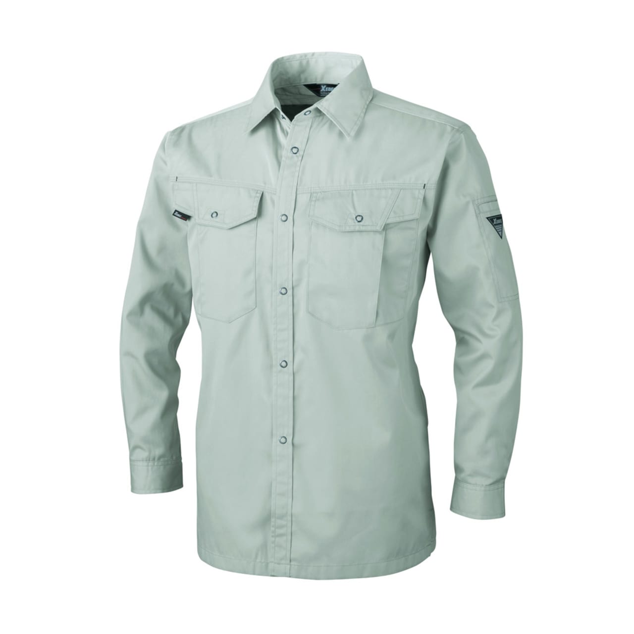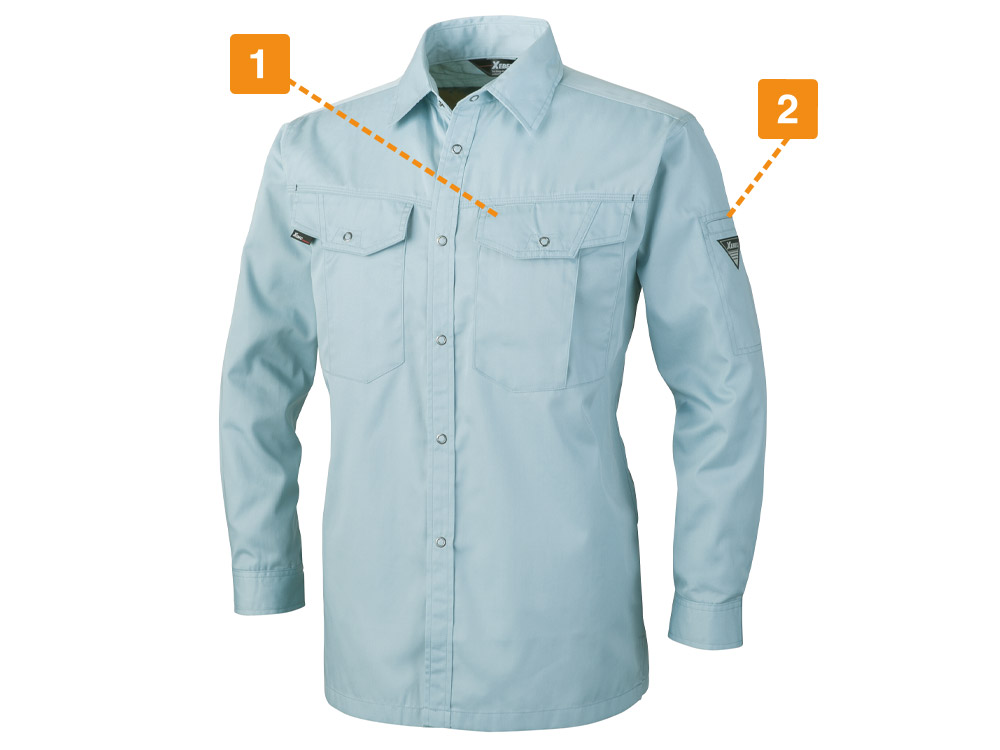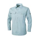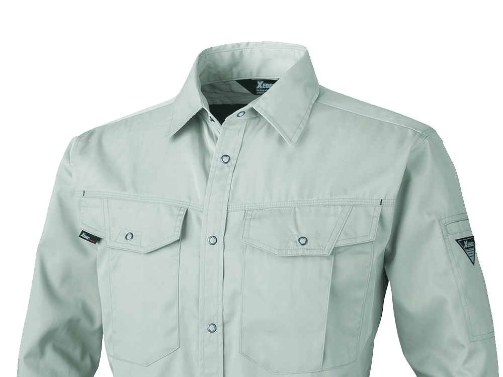 安定感のある定番デザインが、誠実な印象を与えてくれるシャツです。前面にはスナップボタンが採用されているので着脱も簡単。毎日の使用もノンストレスです。また、特筆すべきはその動きやすさ!今回実際に着用して、さまざまな動きを試してみました。腕の上げ下げや体のひねりなど、大きな動きでも布がつっぱりません。その秘密は、脇から腕にかけての特殊カッティング、バンザイカット。腕の動きを妨げず、自由な動きを可能にしてくれるんです。現場での大きな動きにも、しっかりと対応してくれそうな着用感でした。