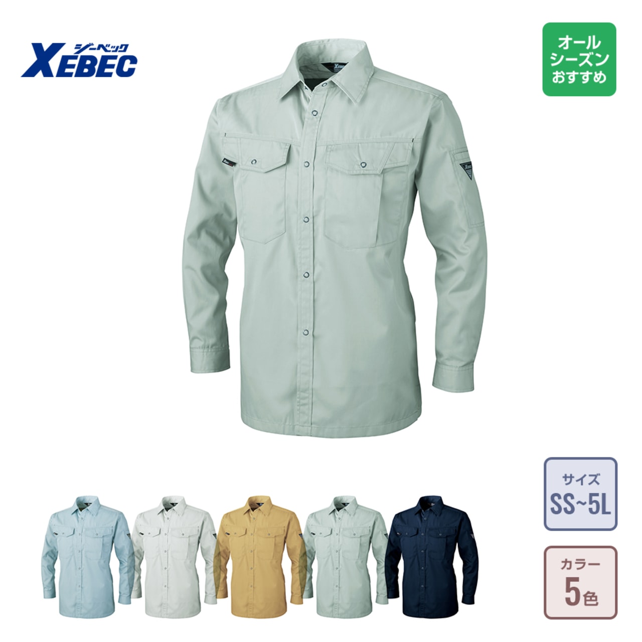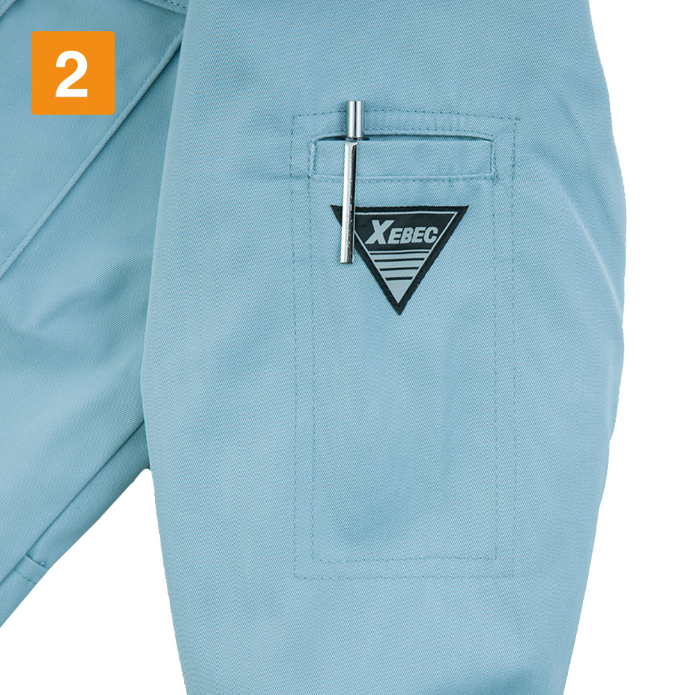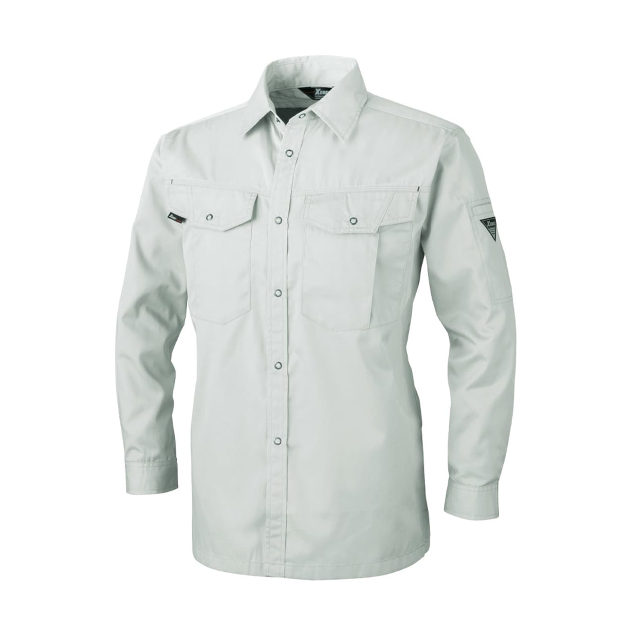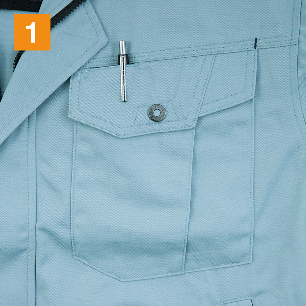 安定感のある定番デザインが、誠実な印象を与えてくれるシャツです。前面にはスナップボタンが採用されているので着脱も簡単。毎日の使用もノンストレスです。また、特筆すべきはその動きやすさ!今回実際に着用して、さまざまな動きを試してみました。腕の上げ下げや体のひねりなど、大きな動きでも布がつっぱりません。その秘密は、脇から腕にかけての特殊カッティング、バンザイカット。腕の動きを妨げず、自由な動きを可能にしてくれるんです。現場での大きな動きにも、しっかりと対応してくれそうな着用感でした。
