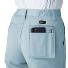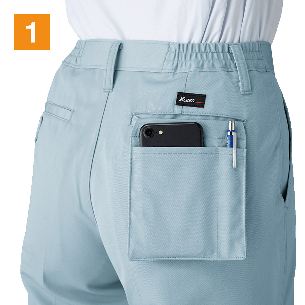 美しいシルエットはもちろん、作業着としての動きやすさにもしっかり配慮されています。タックがさりげなく取られているので、足さばきも楽々です。今回は実際に女性スタッフが着用してみました。屈伸や走るなどの動作もスムーズで、大きな動きもストレスなく行えます。またウエストのシャーリングがやさしくフィットして、着用感アップ!しゃがんだりしてもズボンに隙間が開かないので、見た目を気にせずアクティブにお仕事ができます。さらに好評だったのがべろポケ。ポーチがポケットから出てくる仕様で、体で携帯やメモが圧迫されずとても便利です。