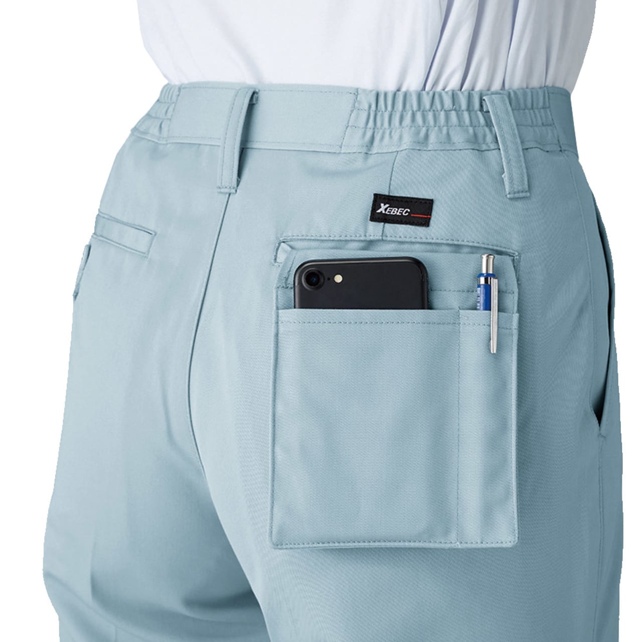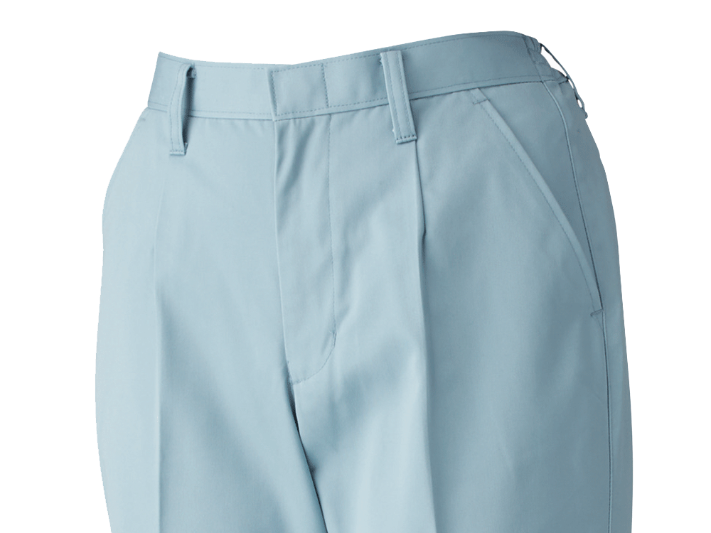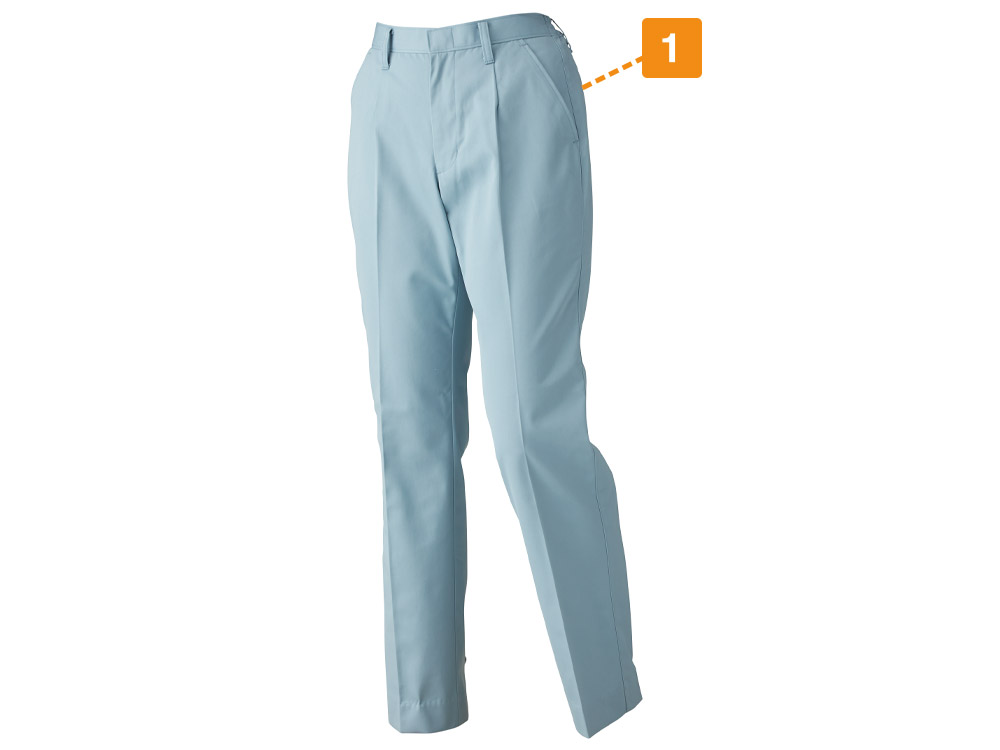 女性の働きやすさを第一に考えられたウェアです。本体に使用されているのは、とても丈夫なツイル素材。毎日の着用でもへたりにくく、含まれた綿によるなめらかな肌触りがストレスを軽減します。また撥水性能と帯電防止性能を備えているので、幅広い環境下で履ける一着に。収納面では、背面のビスポケットにべろポケを配置。ポケットの中から収納ポーチが出てきてぶら下げておけるので、座る・立つの繰り返しやしゃがんでの作業でも、ポケット内の物を痛める心配がありません。着用時の美しさのみならず、機能面でも妥協のないスラックスに仕上がっています。