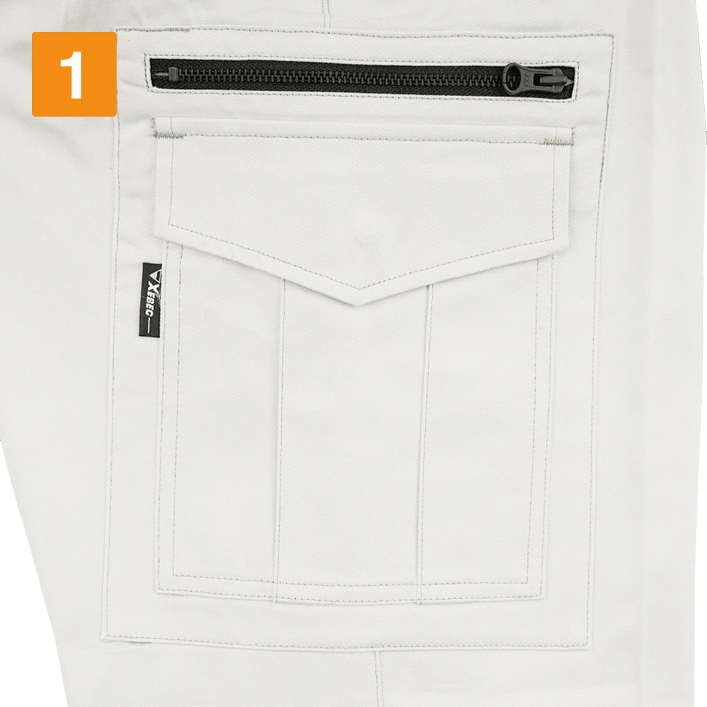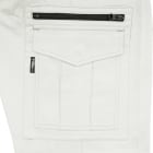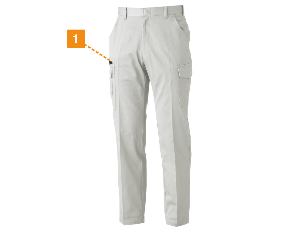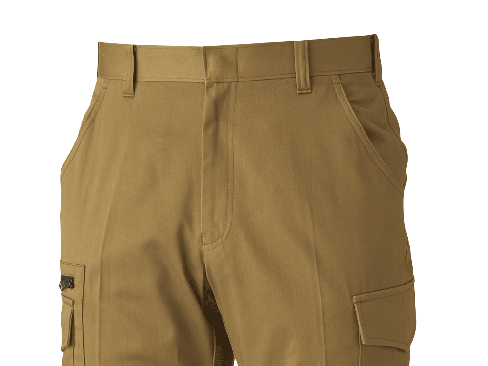 ルーズな印象を与えない、すっきりシルエットが魅力のズボン。生地の組み立てと、綿のやわらかさで作業着としての機動性を叶えつつ、脚にやさしくフィットする形状が人気の一本です。また、両ももと腰、背面に6つのポケットを備えているため収納力も抜群。もものラットポケットはプリーツ付きの大判デザインなので、携帯電話や手帳もすっぽりと収納可能です。また、フラップポケットやフロントのボタンが表に露出しないので、さらにシンプルで洗練された見た目に。金具で物を傷つけることもなく、快適な作業が可能です。