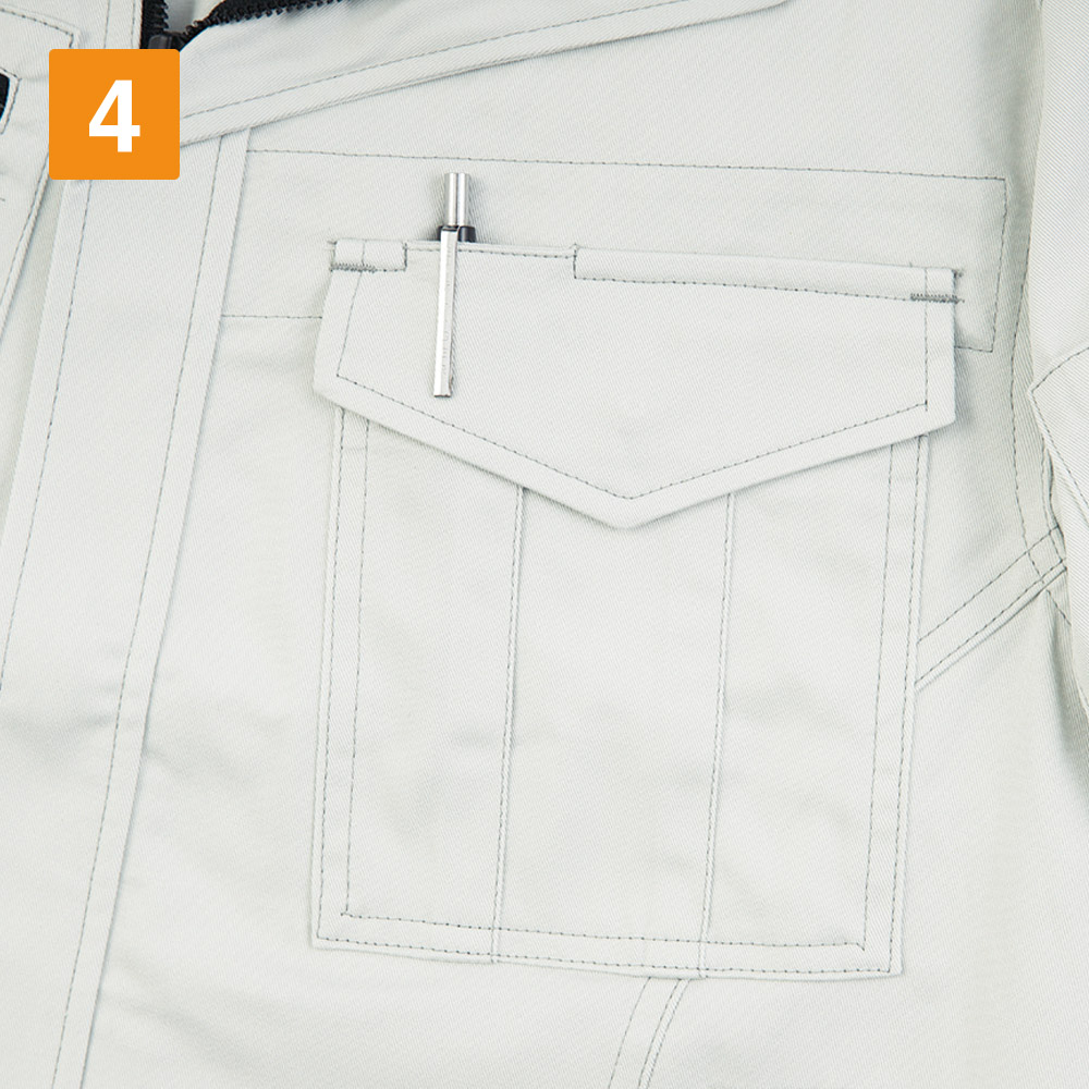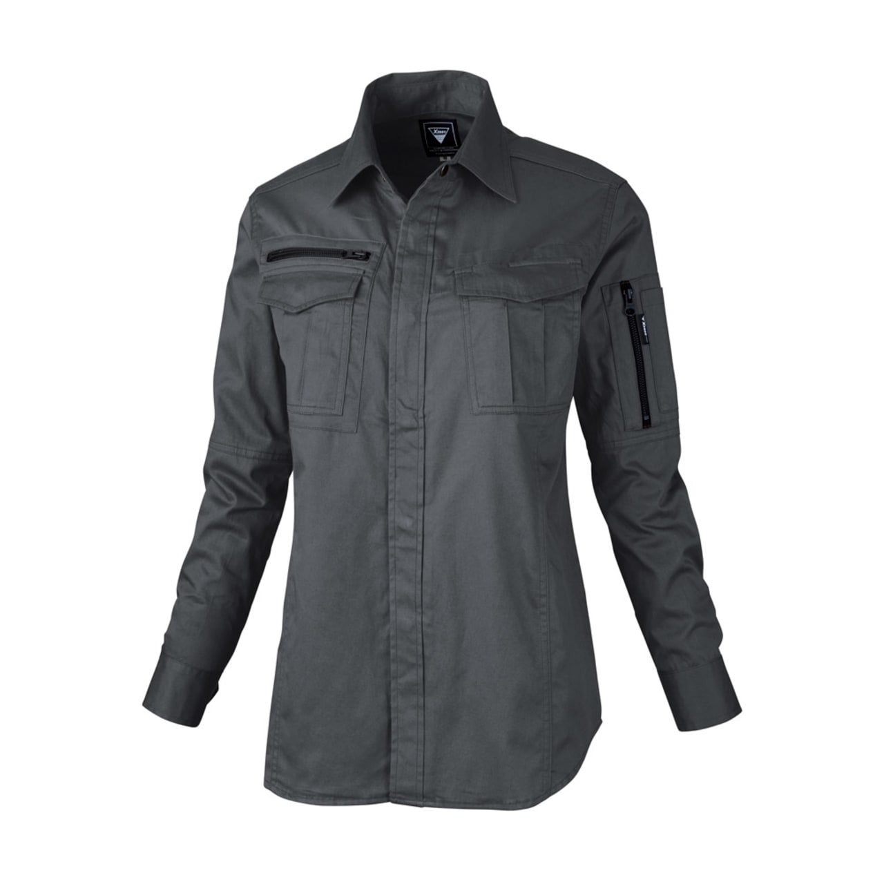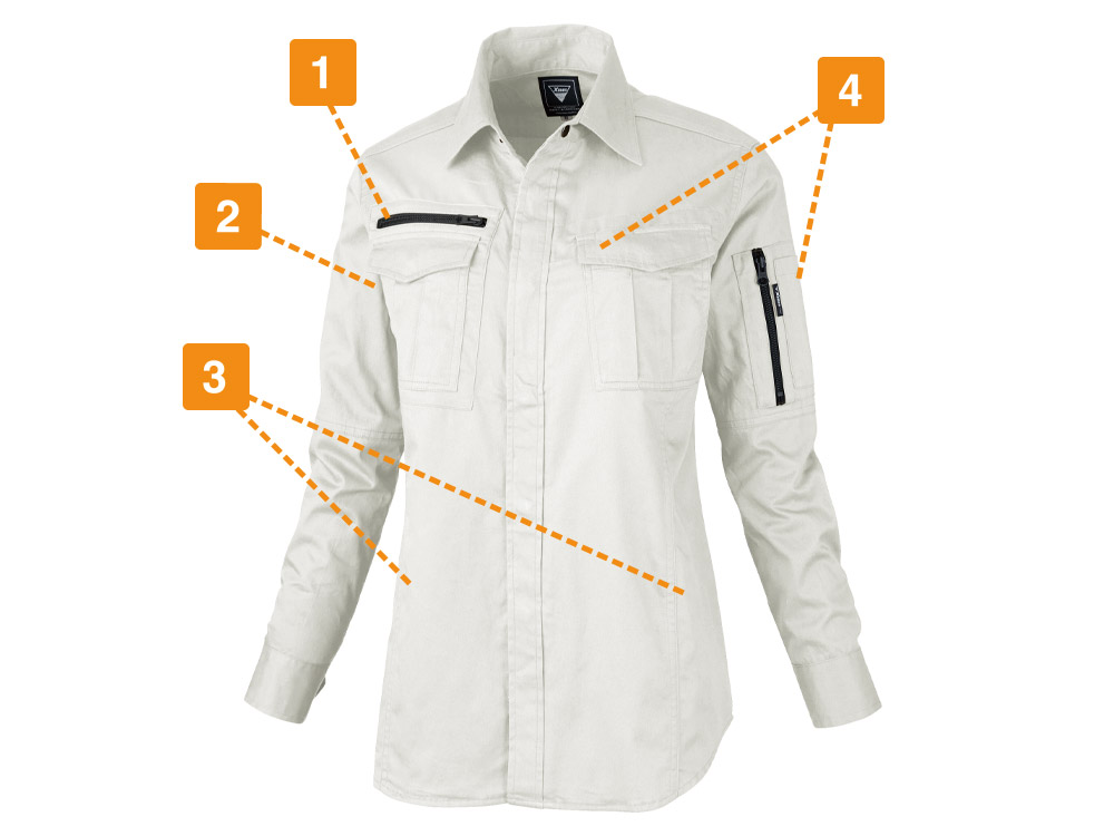 女性を美しく見せるシルエットもさることながら、ポケットまわりのデザインもとってもおしゃれなシャツです。ブラックのファスナーテープや、ポケットのプリーツ、ステッチなど細かなデザインが全体の印象をアップしてくれます。また機能面では脇に吸汗・消臭性能を備えたパッドが配置されているので、汗をかくお仕事も一日中快適に。薄手生地と相まって爽やかな着心地が続きます。毎日着る洋服として、心からおすすめできる優秀シャツです。