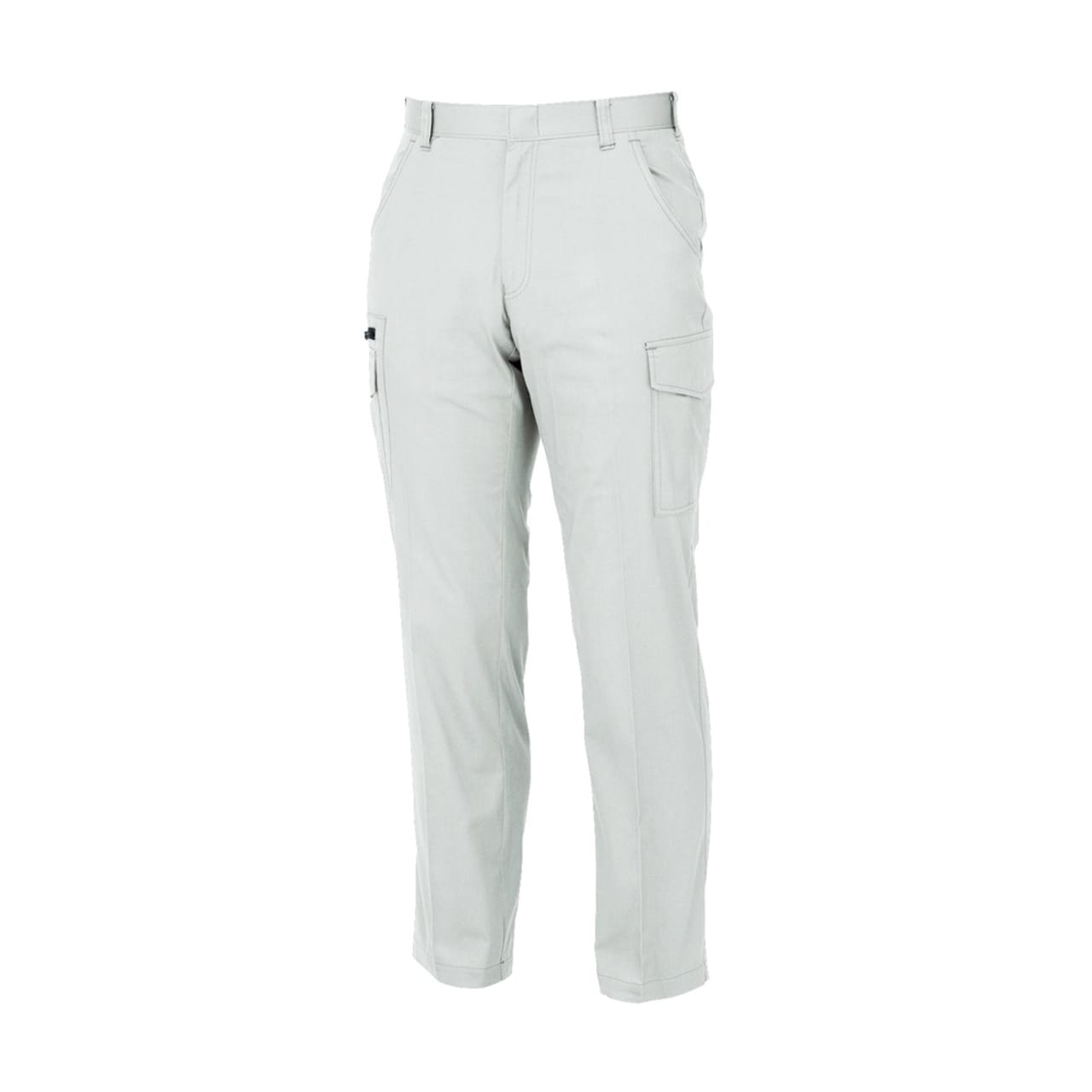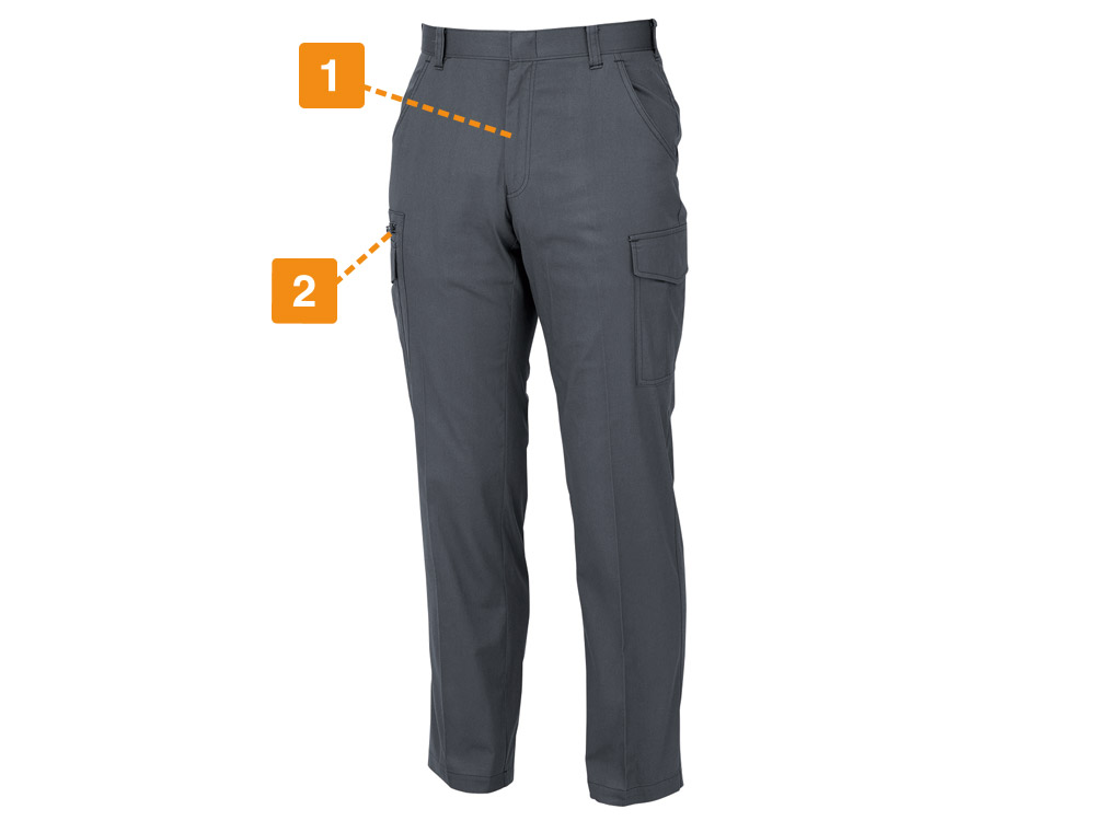すっきりしたシルエットもさることながら、ディテールのアクセントが光るズボンです。太もものブラックのファスナーテープが全体を引き締め、単調にさせないデザイン。ポケットまわりの特徴的なステッチやポケットのプリーツが、ワーク感あふれる雰囲気を醸し出します。また適度なゆとりを持ちながら体に沿う形状が、タックなしでも快適な動作をアシスト。体に合った服でお仕事することは、作業効率のアップにも効果的です。デザイン面でも着ていて気分のあがるズボンに仕上がっています。