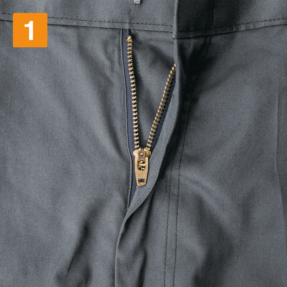 タックがなくスマートながらも、動きやすさをしっかり考慮した設計です。実際に着用してみましたが、そのやわらかな肌触りと適度なゆとりで圧迫感を感じません。デスクワークから現場作業まで、さまざまな環境で履いていただける一本です。また、徹底的にシンプルさを追求したデザインがポイント。フロントボタンが露出しないので、見た目がすっきりするとともに、運搬の際などに物を傷つける心配がありません。まさに機能美を感じる、こだわりがあふれたスラックスです。
