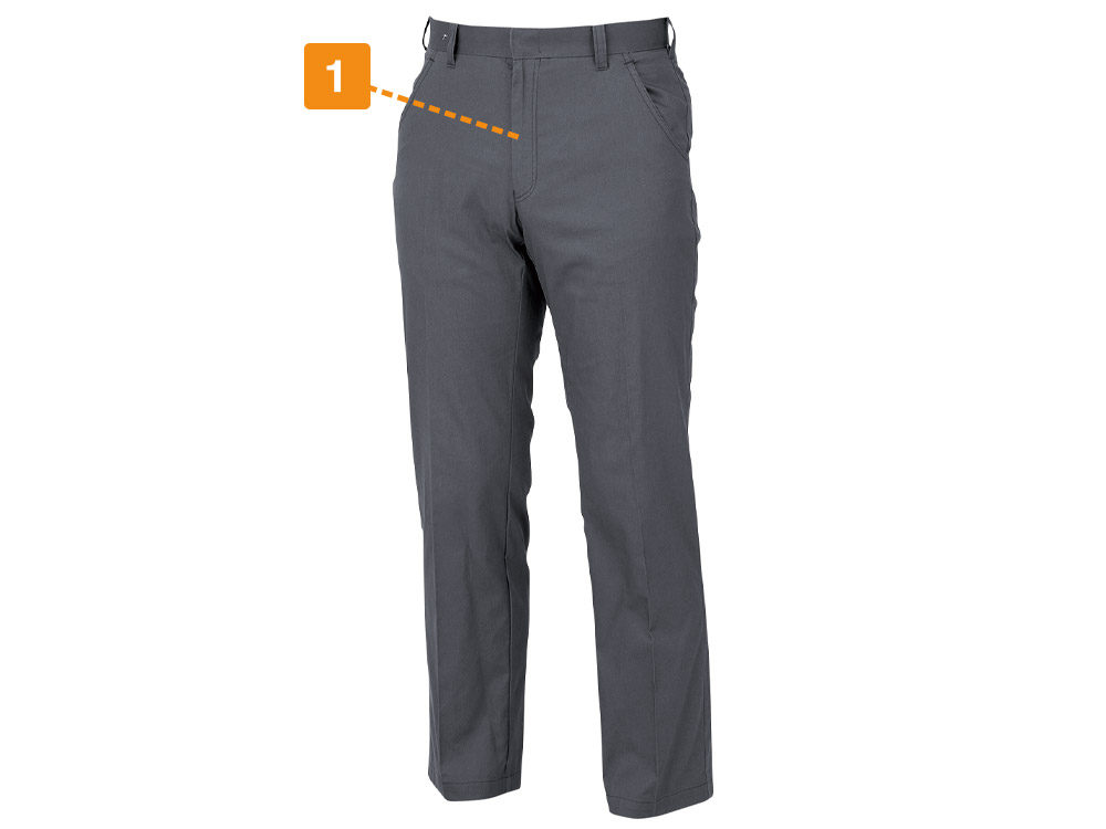 シルエットに定評のあるパンツ。タックが取られていないことでだぶつかず、スマートな印象を与えてくれます。ベーシックデザインなのであわせるものを選ばず、同シリーズのシャツやブルゾンはもちろんのこと、ワイシャツやネクタイなどとも好相性。さまざまなお仕事シーンで着用いただける一本に仕上がっています。収納面では脇に2カ所と背面に2カ所のベーシックなポケットを配置。ハンカチや携帯電話などの必需品をしっかり収納できます。無駄がないからこその使い勝手で選ばれている、汎用性の高いウェアです。