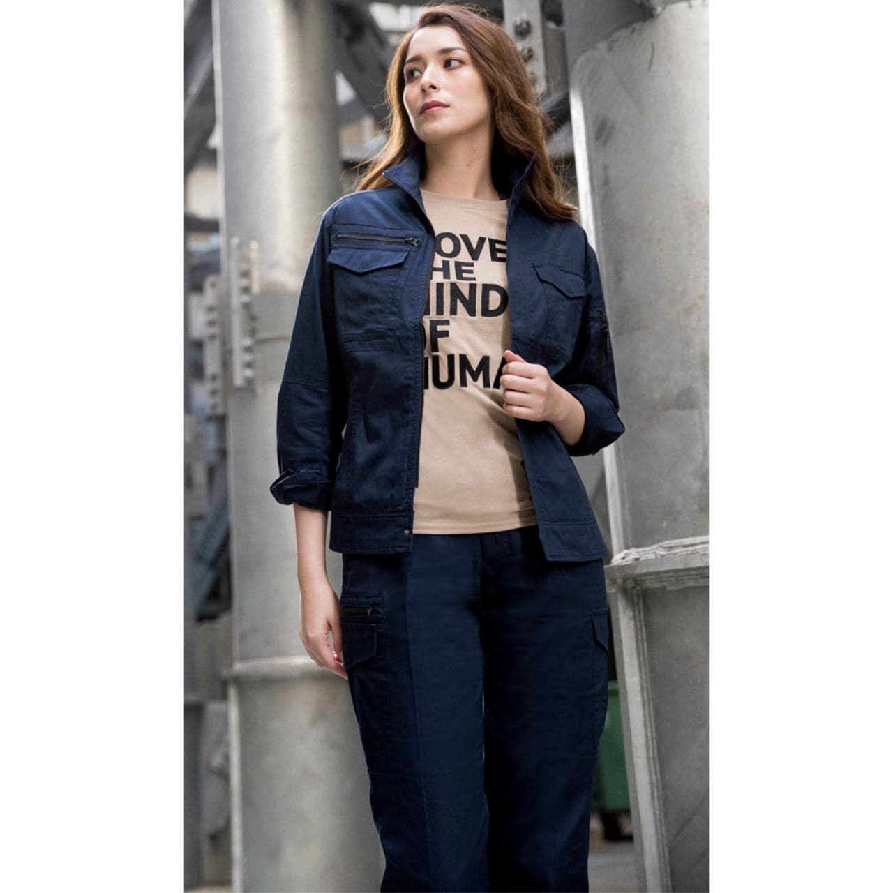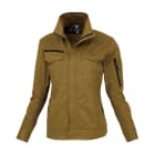こだわり抜かれた形状のデザインが、女性の作業姿をとことん美しく見せてくれます。ウエストまわりは少し絞られているためすっきりと、逆に腰骨のあたりに向けてフレアになっているのが特長です。適度なゆとりがあるので動きやすさも抜群。布が余ったり逆につっぱることもないので、大きく体を動かす時も妨げになりせん。また、スタンドカラーがよりスマートな印象に。お仕事姿をかっこよく演出し、ラフすぎず幅広いお仕事シーンで着用いただけるブルゾンに仕上がっています。