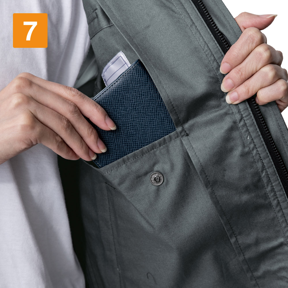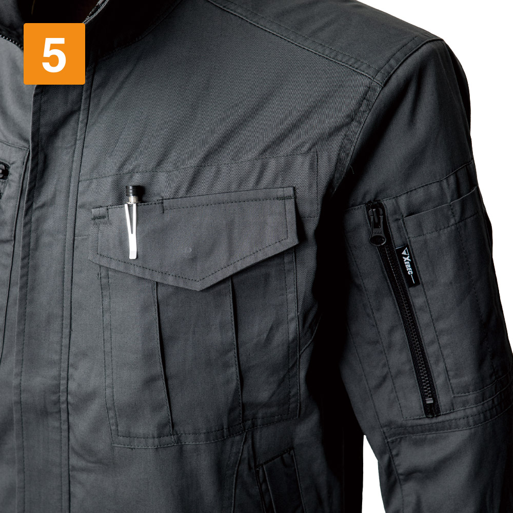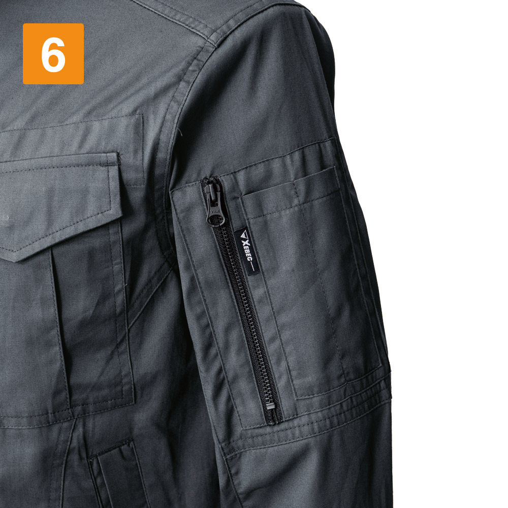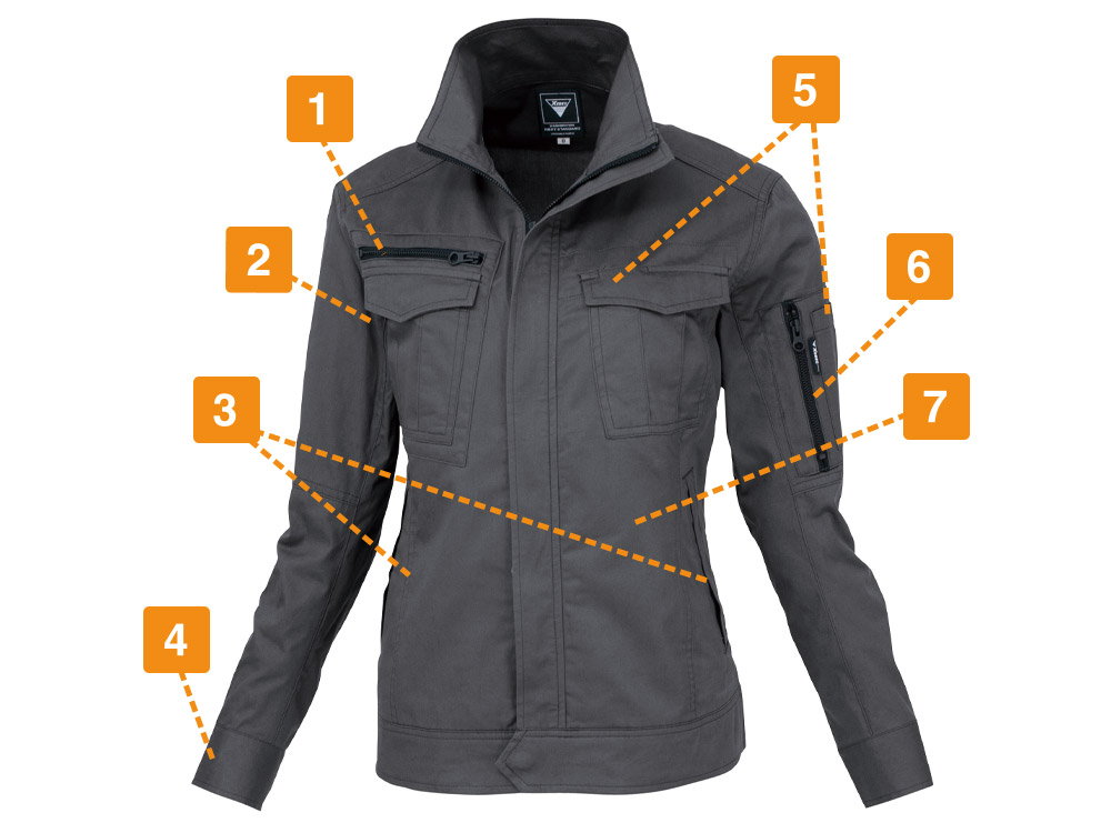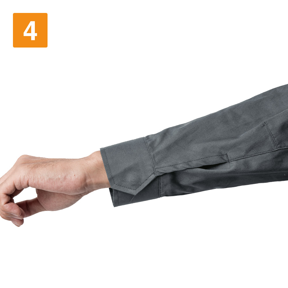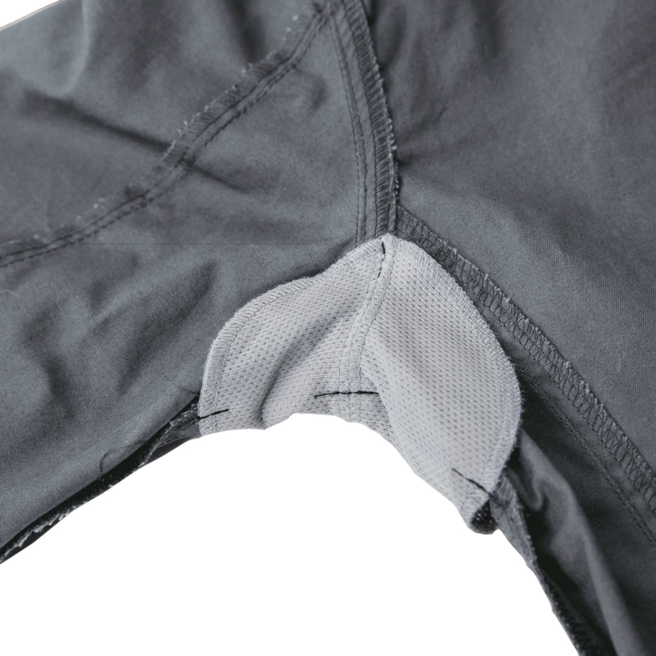 シンプルなデザインながら、あちこちに散りばめられたアクセントが光ります。胸と袖のブラックカラーのファスナーテープが全体を引き締まった印象にしてくれます。またボタンが露出しないデザインなので、見た目のすっきり感がアップするとともに、運搬の際など物を傷つける心配もありません。さらにポケットまわりのステッチなど、全体を単調にしない工夫も。機能面では脇に吸汗・消臭機能を備えたパッドが配置されており、暑くても長袖必須の環境下でも長時間快適にお過ごしいただけます。