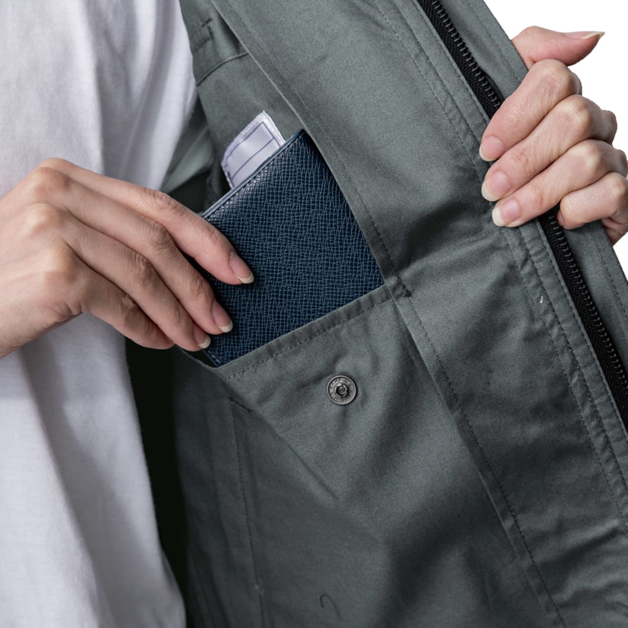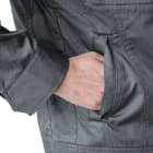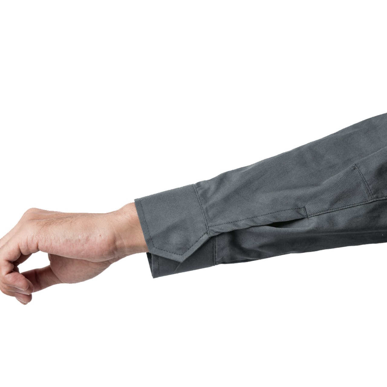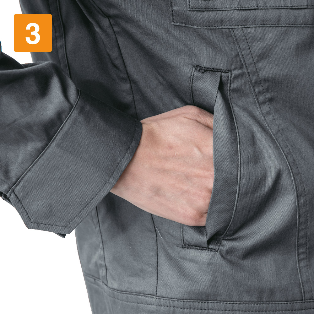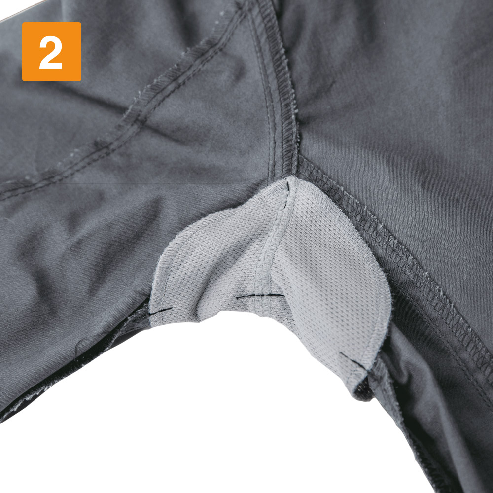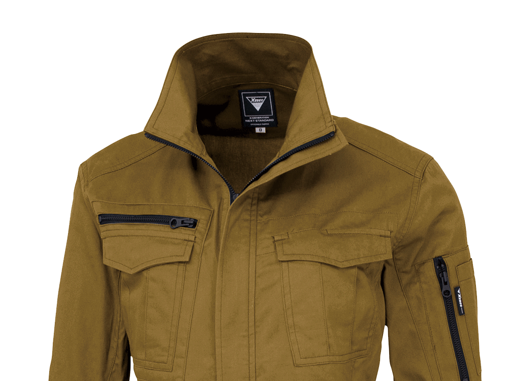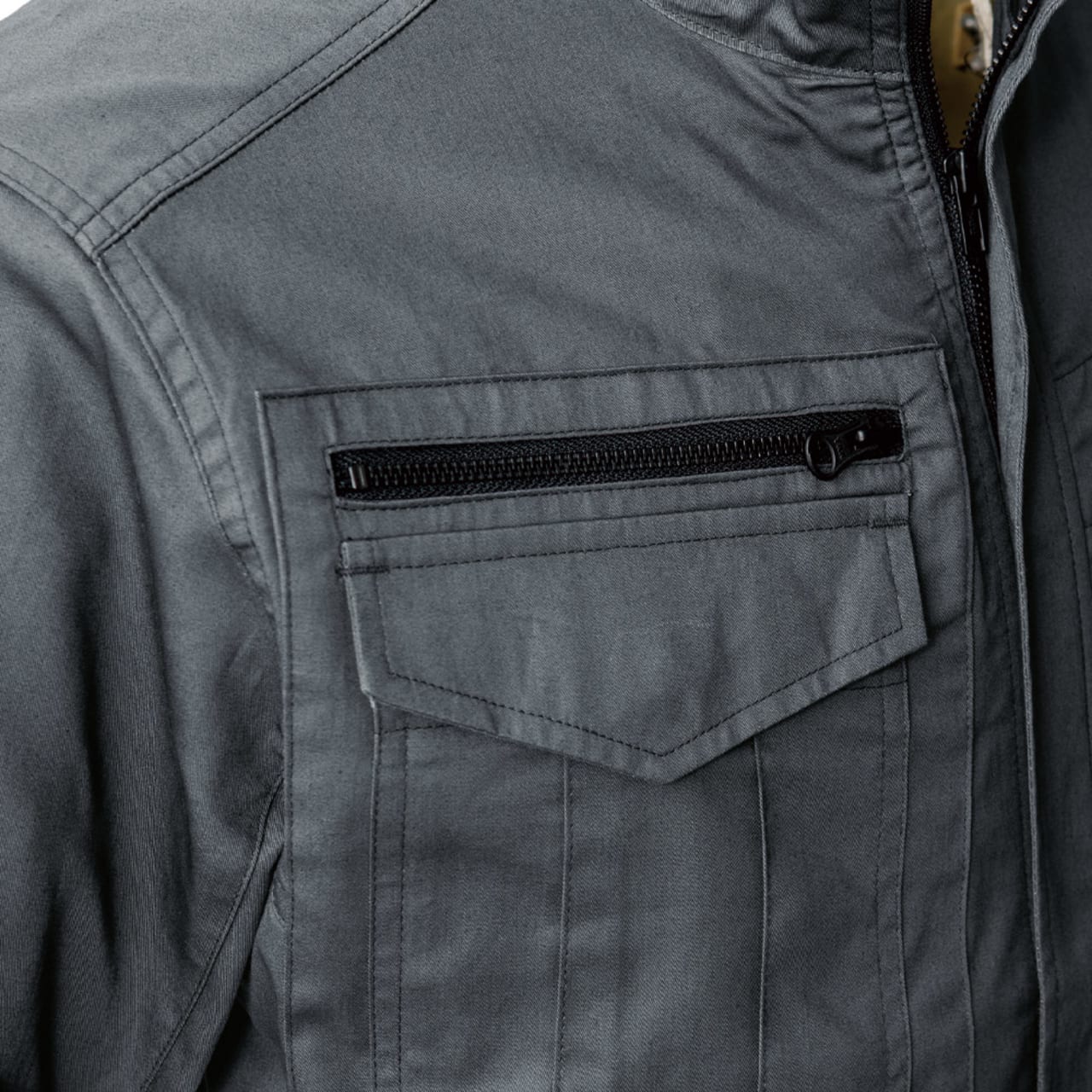 シンプルなデザインながら、あちこちに散りばめられたアクセントが光ります。胸と袖のブラックカラーのファスナーテープが全体を引き締まった印象にしてくれます。またボタンが露出しないデザインなので、見た目のすっきり感がアップするとともに、運搬の際など物を傷つける心配もありません。さらにポケットまわりのステッチなど、全体を単調にしない工夫も。機能面では脇に吸汗・消臭機能を備えたパッドが配置されており、暑くても長袖必須の環境下でも長時間快適にお過ごしいただけます。