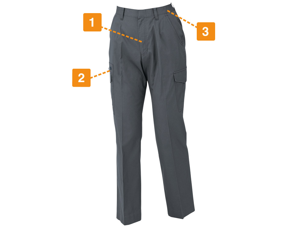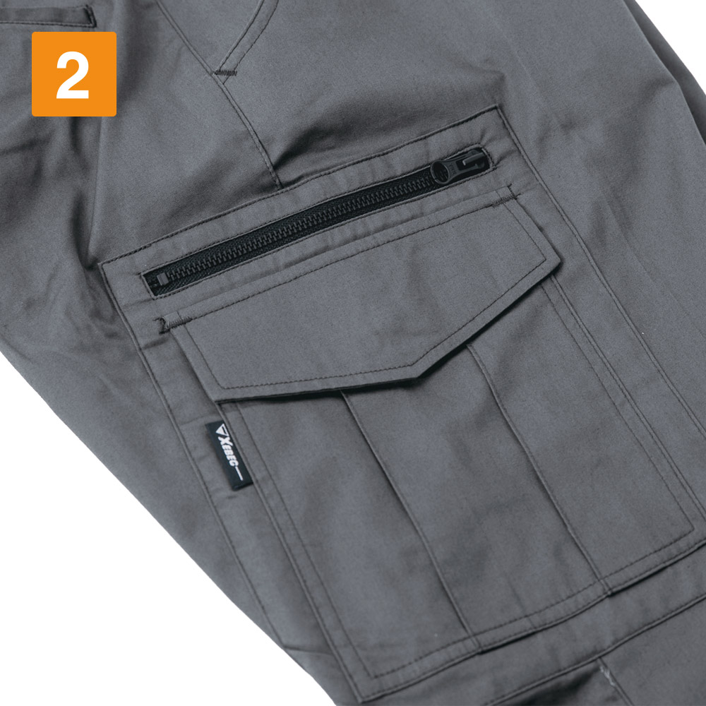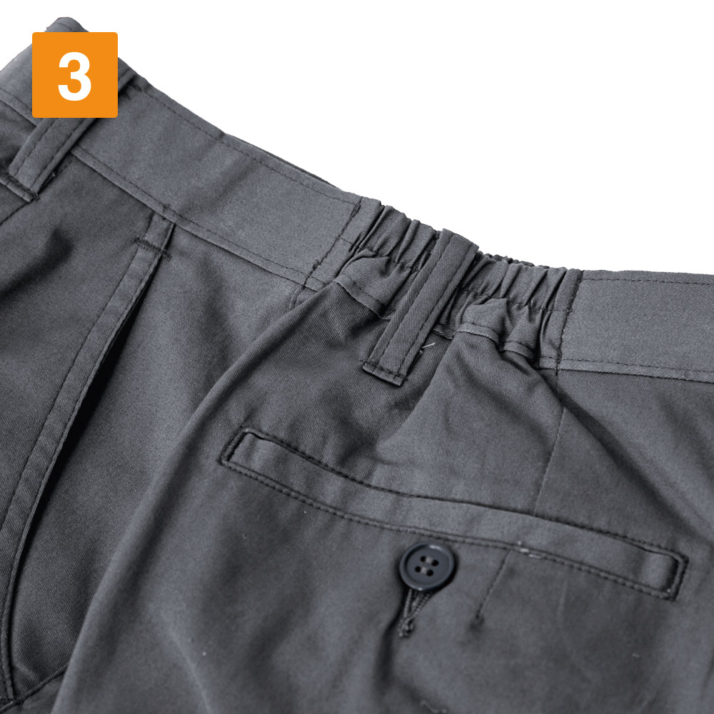 まず目が行くのがそのファスナーテープ。太ももポケットに使用されているブラックカラーのテープがとてもかっこいいです。全体の印象を引き締めつつ、中のものを落下させない機能性も備えています。さらにポケットまわりのステッチがズボンのこなれた雰囲気を演出しています。また、ウエストのシャーリングもポイント。腰にやさしくフィットしてスマートなシルエットを作りながら、しゃがんでも隙間が空かないなど、快適性への配慮もしっかりと。ディテールが持つ機能と美しさがズボンとしての格を上げてくれている、そんな印象のズボンです。