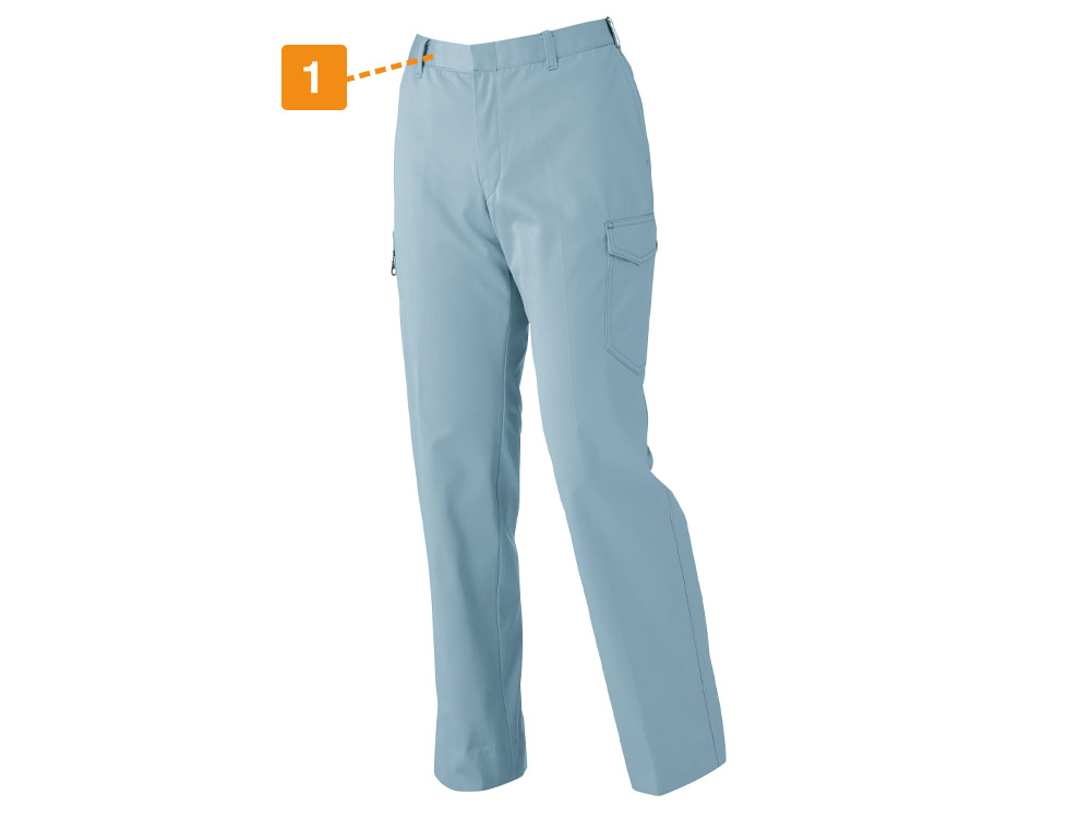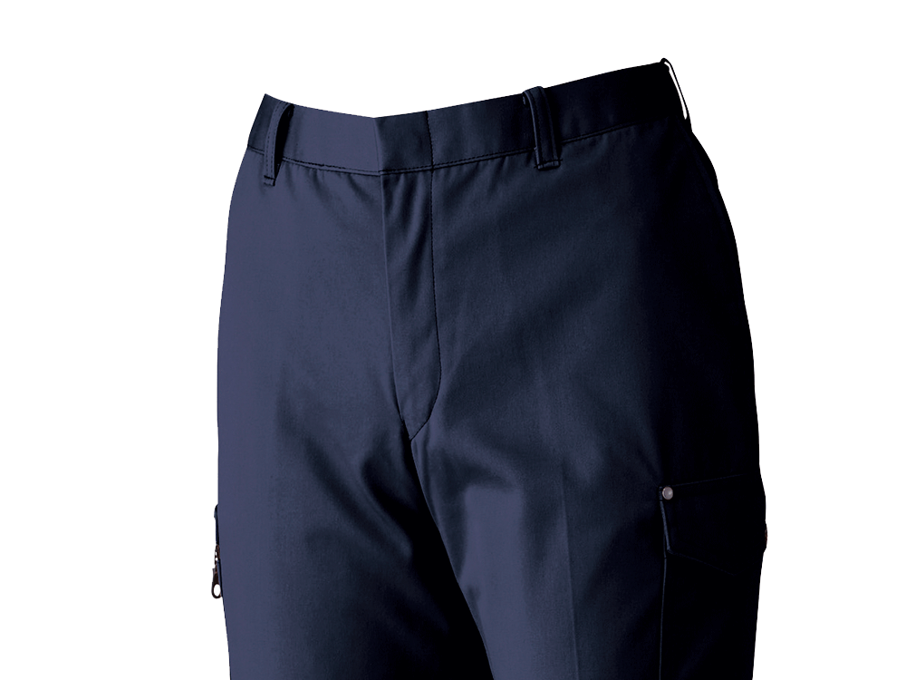 女性の働きやすさが考え抜かれたズボンです。タックをなくしたすっきりデザインながら、太ももまわりに適度なゆとりを持たせた立体的な設計を採用。逆にウエストはやさしくフィットしてくれるので、男女兼用ズボンでありがちな「太ももに合わせるとウエストがゆるゆる」といったこともありません。体にフィットするお洋服の着用は、作業性アップにもつながる大切なこと。デスクワークから現場作業まで、毎日のお仕事をとても快適にしてくれる一本です。