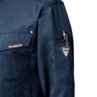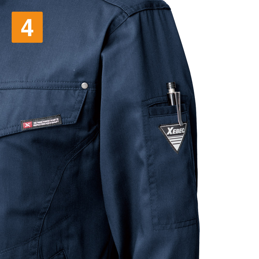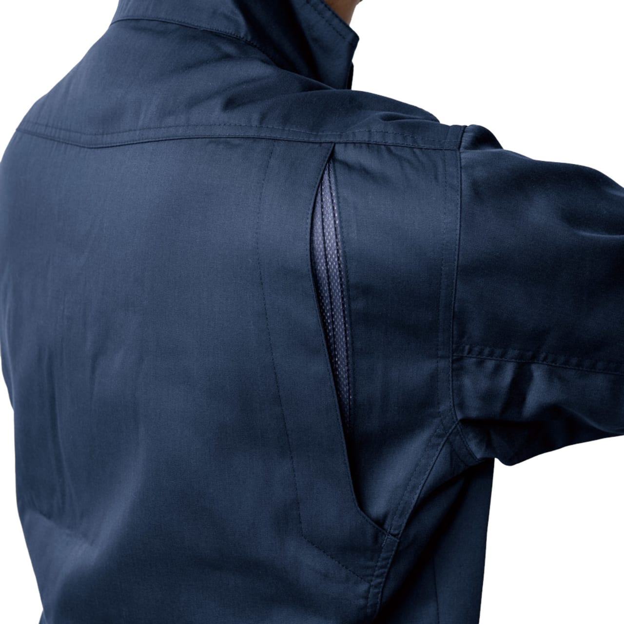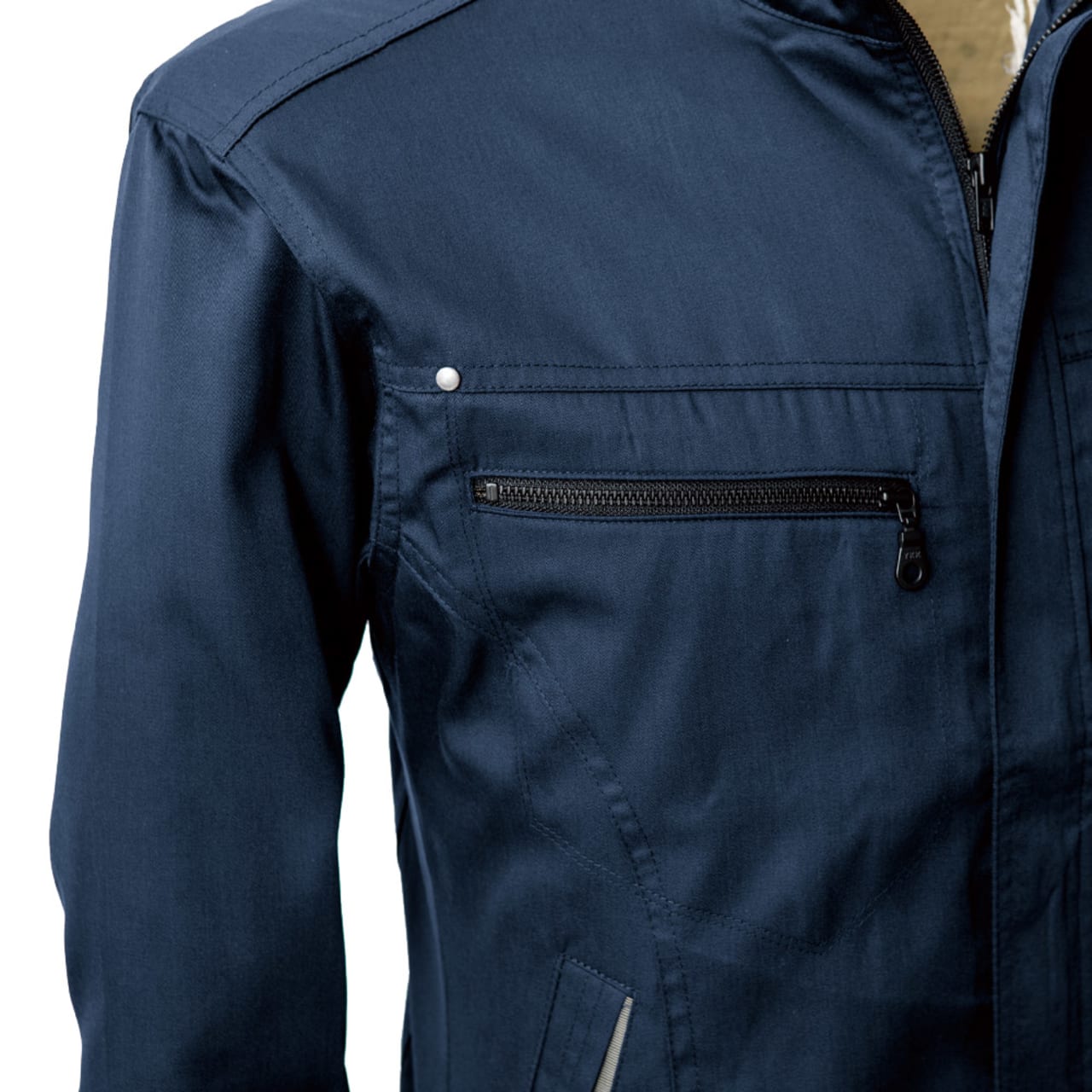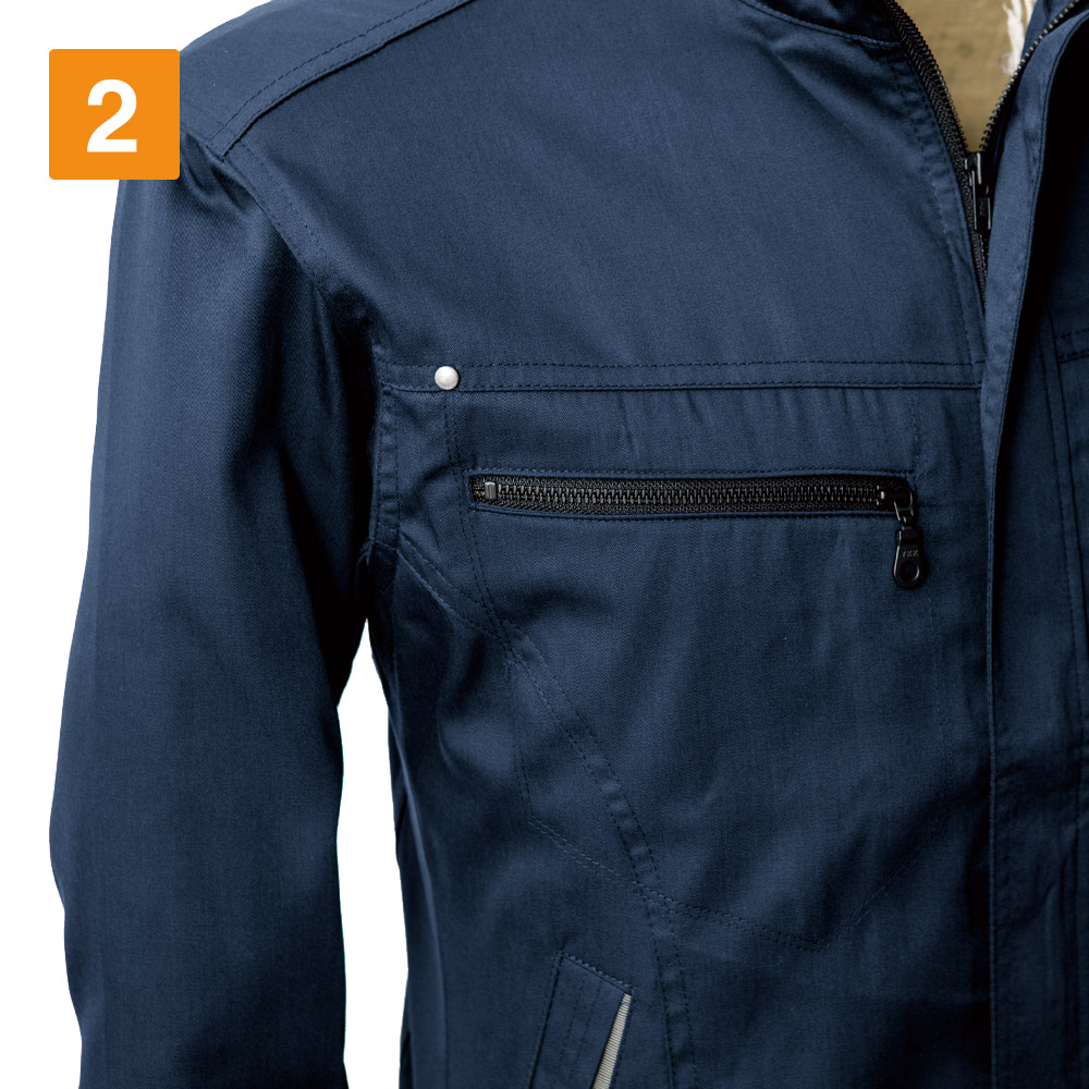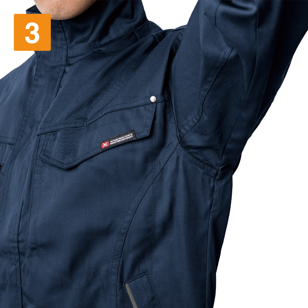 スタッフの中では、特に着用時のスタイリッシュさが好評でした。野暮ったくならない、すっきりとしたシルエットがとても姿をかっこよく見せてくれます。さらにリベットやロゴ、ブラックカラーのファスナーなど、こだわりのディテールが全体の印象を格上げ。前面だけでなく、ステッチやプリーツ、両サイドのアジャスターといった、360°どこから見てもスマートな作業姿が実現します。ユニフォームとして洗練された組織イメージの表現にもおすすめです。