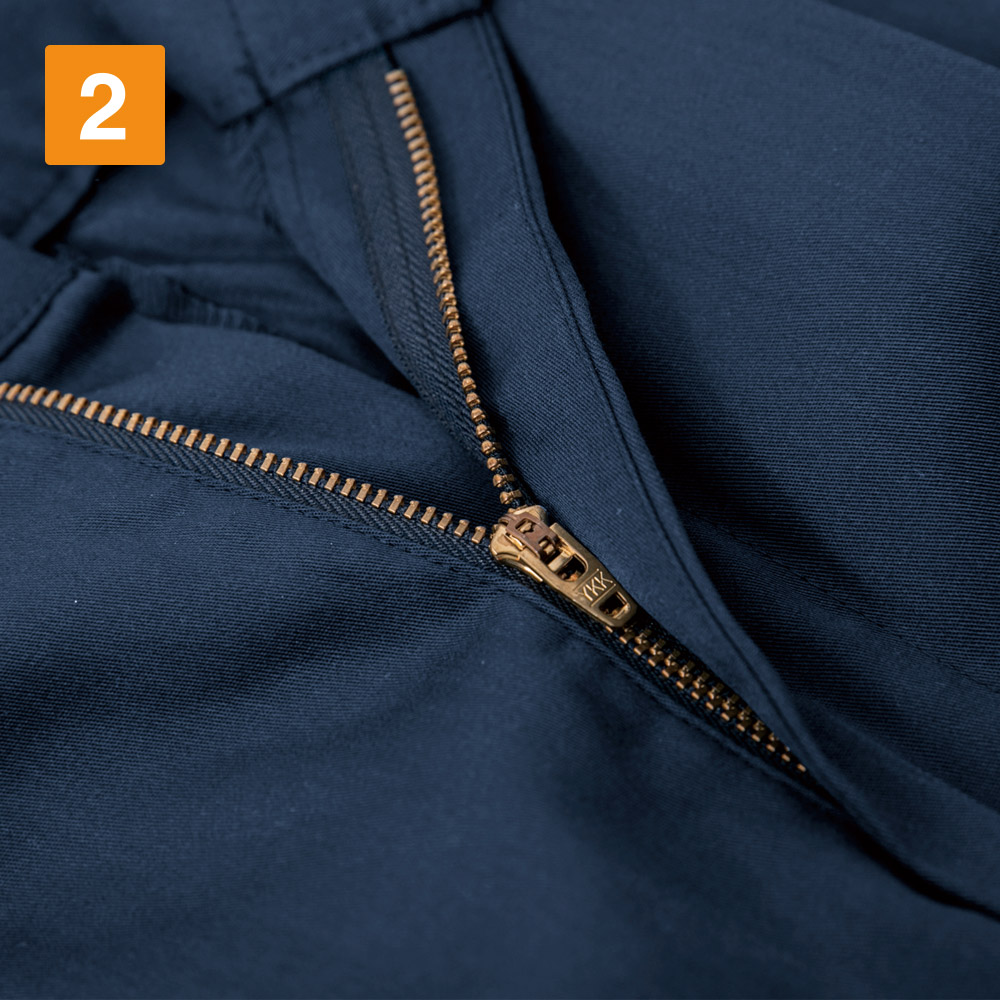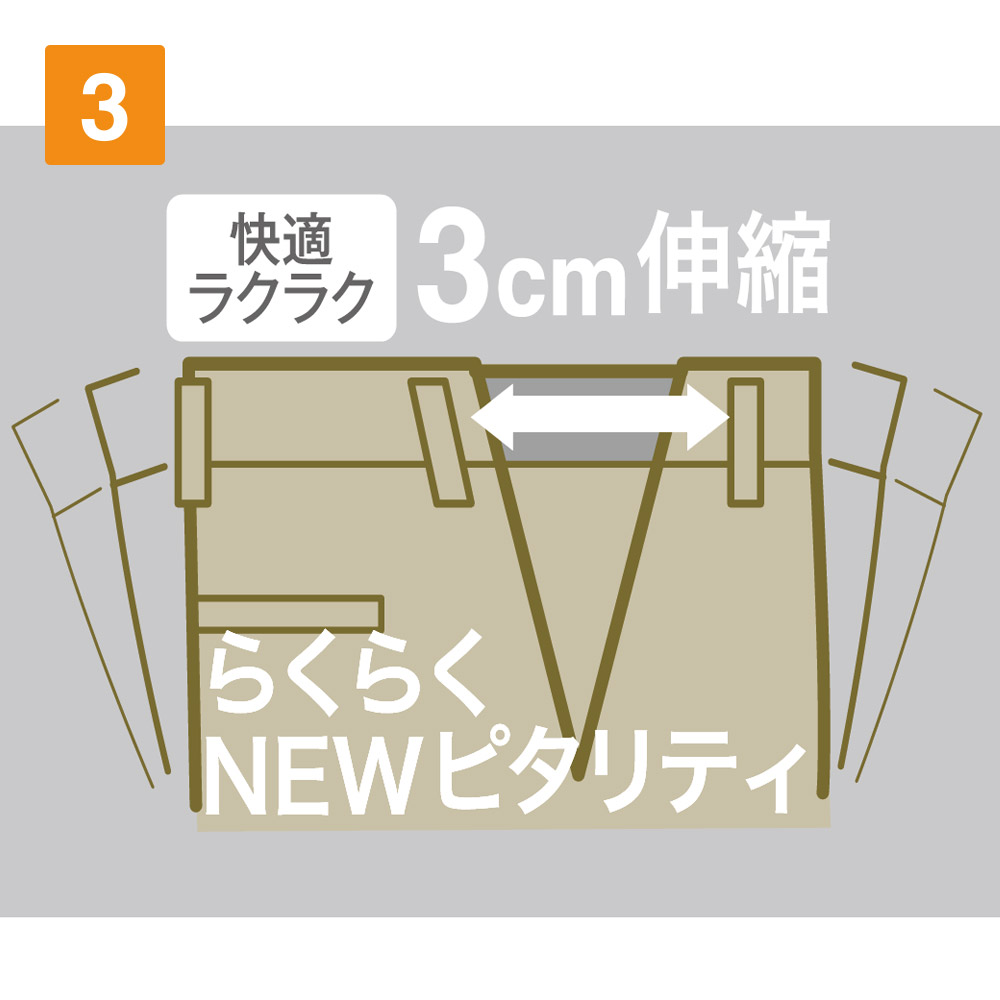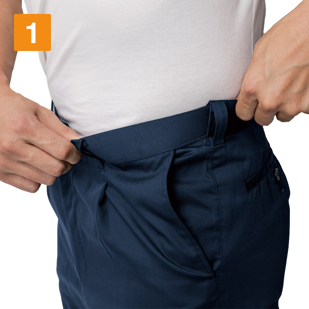 毎日の動きをストレスなく行える工夫にあふれた一本。ウエストまわりの構造が快適な着用感を実現します。ウエストはシャーリングなしのスマートな見た目がポイント。そこにウエスト内部にゴムを設けた、NEWピタリティ仕様を採用することで驚きの伸縮性を両立しています。タックが取られているので、太ももまわりにもほどよいゆとりがあり、脚さばきもらくらく。スマートなルックスながら、現場作業など大きく体を動かすお仕事にもぴったりの一本です。
