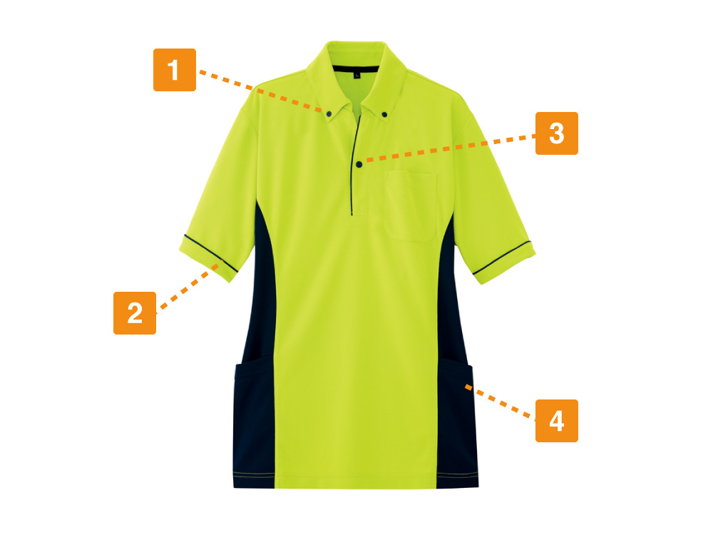半袖ポロシャツは、汗をかくシーンでも快適でいられるアイテムです。素材はダンボールニットで収縮性があり動きやすく、ポリエステル100%。おすすめシーンは秋冬ですが、幅広いシーズンで使用可能です。シャツの色は目立ちやすい色のため、スタッフの存在を知らせたい場合に向いているでしょう。ライムやオレンジは、遠くから見てもスタッフがいることがわかります。目立つ色のシャツは、接客が必要なシーンや、スタッフの安全を確保したい場合にもおすすめです。サイドポケットは、素早い作業に役立つでしょう。作業中に携帯電話をよく使うシーンや、メモを取る必要がある際に向いています。