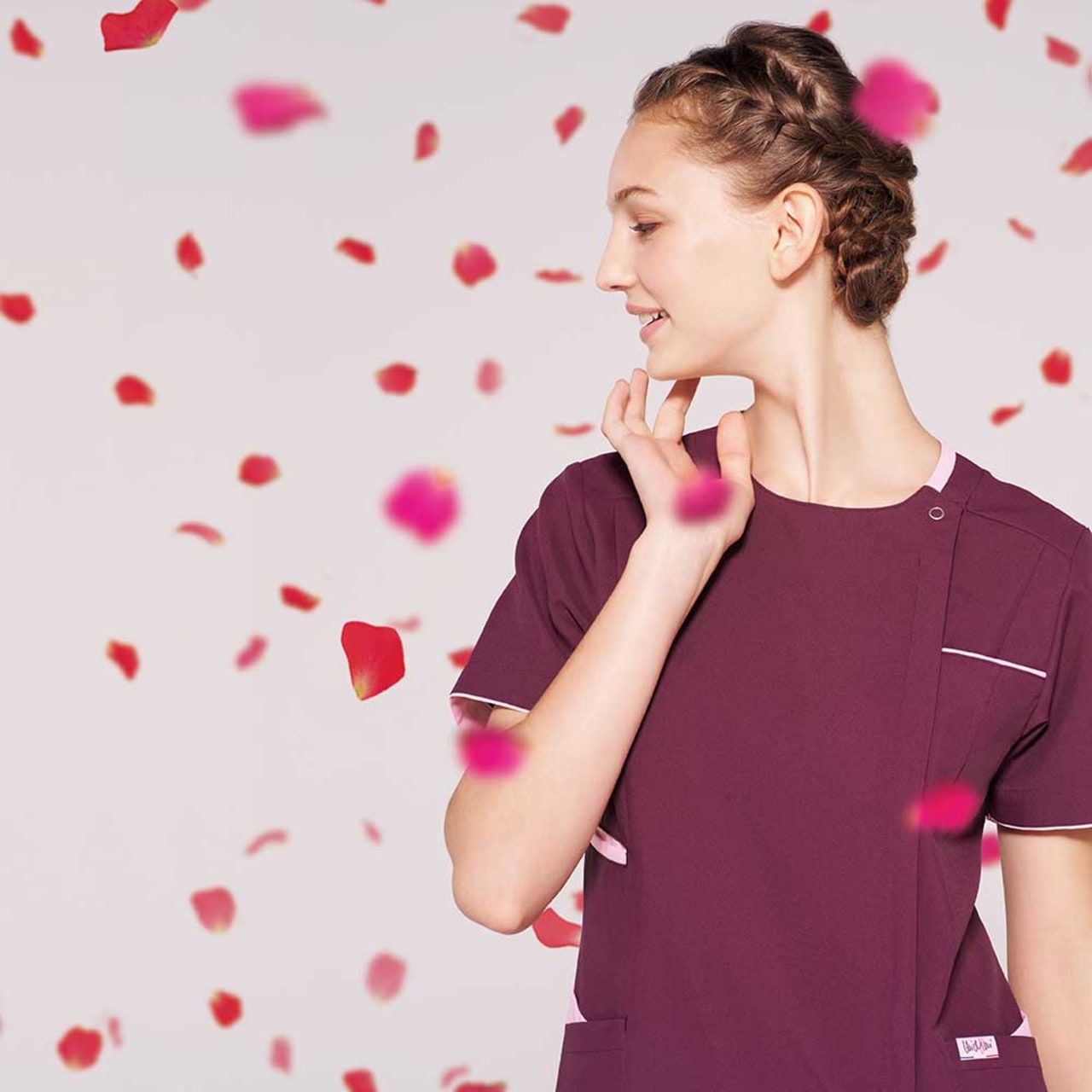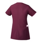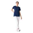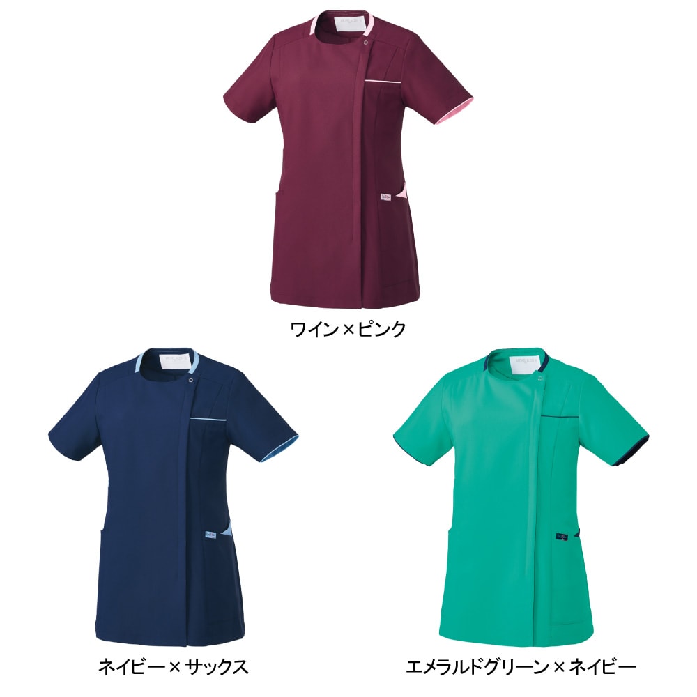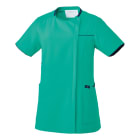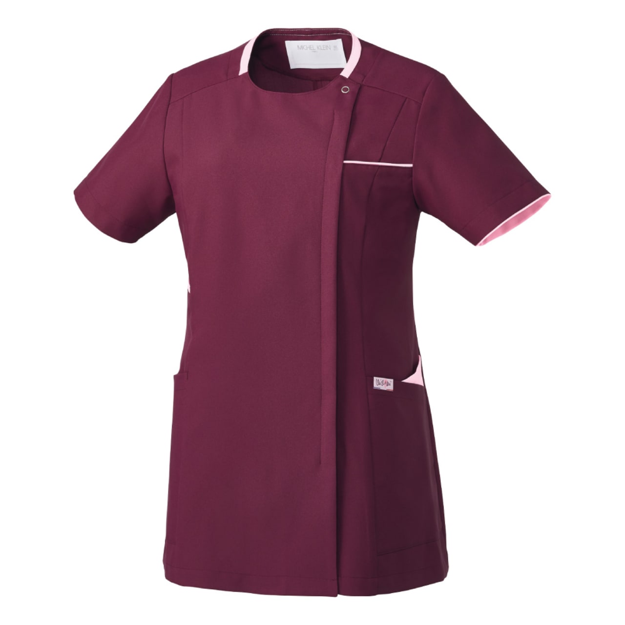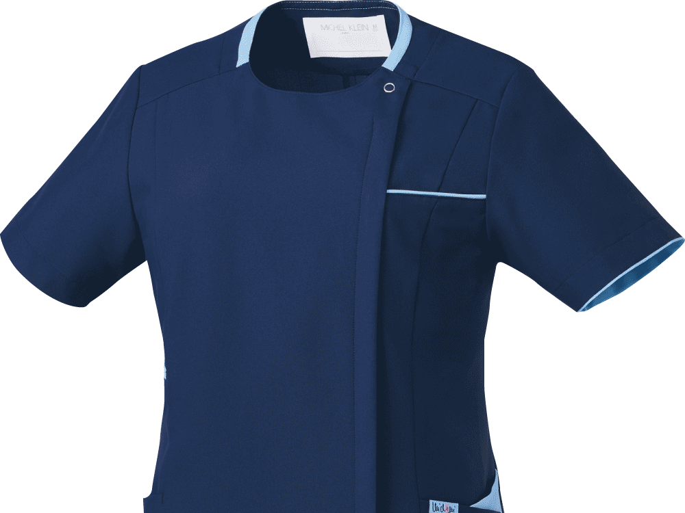 襟元と左胸・ポケットにあしらわれた繊細な配色が上品な「ミッシェルクラン」のスクラブです。こちらの商品はファスナー開きなので、脱着時にメイク崩れやヘアスタイルの乱れも気になりません。また、SEK(赤)認証の制菌加工が施されているので、繊維上の細菌の増殖を抑制し、おしゃれなだけでなく、機能性も十分です。
