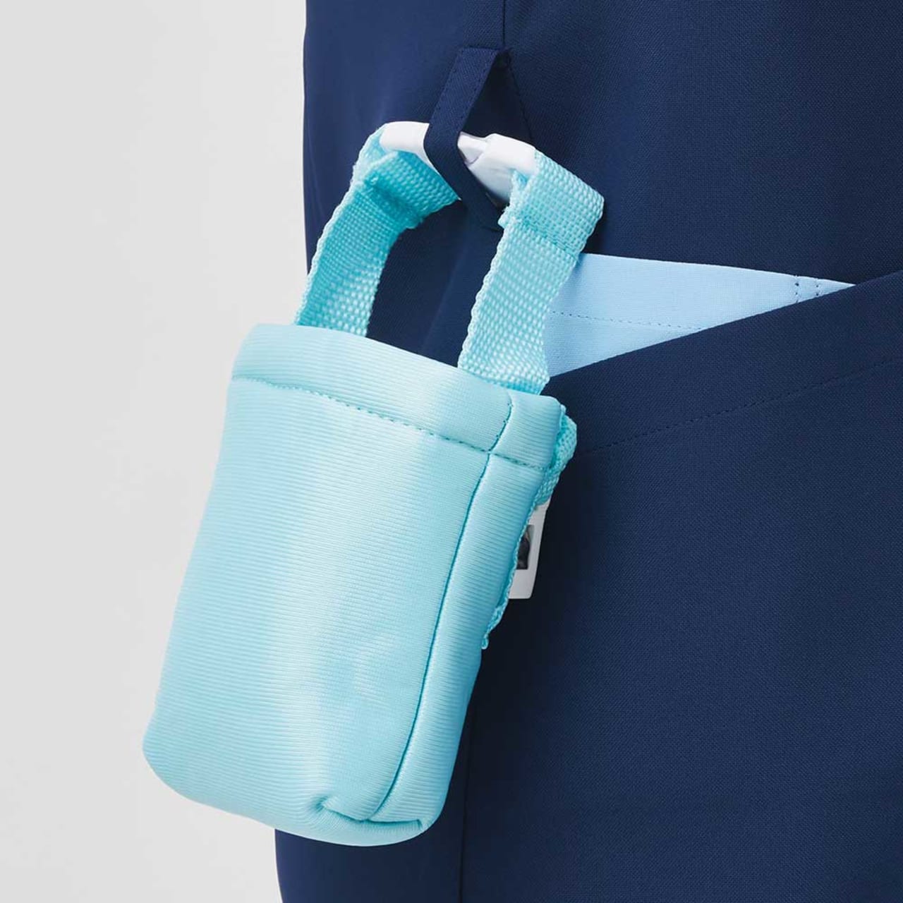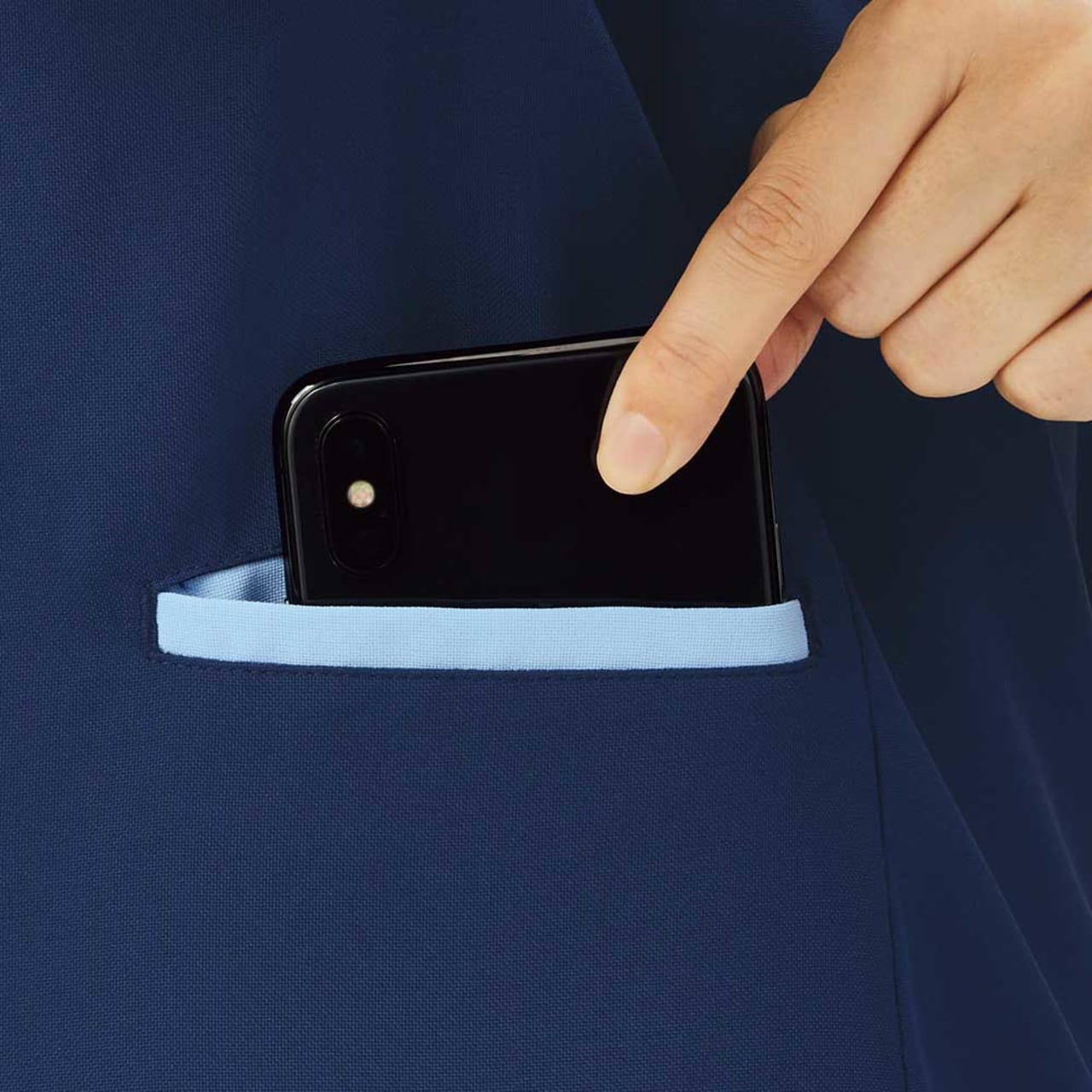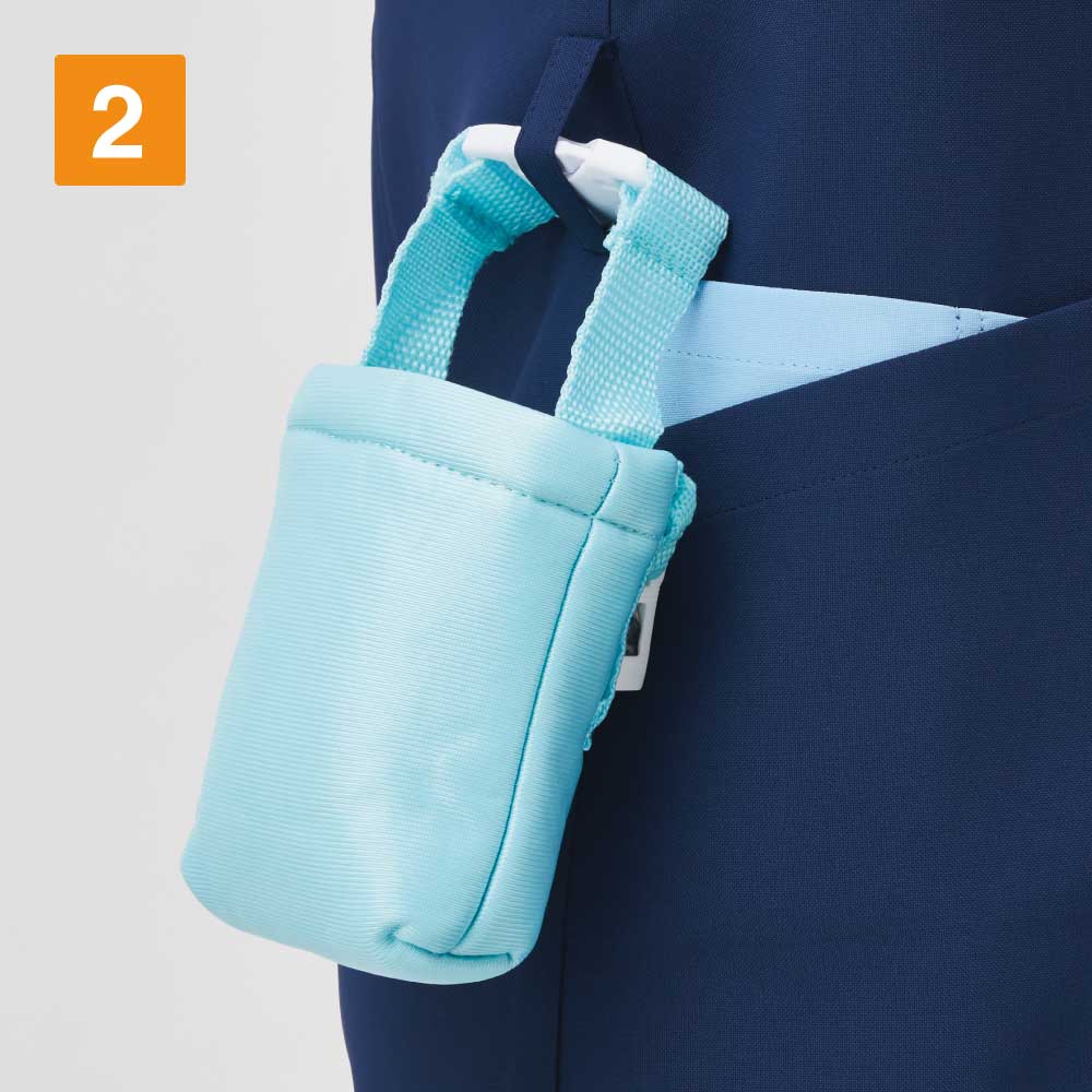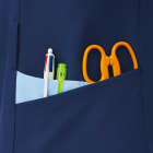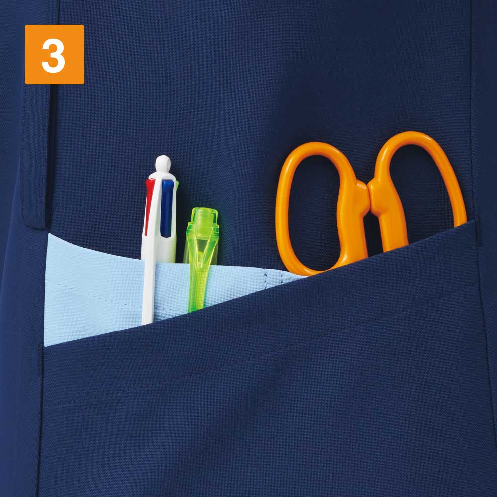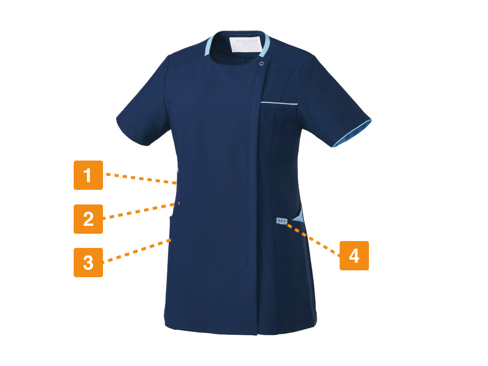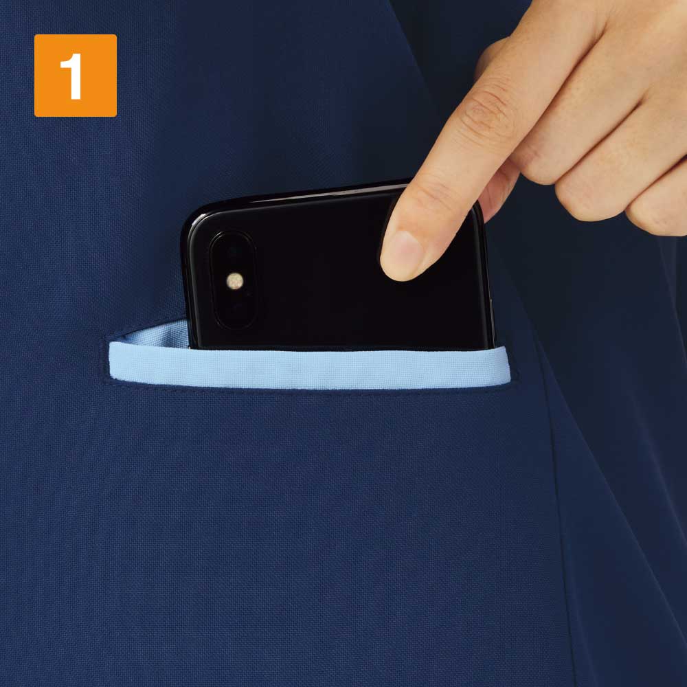 SEK(赤)認証の制菌加工が施されているので、繊維上の細菌の増殖を抑制、清潔感をキープします。制電・透け防止機能・工業洗濯対応の生地を使用しているのもうれしいポイントです。左胸・両脇ポケットのほかに右脇にはスマホも入る大きめのポケットが付いていて収納力も抜群。ウエストループには鍵や消毒液などをかけられます。
