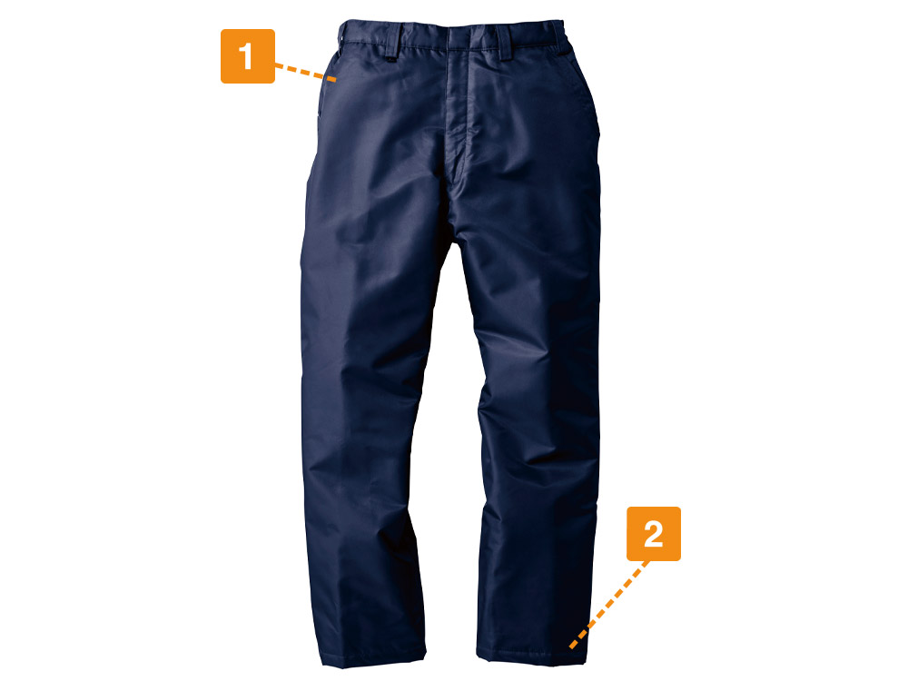 高機能生地が叶える快適作業。冬の過酷な環境下でもストレスを感じないパンツです。撥水加工によって生地が水を弾いて冷たさを感じさせません。さらに耐水圧2000mm・透湿性3000gの高い防水性能が、より強固に水の侵入を防ぎます。また同時に汗による蒸れを外に逃してくれるので、汗で体が冷えることもなく快適です。さらに生地内部には中綿が施されており、いつでも暖かい着心地が続きます。軽量綿なので、重さを感じず体に負担を感じにくいのもポイント。毎日の着用でも疲れにくい仕上がりになっています。