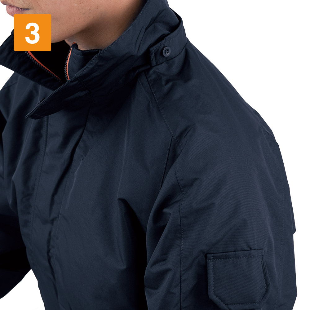 防寒防水性能もさることながら、機能面のデザインが光る一着です。本体の設計ではウエストのシャーリングが体にフィットし、冷気をシャットアウト。ラグラン袖なので腕まわりの動作も軽快です。その他、ステッチやポケットのラインなど、機能美とも言えるデザインで全体をおしゃれにまとめ上げています。またカラーは発色のいいオレンジとベーシックなクロ・コンの3色。どの色も裏地とのコントラストがかっこよく、着るとスタイリッシュに見えるとスタッフの中でも好評でした。
