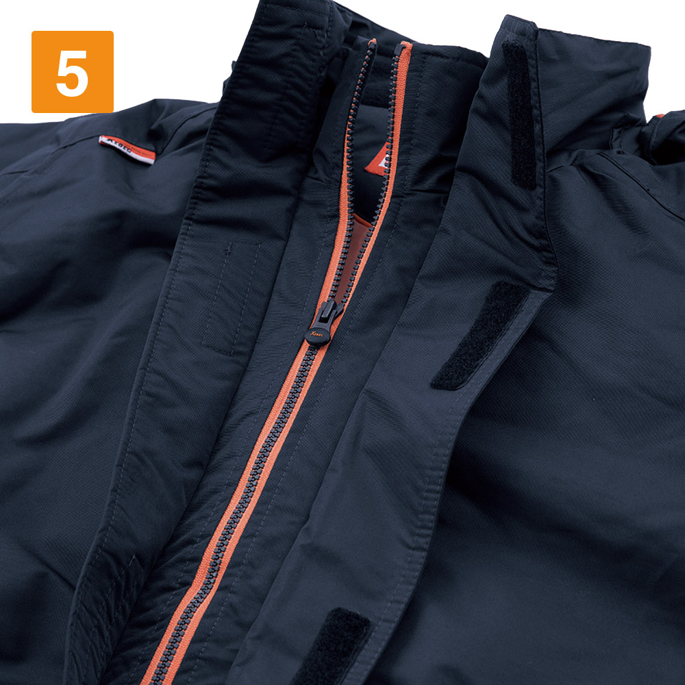 生地に採用されているタッサーは、耐水圧5000mm・透湿性2000gの防水性能と丈夫さ、防風性をあわせ持った堅牢な素材です。さらに撥水加工を施し、水に対する抵抗力をより強化した一着です。また襟まわりにも工夫が施されており、ダブルフロント仕様で雨風を防ぎ、フリース素材を使用することで肌触りも優しく、首まわりに暖かさをもたらします。保温面では、生地内部に中綿を配置。体温を逃さず服内部にとどめてくれます。ヘビーな環境で、いかに快適に過ごせるかを考え抜いたウェアに仕上がっています。