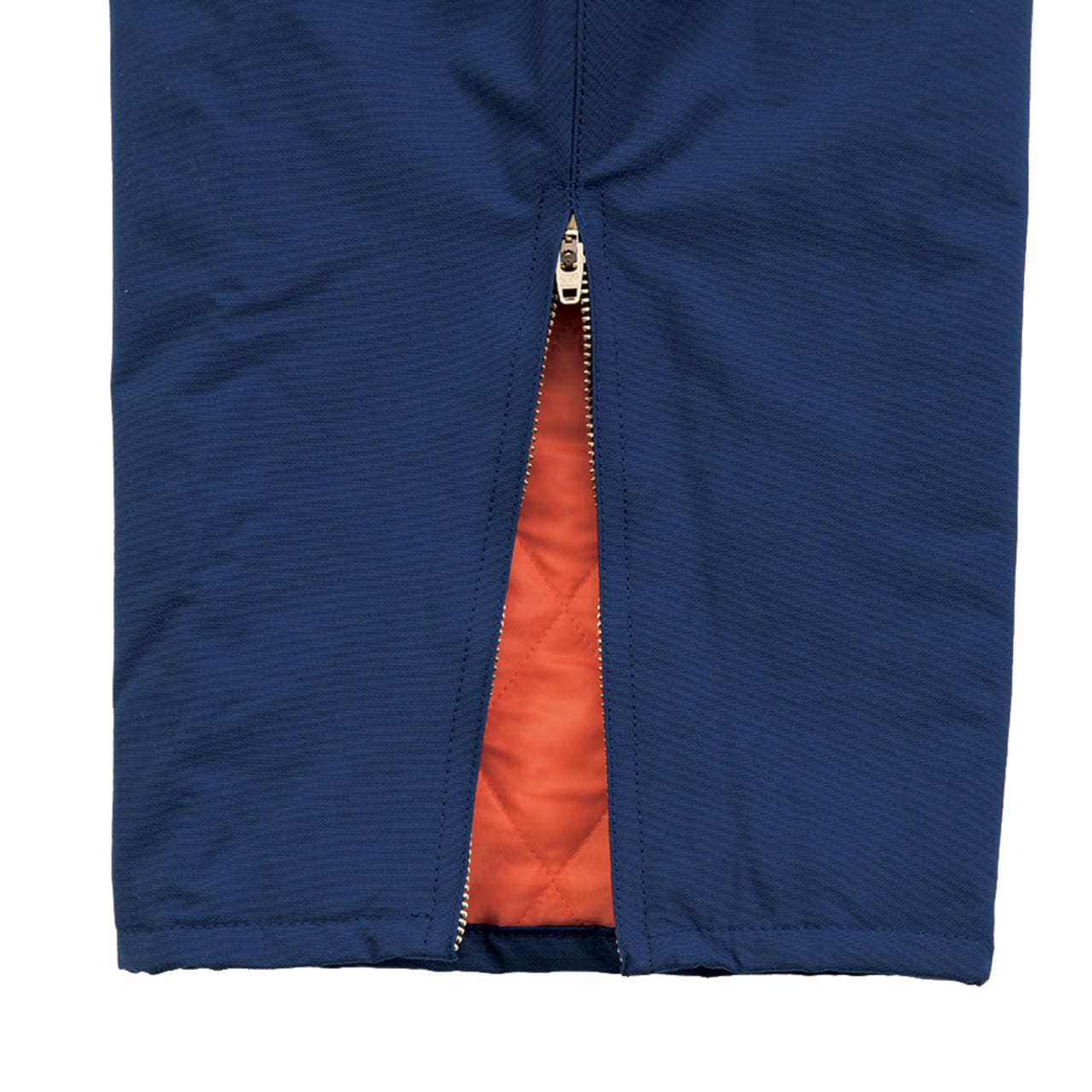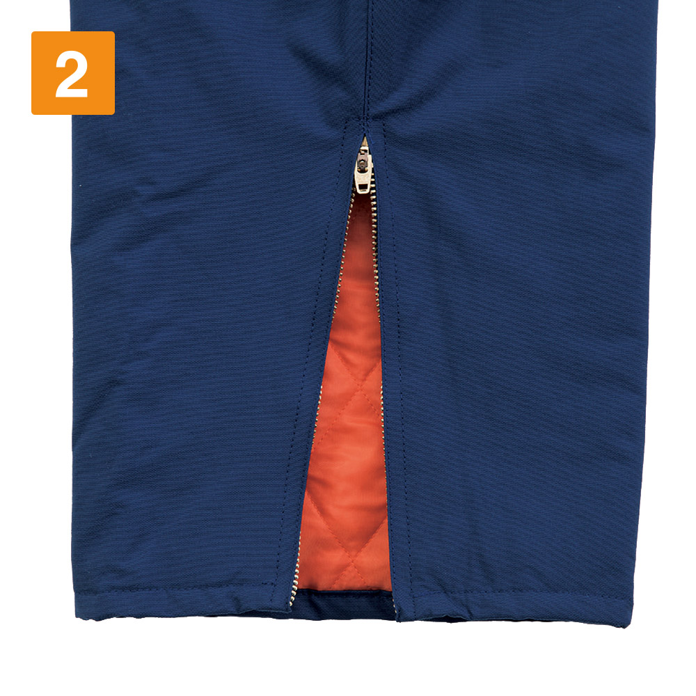 実際に着用してみると、ずっしりとした重さがなく、軽やかな履き心地がとても楽に感じます。裏地のワッフルライナーの凹凸が暖かい空気を捉えるので、中綿なしでも充分なぬくもりを感じられるパンツです。またスタッフの中で大注目だったのがその裾のデザイン。ふくらはぎから裾に向かって閉じていくファスナーでお好みのフィット感に調整可能です。ファスナーを開けると裏地のアクセントカラーがちらりと見えるので、おしゃれなアクセントにもなっています。