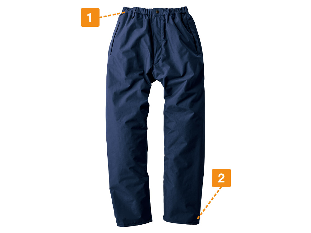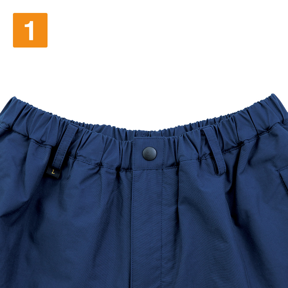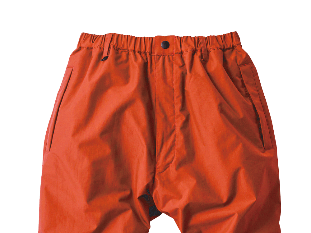 本体に使用されているタッサーは耐水圧3000mm・透湿性5000gの防水性能を持つ高機能生地。水が生地内部に染み込まず、服内部の湿気を常時排出してくれるので、からりとした着用感が続きます。下半身の汗や蒸れで不快な思いをしないので、アクティブに体を動かす作業にとてもおすすめです。ウエストにはシャーリングが施されており、やさしく体にフィット。隙間からの冷気や水の侵入をしっかり防ぎ、一日中快適な着用感が続くパンツに仕上がっています。